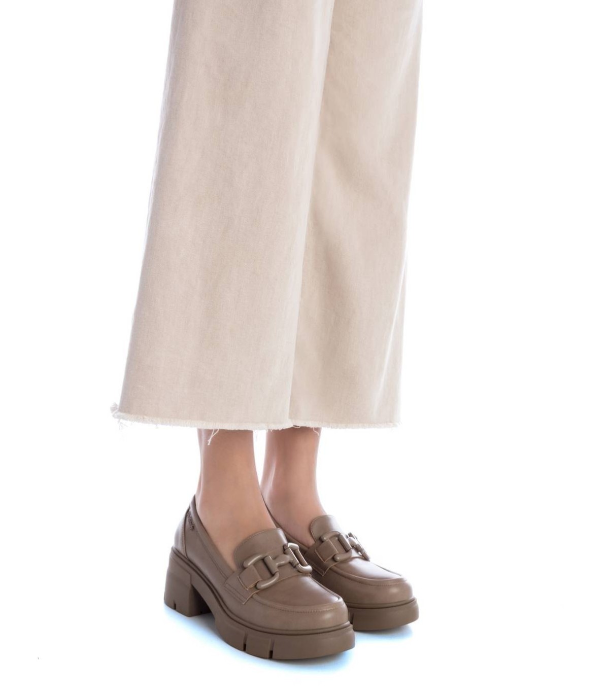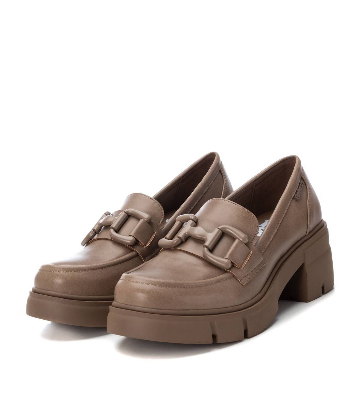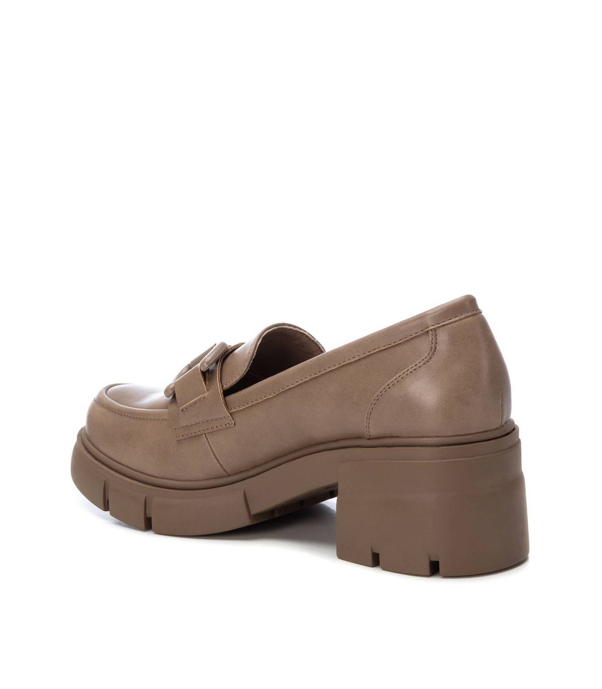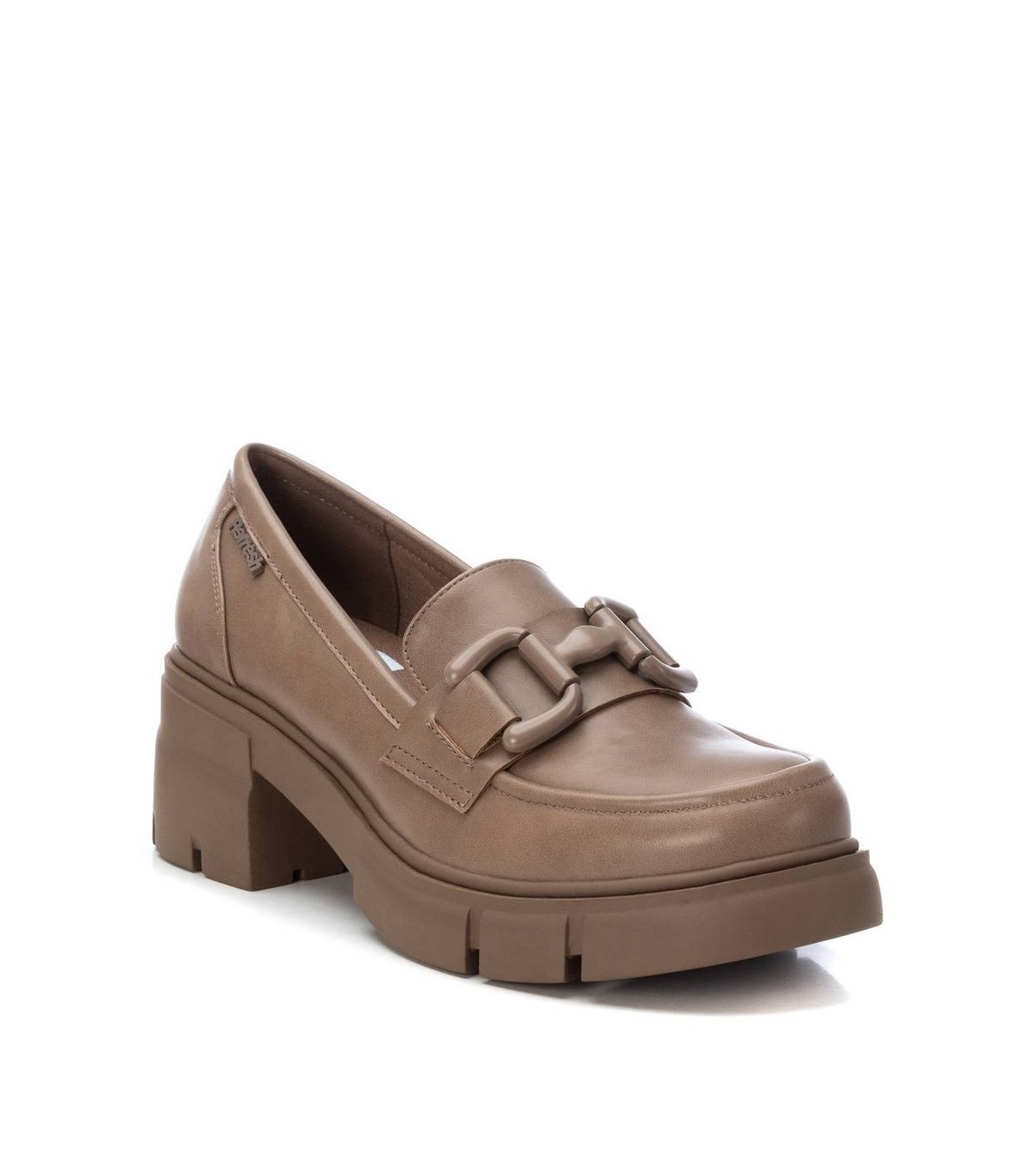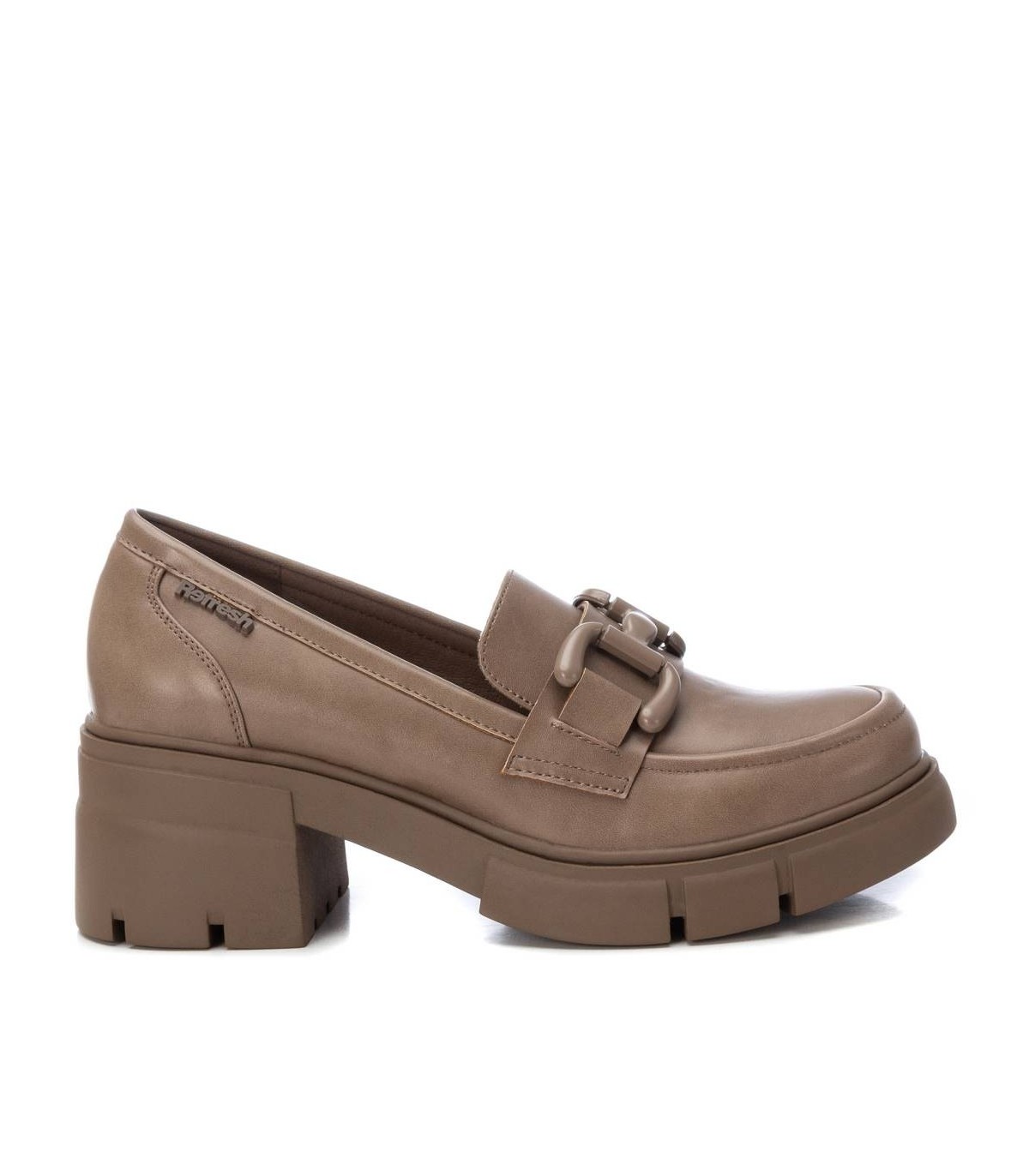 Mocasín de mujer, de la marca Refresh. Fabricado en material que imita la piel. Detalle metálico en el frente al tono del modelo. Tacón ancho de 6 cm suela de goma antideslizante. Este modelo ha obtenido el certificado vegano por la organización mundial PETA (Organización de los derechos de los animales).