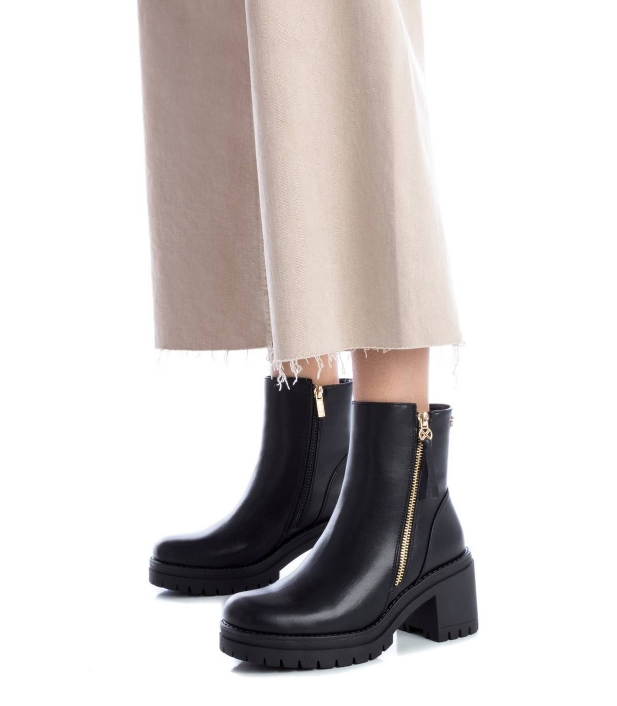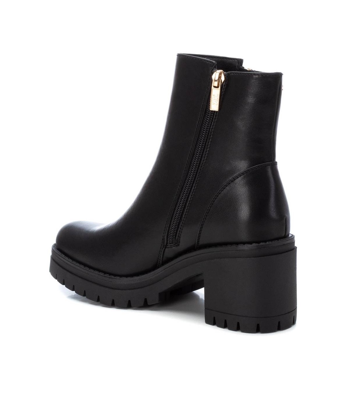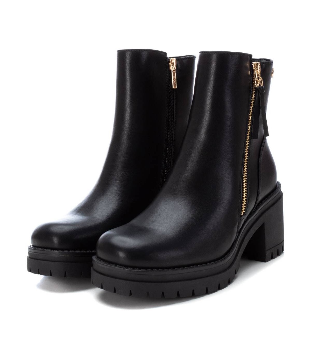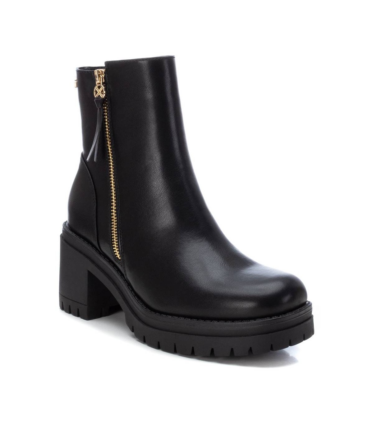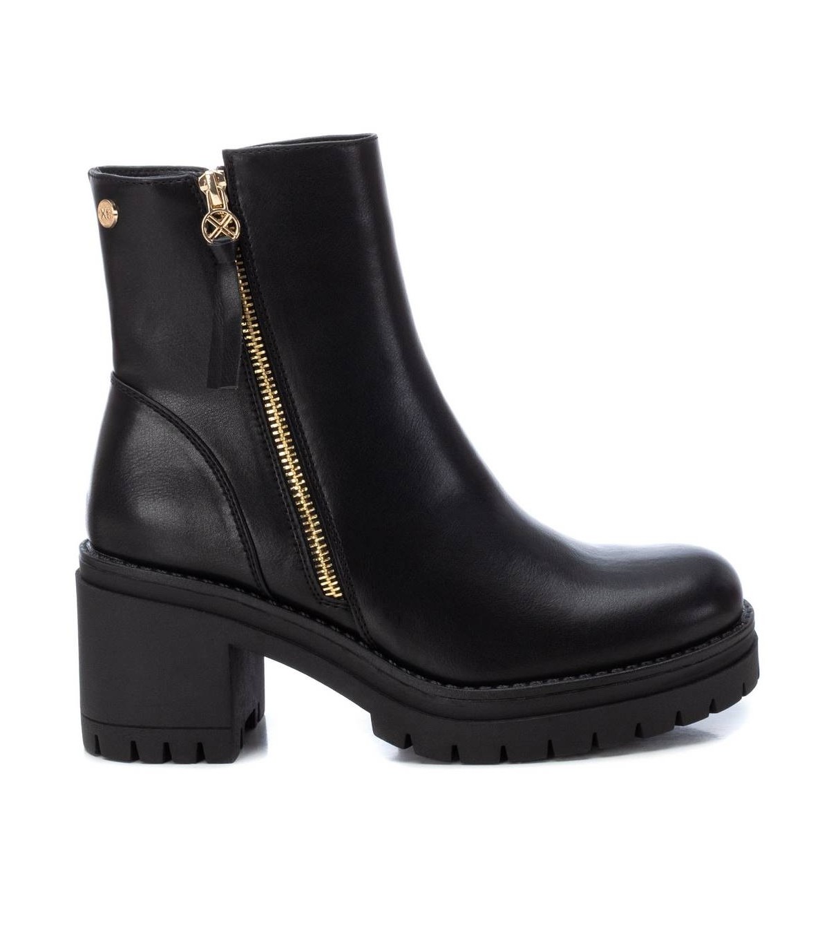 Botín de mujer, de la marca Xti. Fabricado en material que imita la piel. Cierre mediante cremallera lateral interior. Detalle de cremallera decorativa en el lateral exterior. Tacón de 7cm con plataforma delantera. Suela dentada de goma antideslizante. Este modelo ha obtenido el certificado vegano por la organización mundial PETA (Organización de los derechos de los animales).