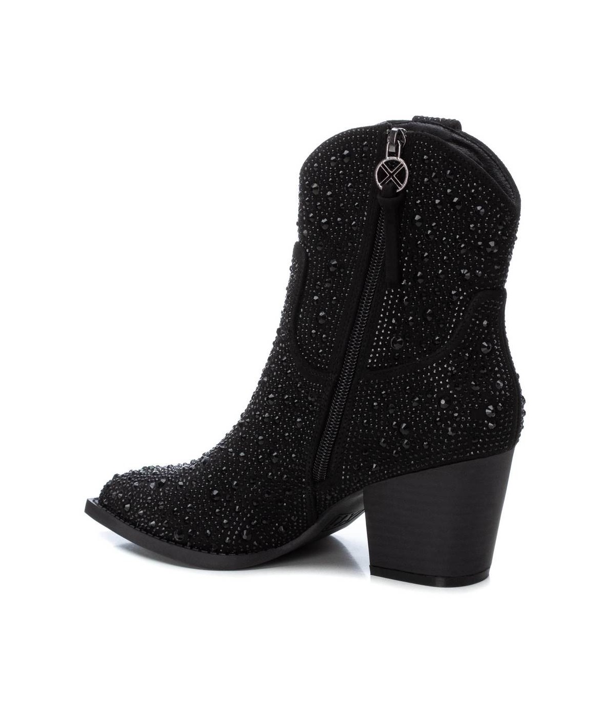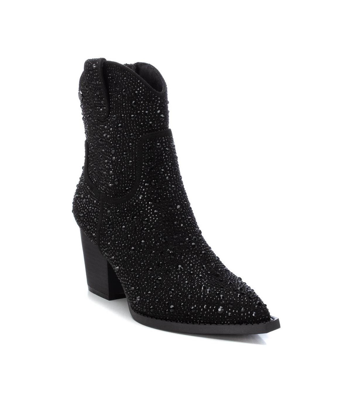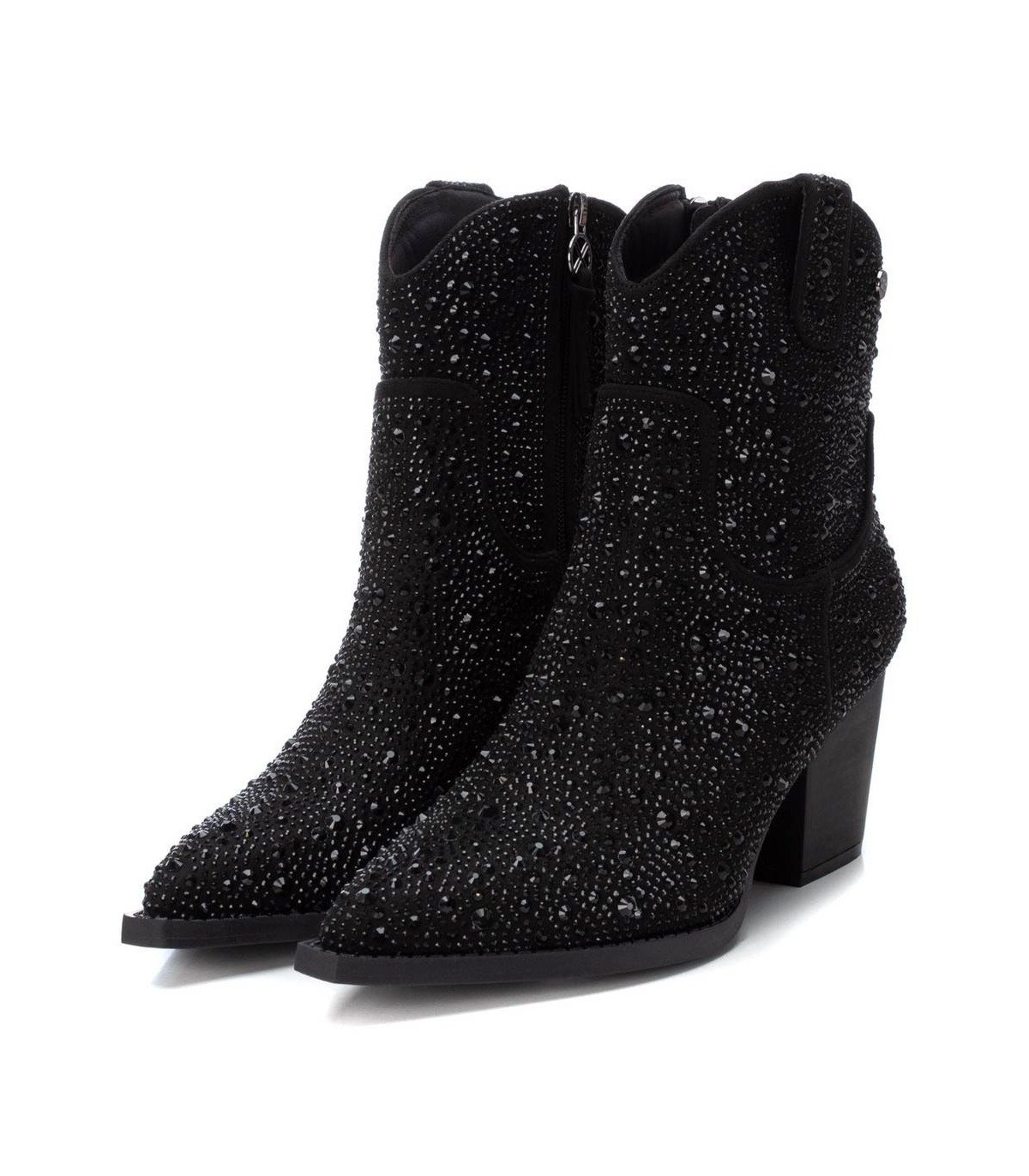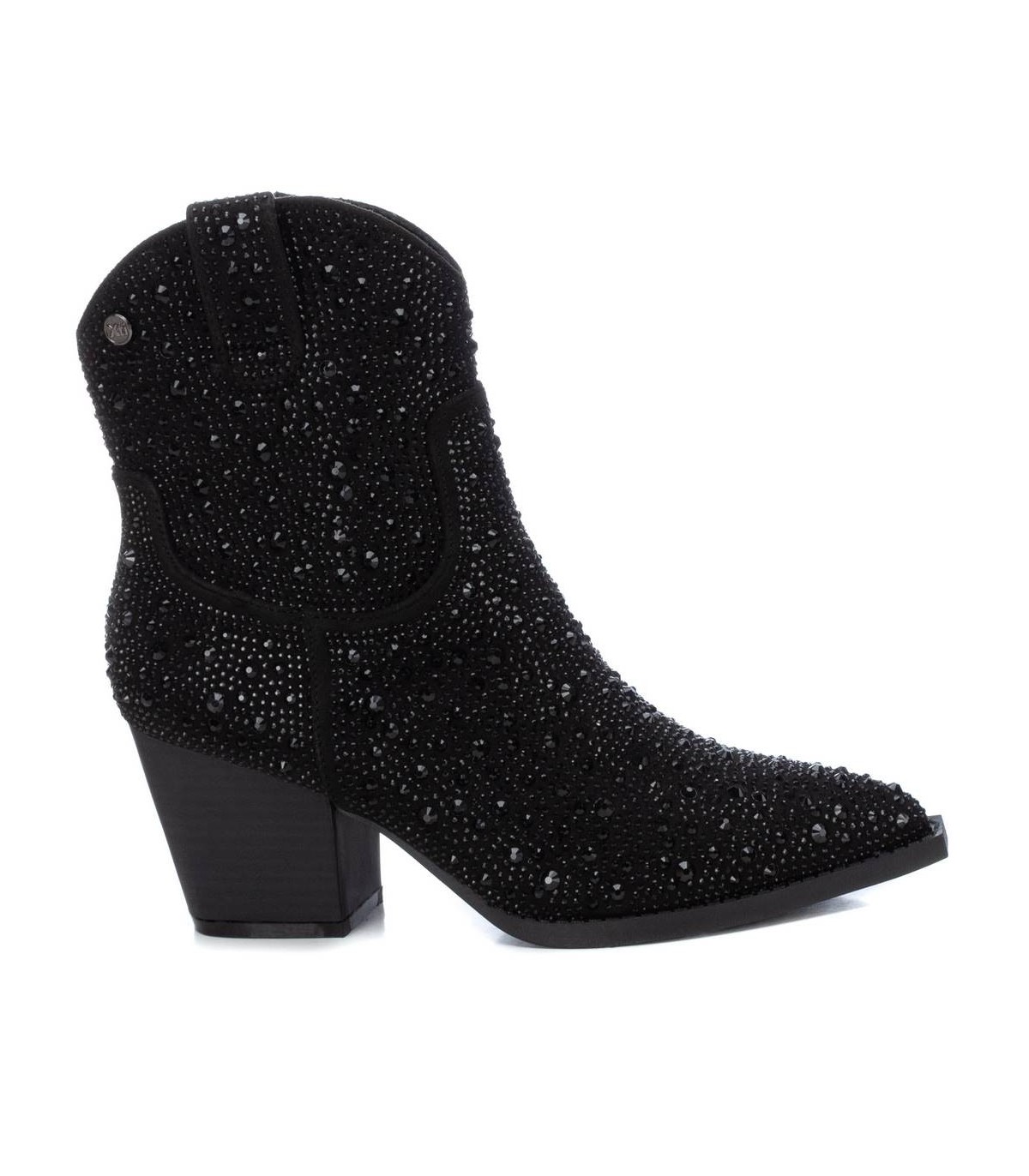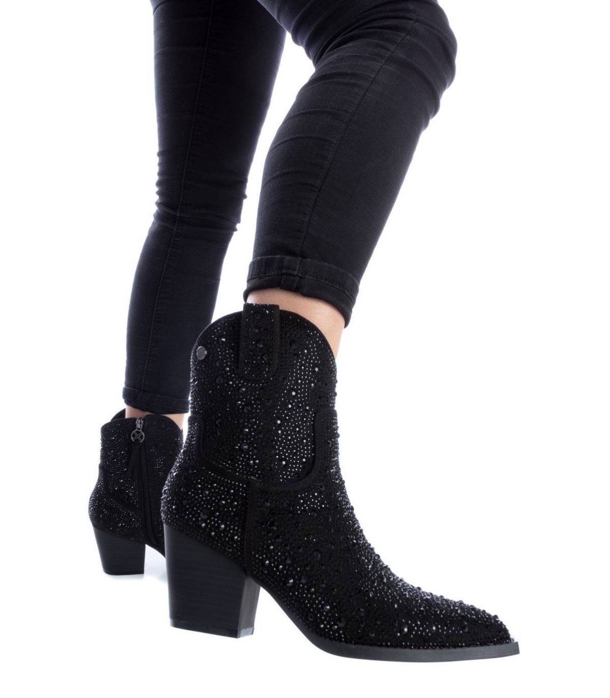Botín cowboy de mujer, de la marca Xti. Fabricado en antelina con piedras decorativas de fantasía. Cremallera lateral. Tacón de 7cm y suela antideslizante. Con este modelo arrasarás esta temporada. Este modelo ha obtenido el certificado vegano por la organización mundial PETA (Organización de los derechos de los animales).