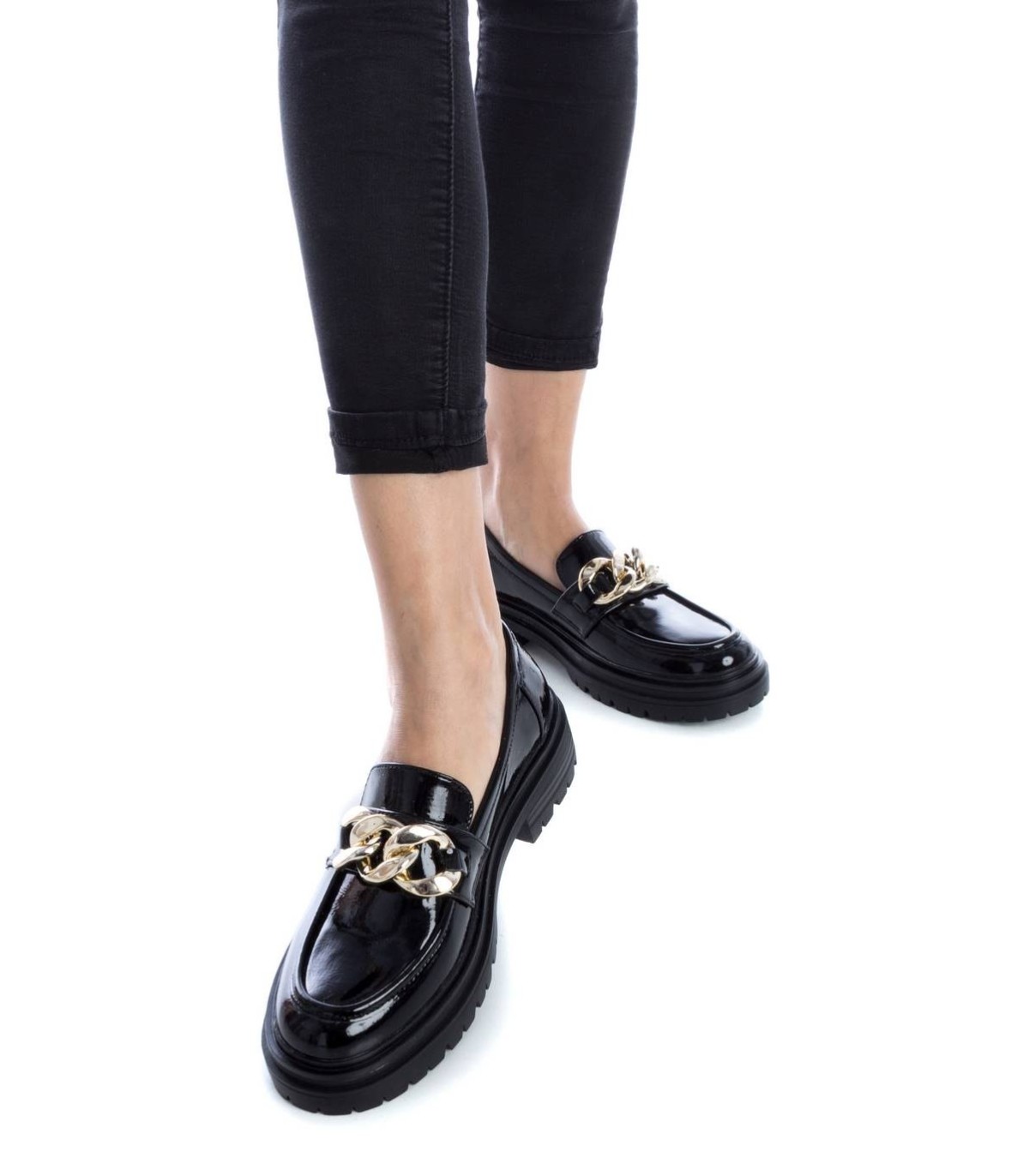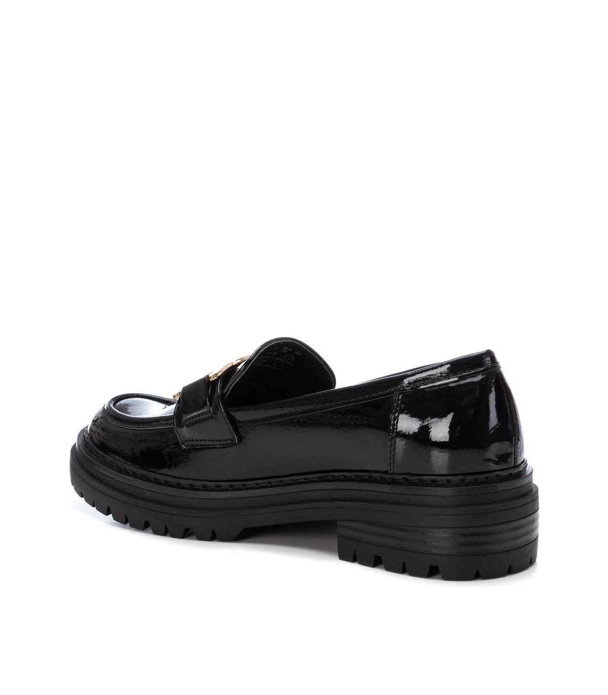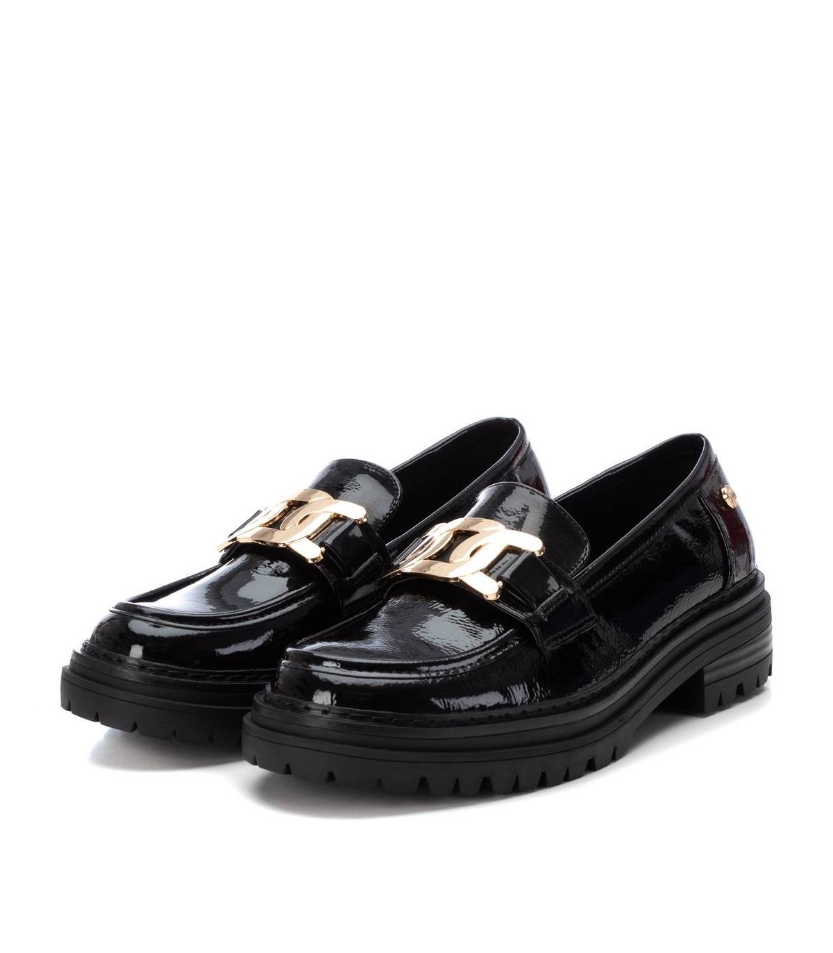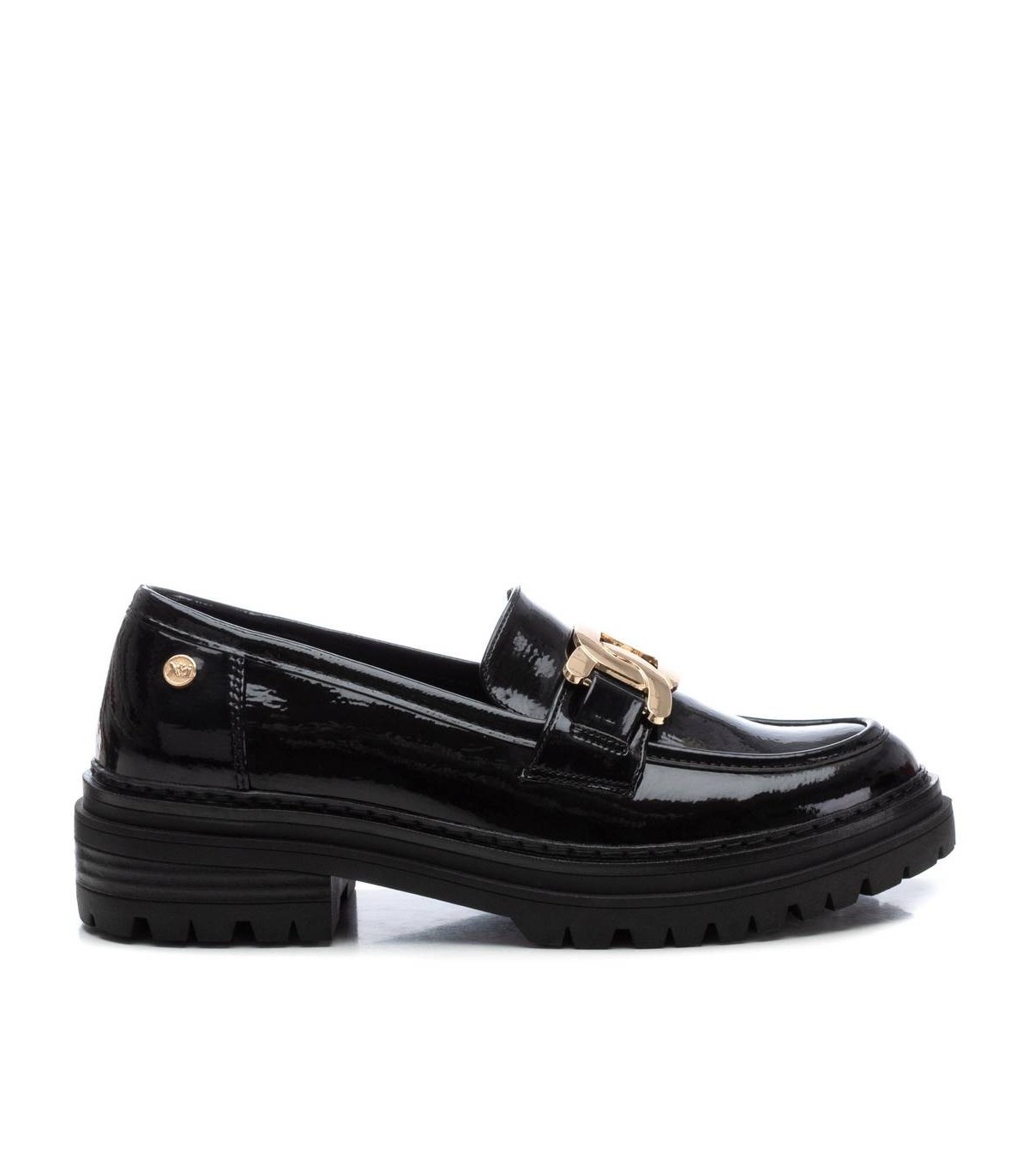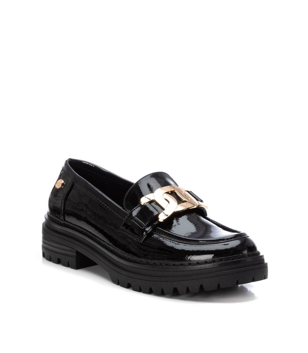 Mocasín de mujer, de la marca Xti. Fabricado en material que imita la piel. Detalle de cadena dorada en el frente. Suela de goma antideslizante. Este modelo ha obtenido el certificado vegano por la organización mundial PETA (Organización de los derechos de los animales).