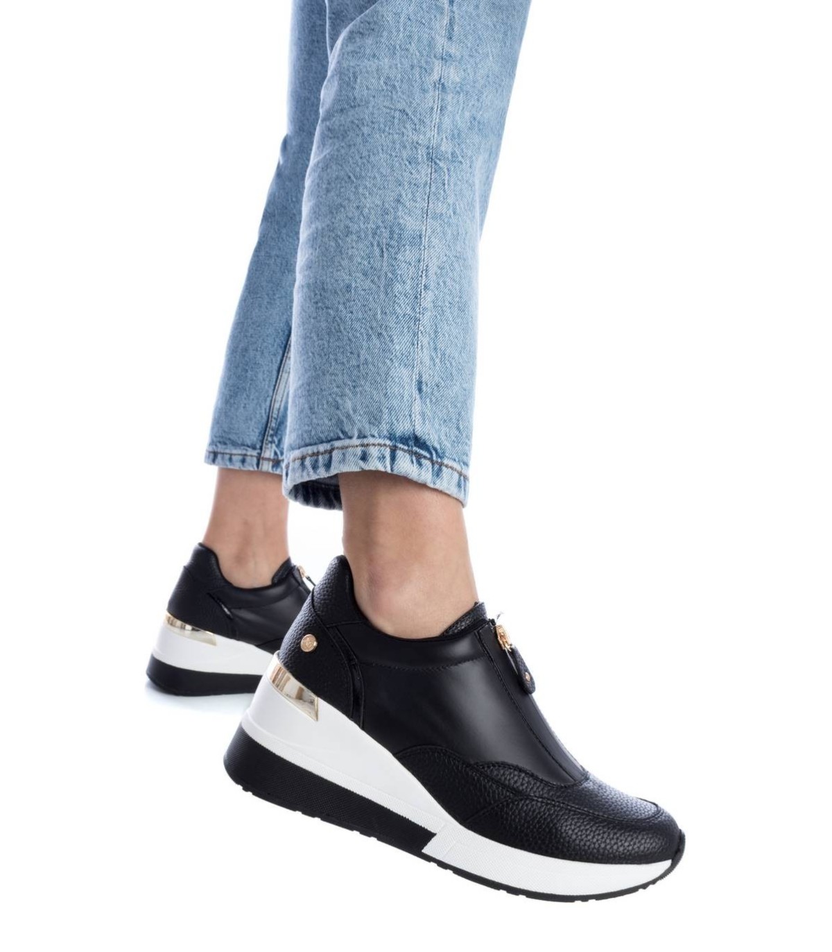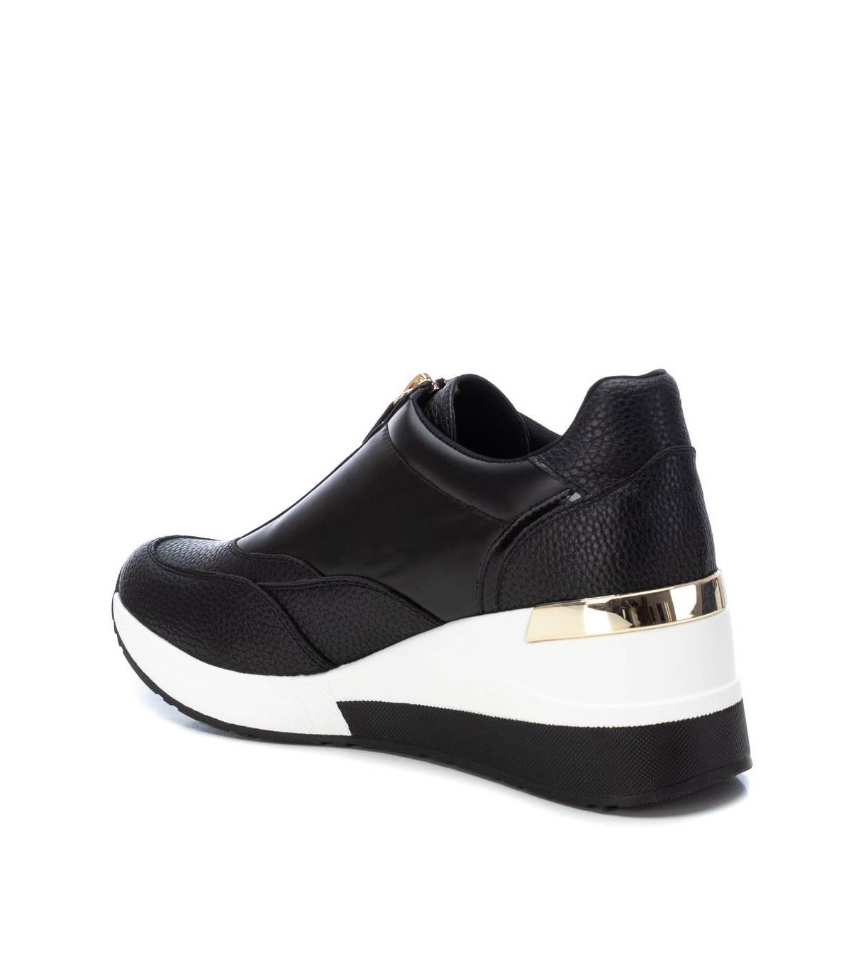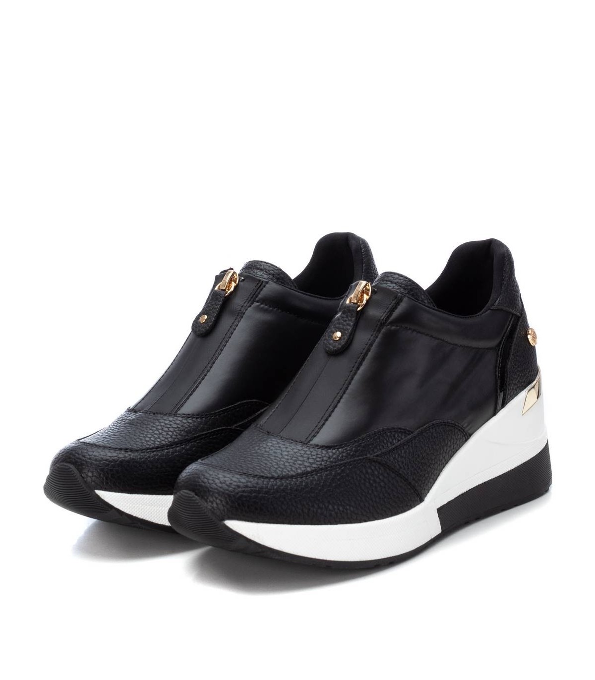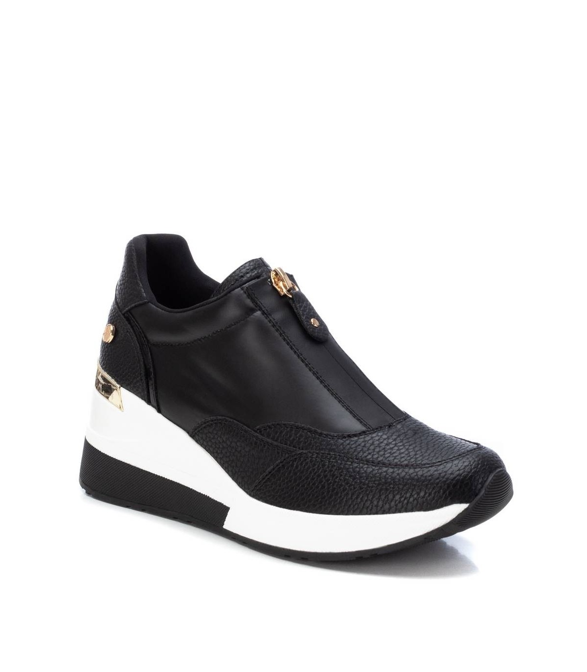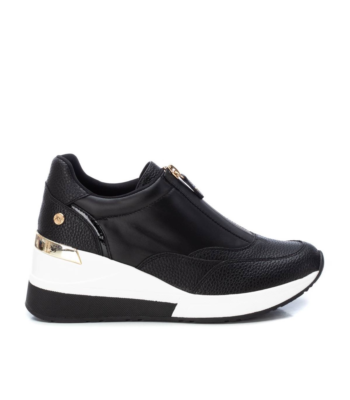 Zapatilla de mujer, de la marca Xti. Fabricada en material que imita la piel combinado con nylon metalizado. Cremallera delantera. Estiliza tus looks casuales con esta cuña de 6 cm. Suela de goma antideslizante. Este modelo ha obtenido el certificado vegano por la organización mundial PETA (Organización de los derechos de los animales).