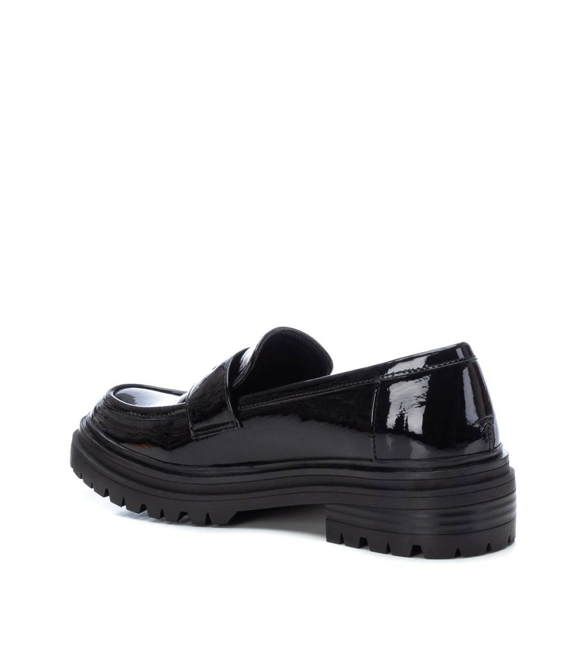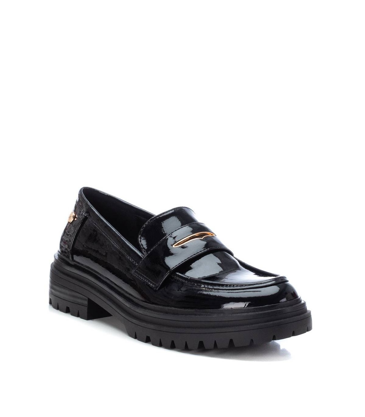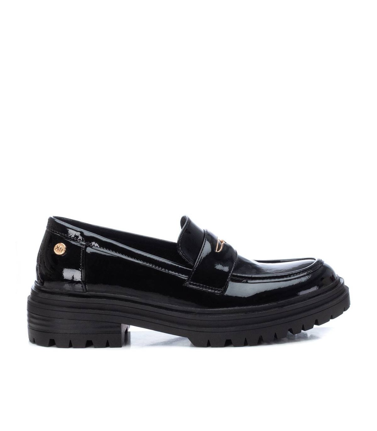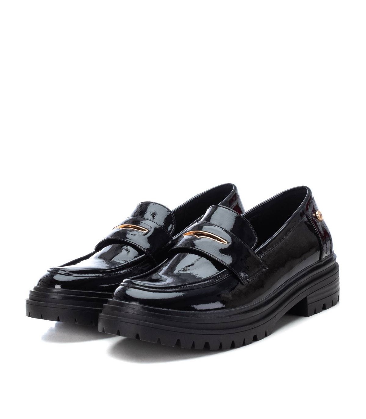 Mocasín de mujer, de la marca Xti. Fabricado en charol. Detalle de antifaz clásico con adorno metalizado para un toque más sofisticado. Suela gruesa de goma antideslizante. Este modelo ha obtenido el certificado vegano por la organización mundial PETA (Organización de los derechos de los animales).