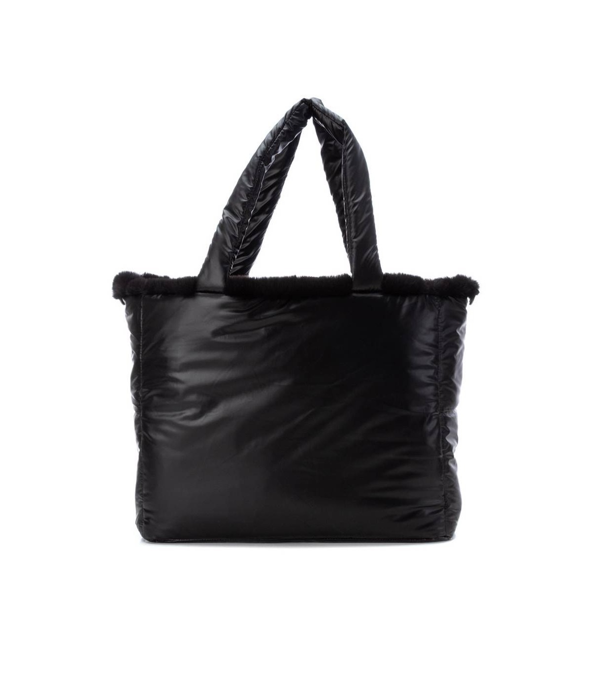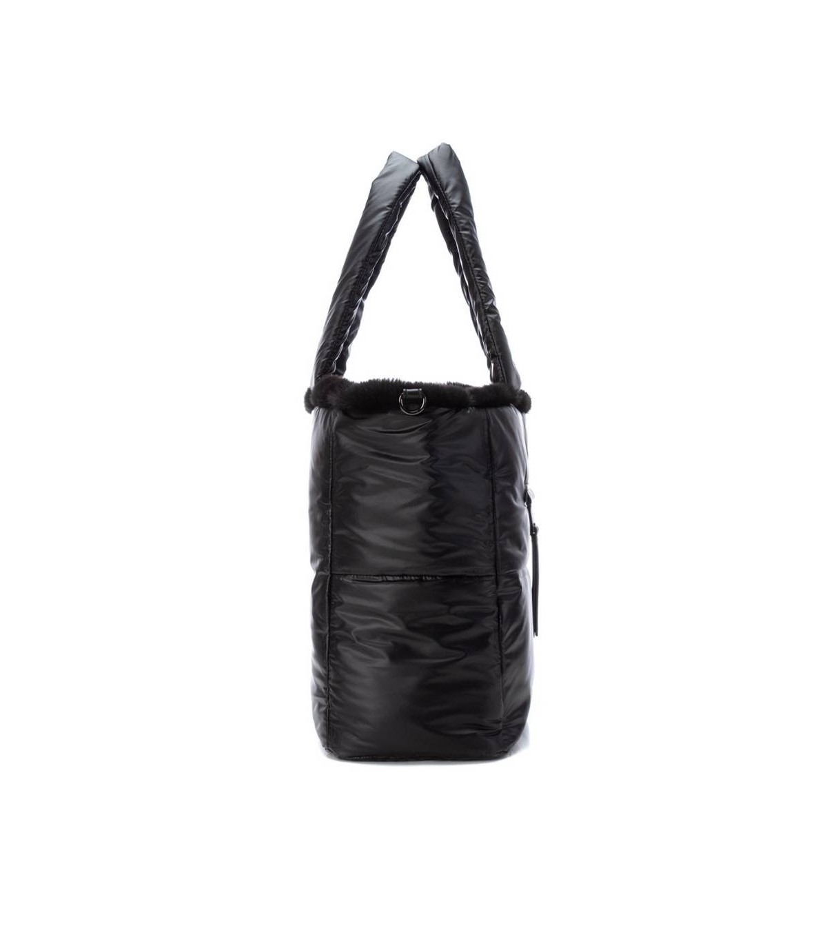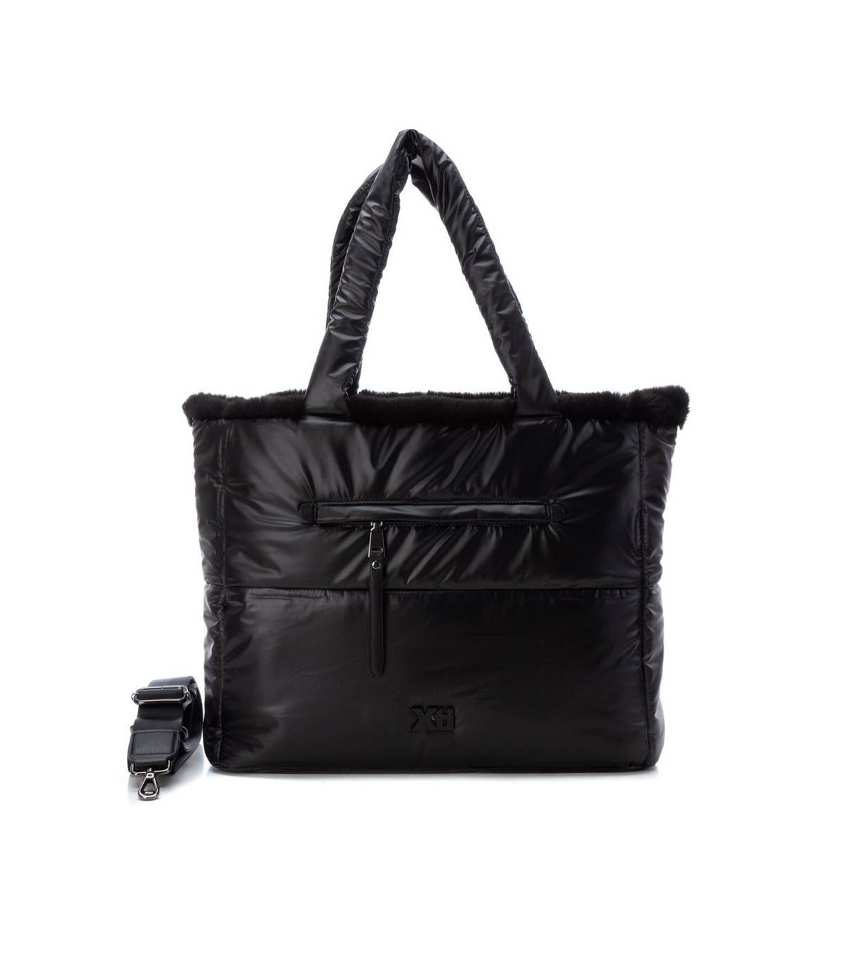 Bolso tote de mujer, de la marca Xti. Fabricado en nylon metalizado. Bolso de hombro reversible con interior de peluche. Asa corta para llevarlo al hombro y asa larga regulable opcional. 2 bolsillos. Medidas: 31 x 48 x 16 cm. Este modelo ha obtenido el certificado vegano por la organización mundial PETA (Organización de los derechos de los animales).