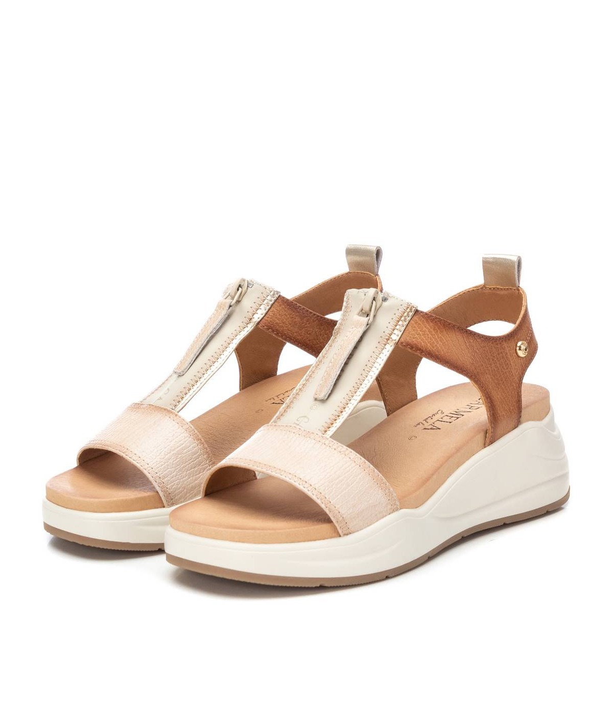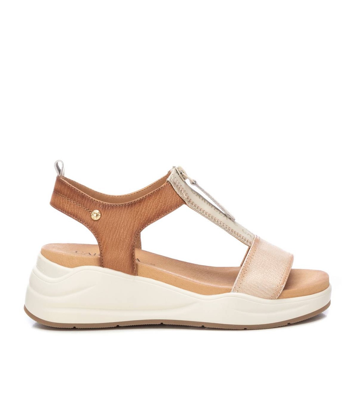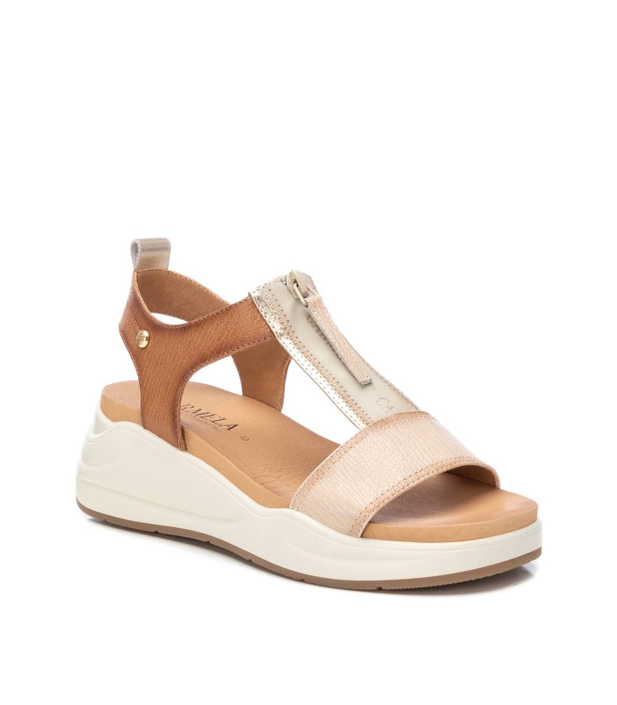 Sandalia de mujer, de la marca Carmela. Fabricada en piel de alta calidad. Diseño de T con cierre mediante cremallera frontal. Cómoda suela de goma antideslizante.