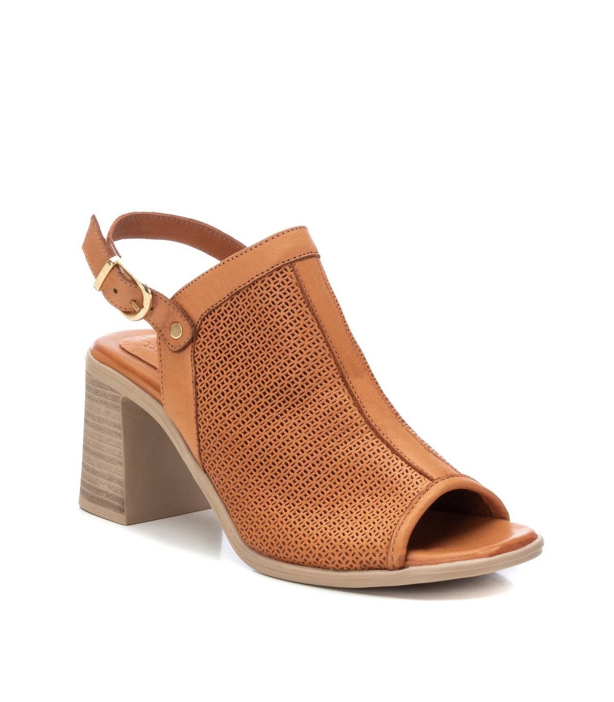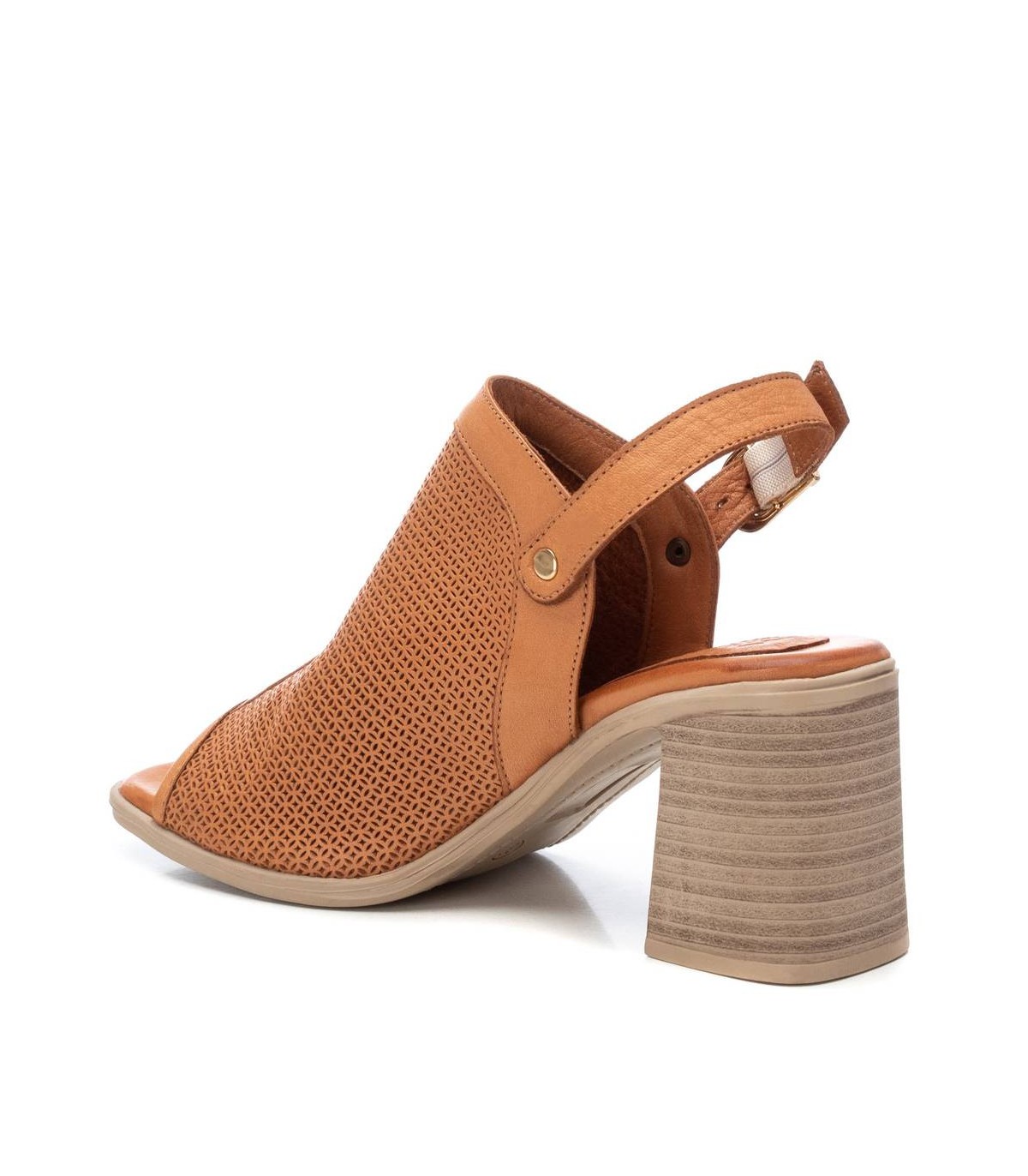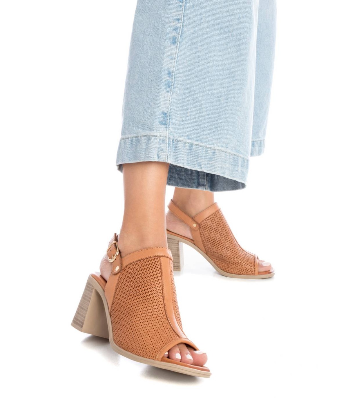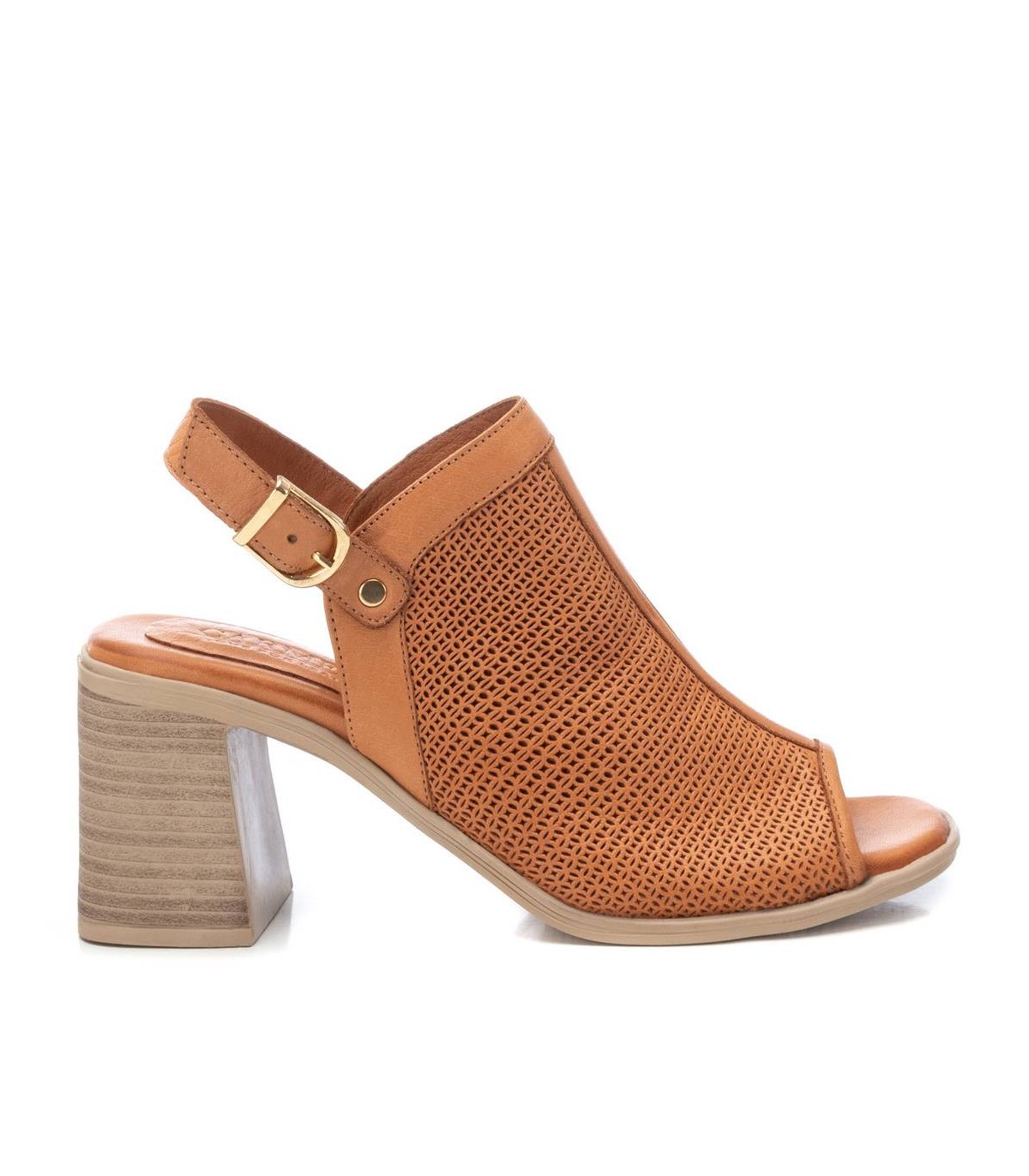 Sandalia de mujer, de la marca Carmela. Fabricada en piel de alta calidad decorada con un diseño picado. Modelo estilo botín en el frente y sujeción con correa de hebilla por detrás. Tacón ancho de 8 cm y suela de goma antideslizante.