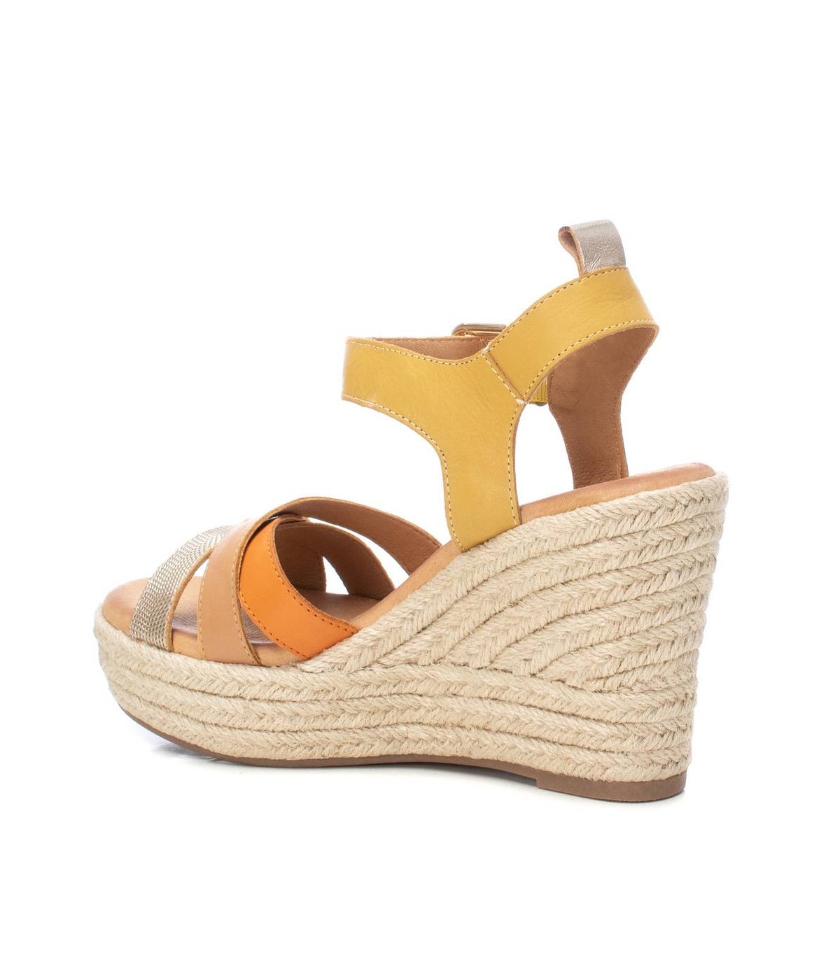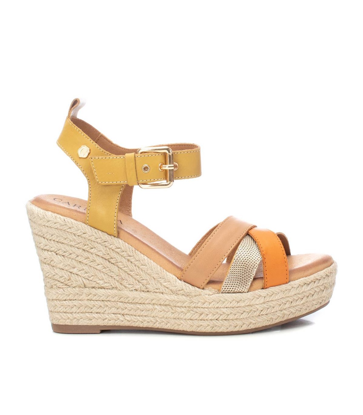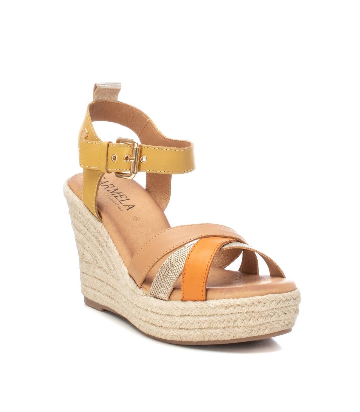Sandalia de mujer, de la marca Carmela. Fabricada en piel de alta calidad. Modelo tiras cruzadas con cómoda cuña de 10 cm con plataforma. Con pulsera al tobillo mediante hebilla metálica. Suela de goma antideslizante.