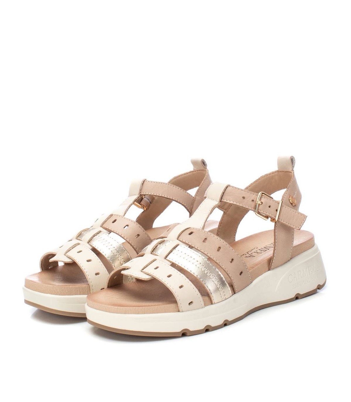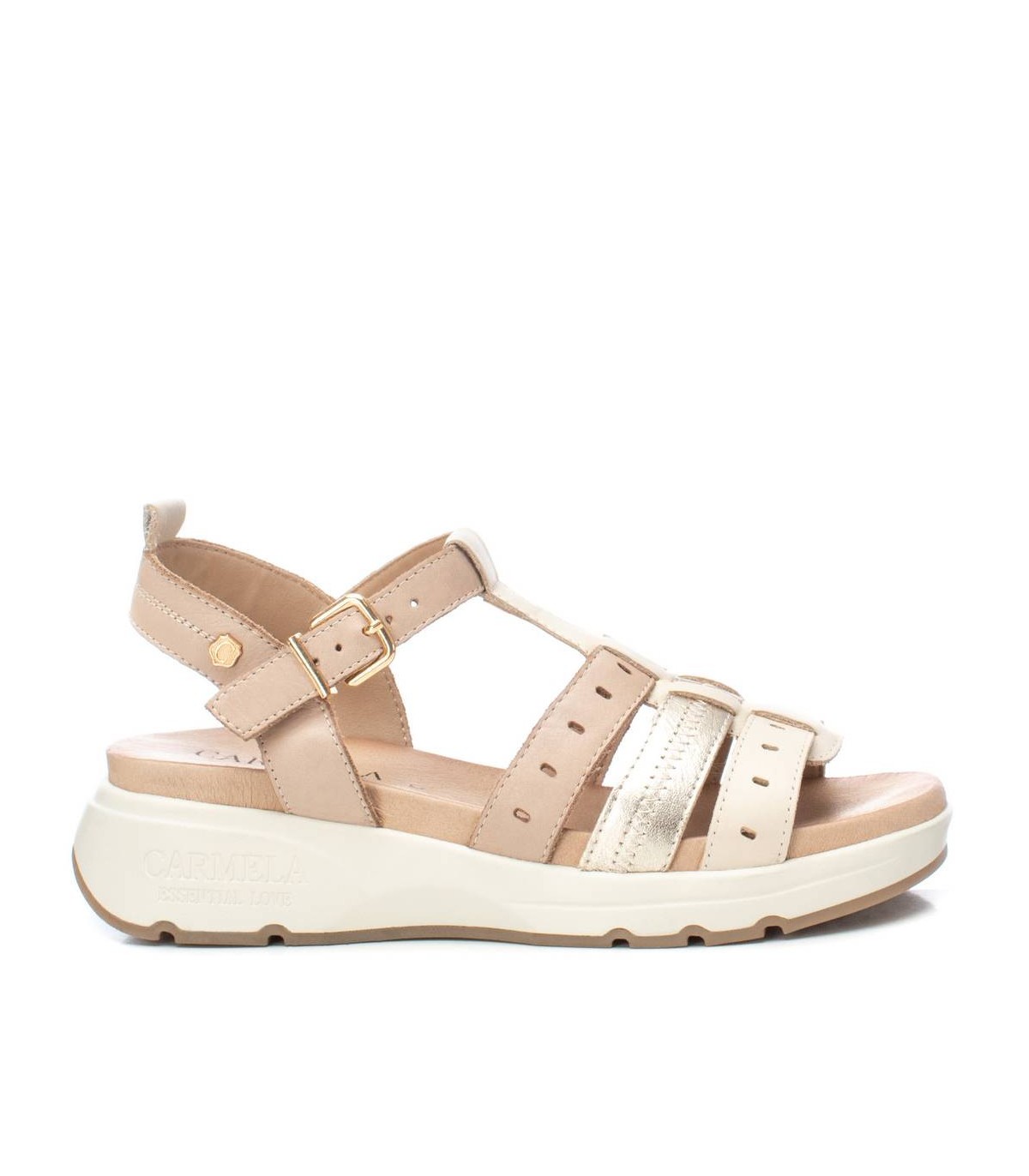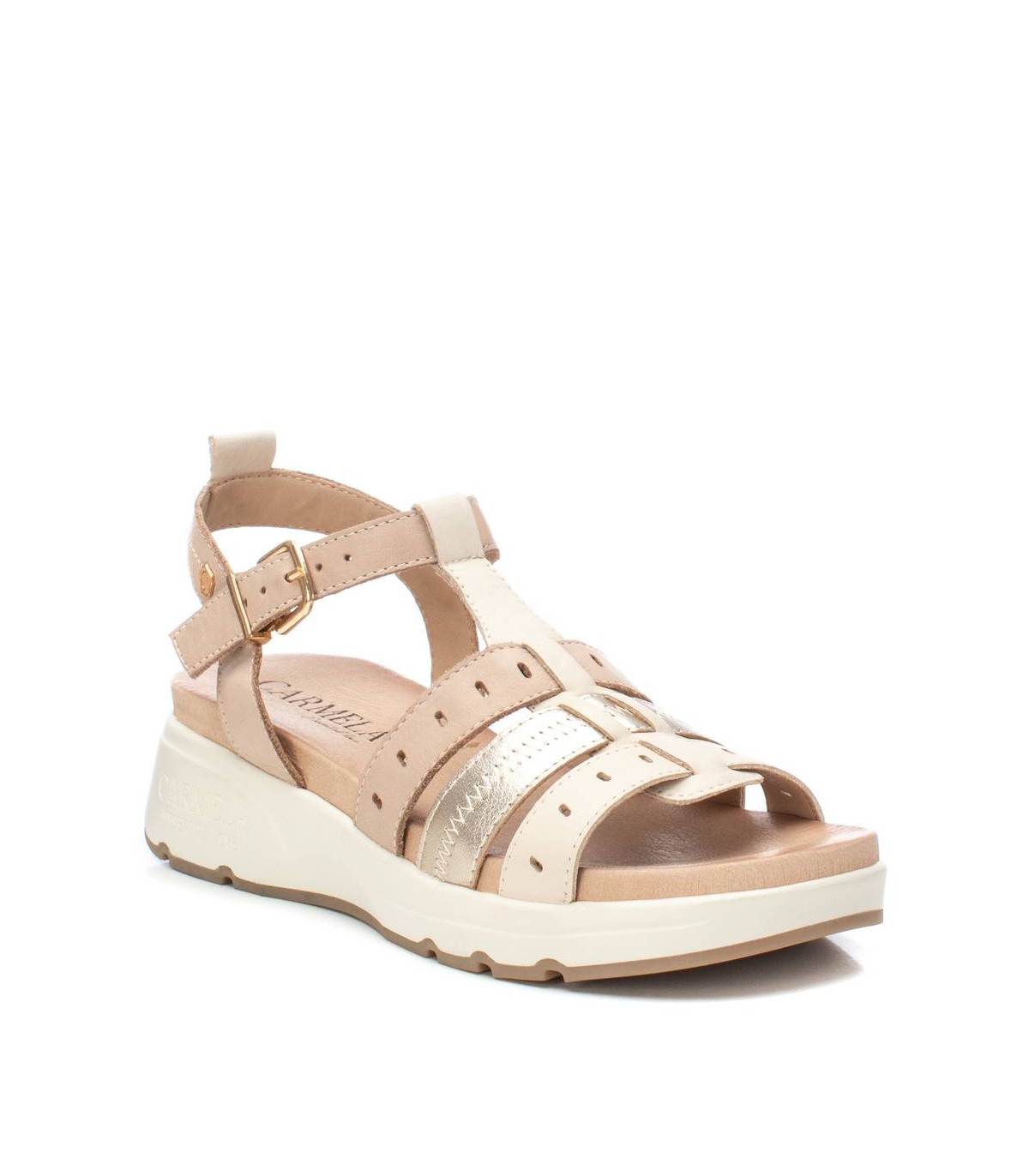 Sandalia de mujer de la marca Carmela. Fabricada en piel de calidad. Modelo de tiras troqueladas combinadas con acabado metalizado. Ideal para ir cómoda y estilosa este verano. Cierre mediante hebilla y tirador trasero.