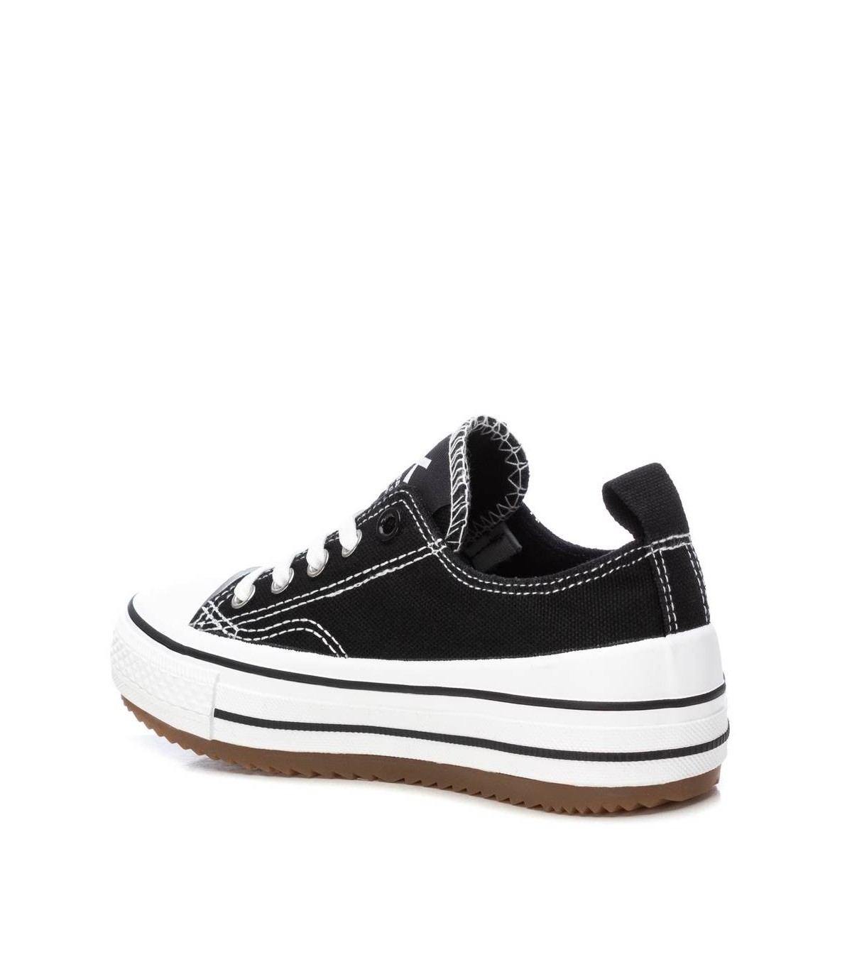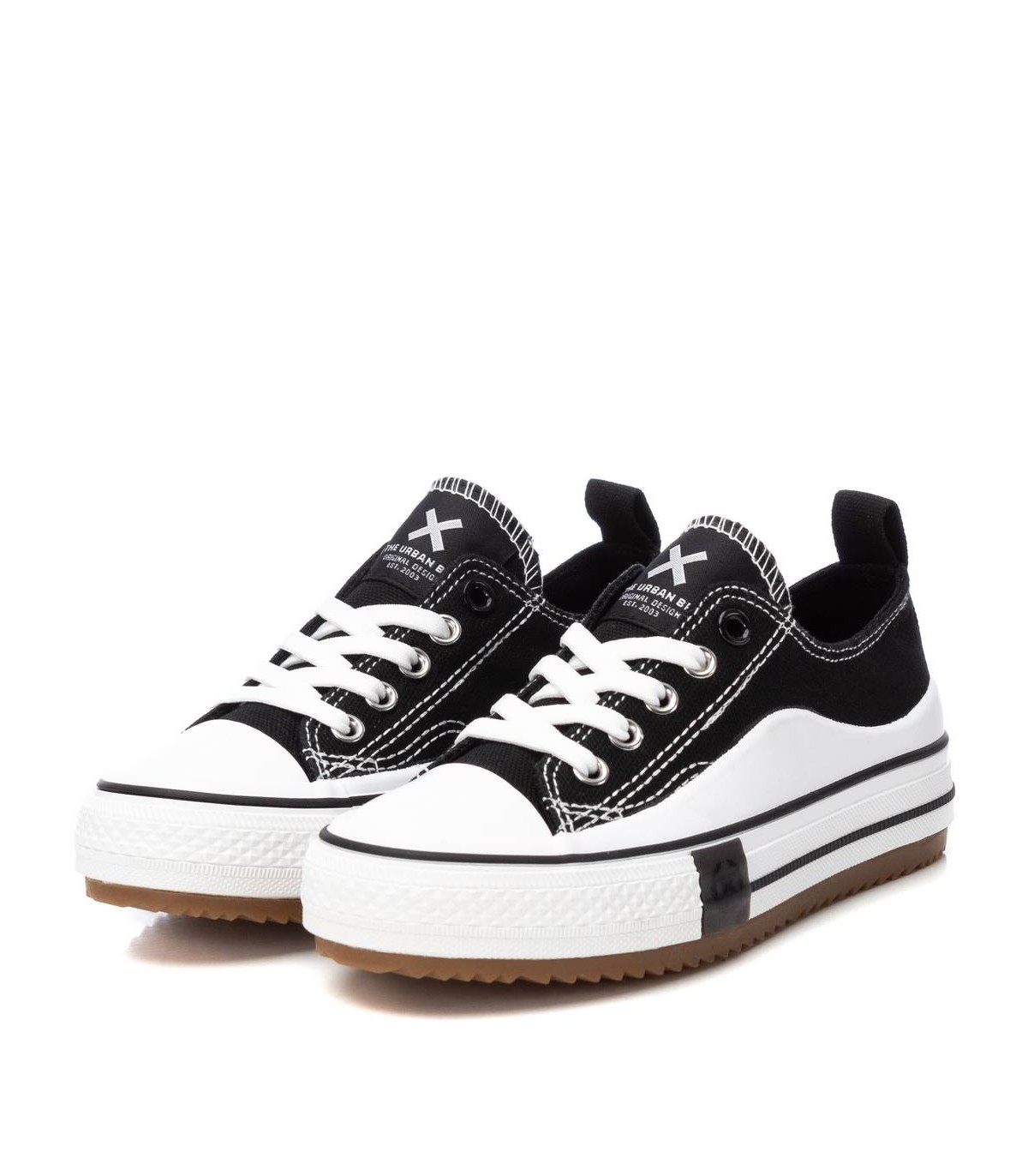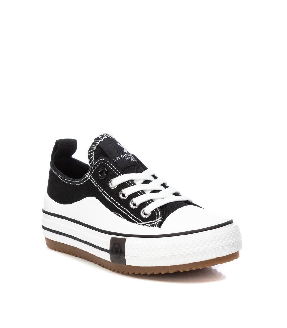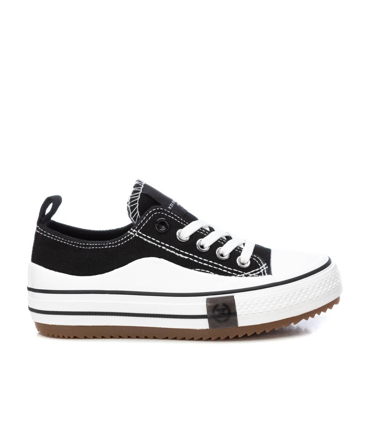 Zapatilla de niña, de la marca Xti kids. Fabricada en resistente lona. Cordones elásticos con tirador trasero para facilitar la puesta. Suela de goma antideslizante. Este modelo ha obtenido el certificado vegano por la organización mundial PETA (Organización de los derechos de los animales).