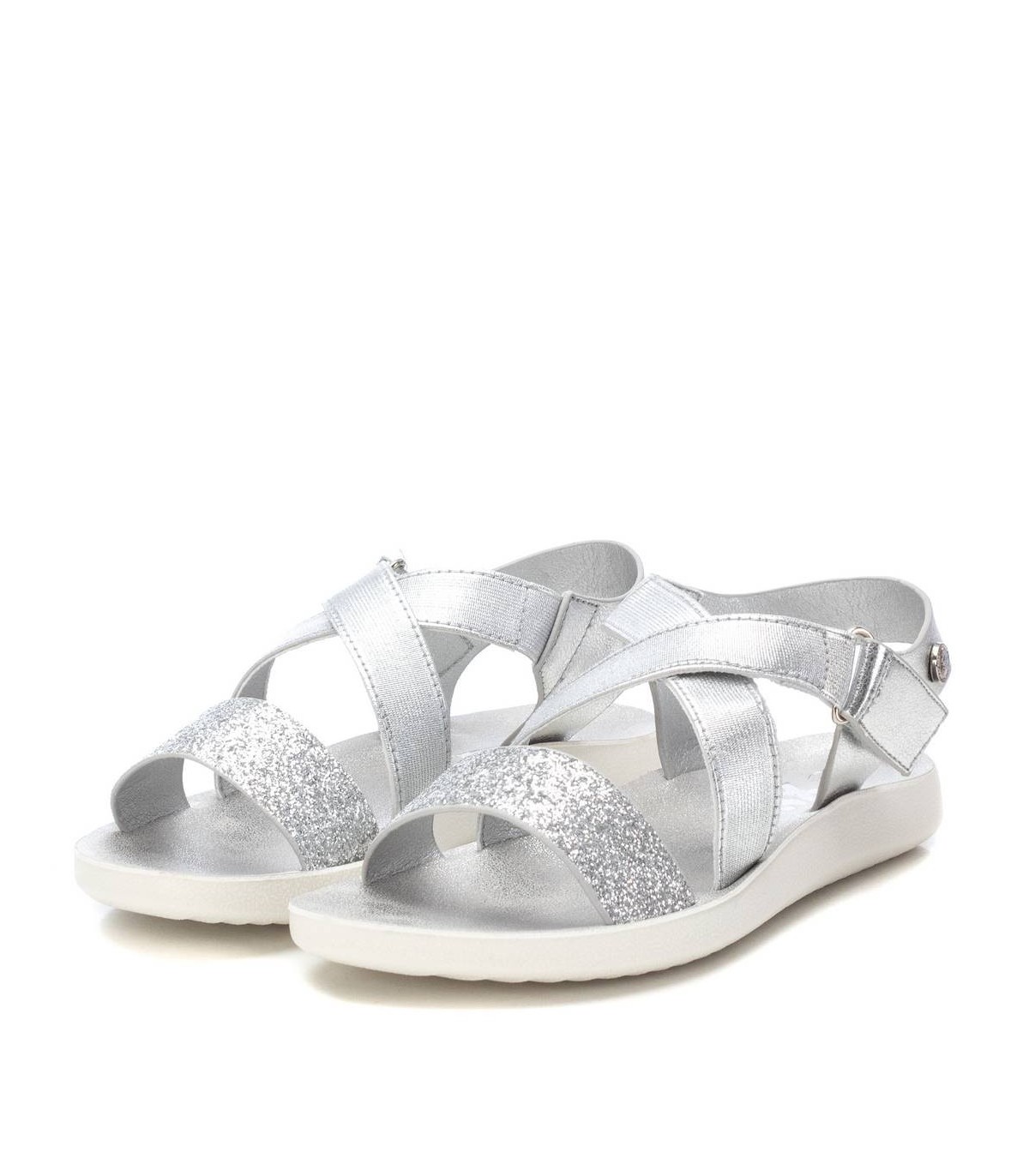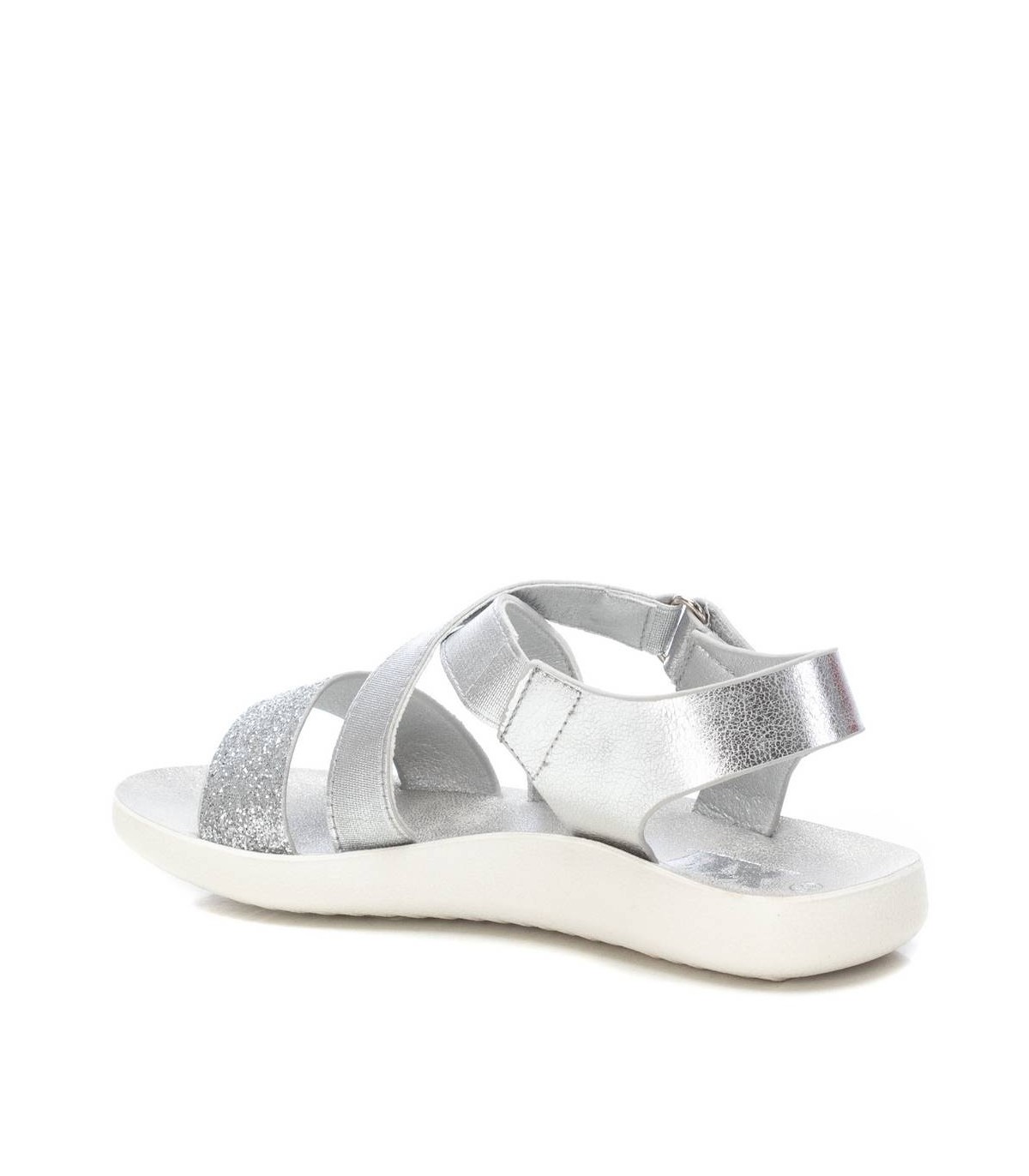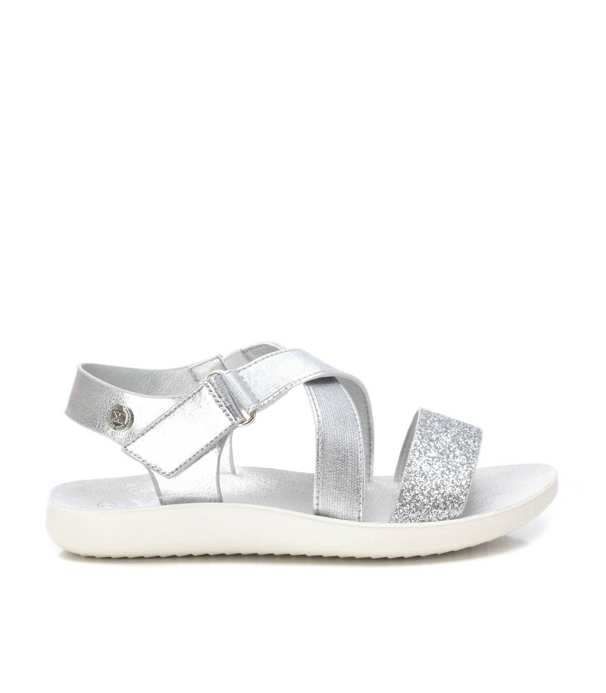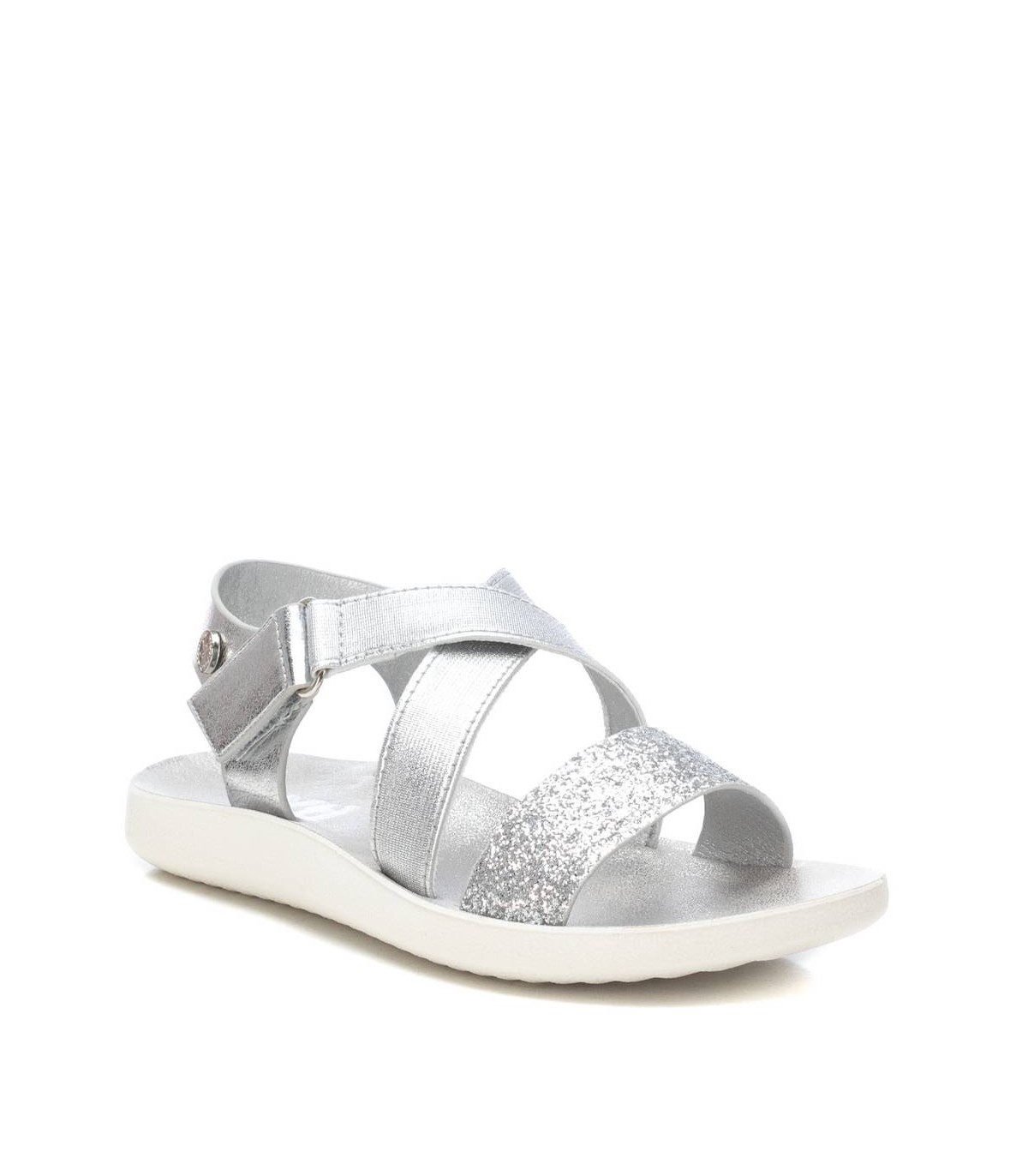 Sandalia de niña, de la marca Xti Kids. Fabricada en material que imita la piel con acabados metalizados combinados con glitter. Con tira de velcro para perfecto ajuste. Cómoda planta con suela de goma antideslizante. Una sandalia que encantará a las más pequeñas de la casa. Este modelo ha obtenido el certificado vegano por la organización mundial PETA (Organización de los derechos de los animales).