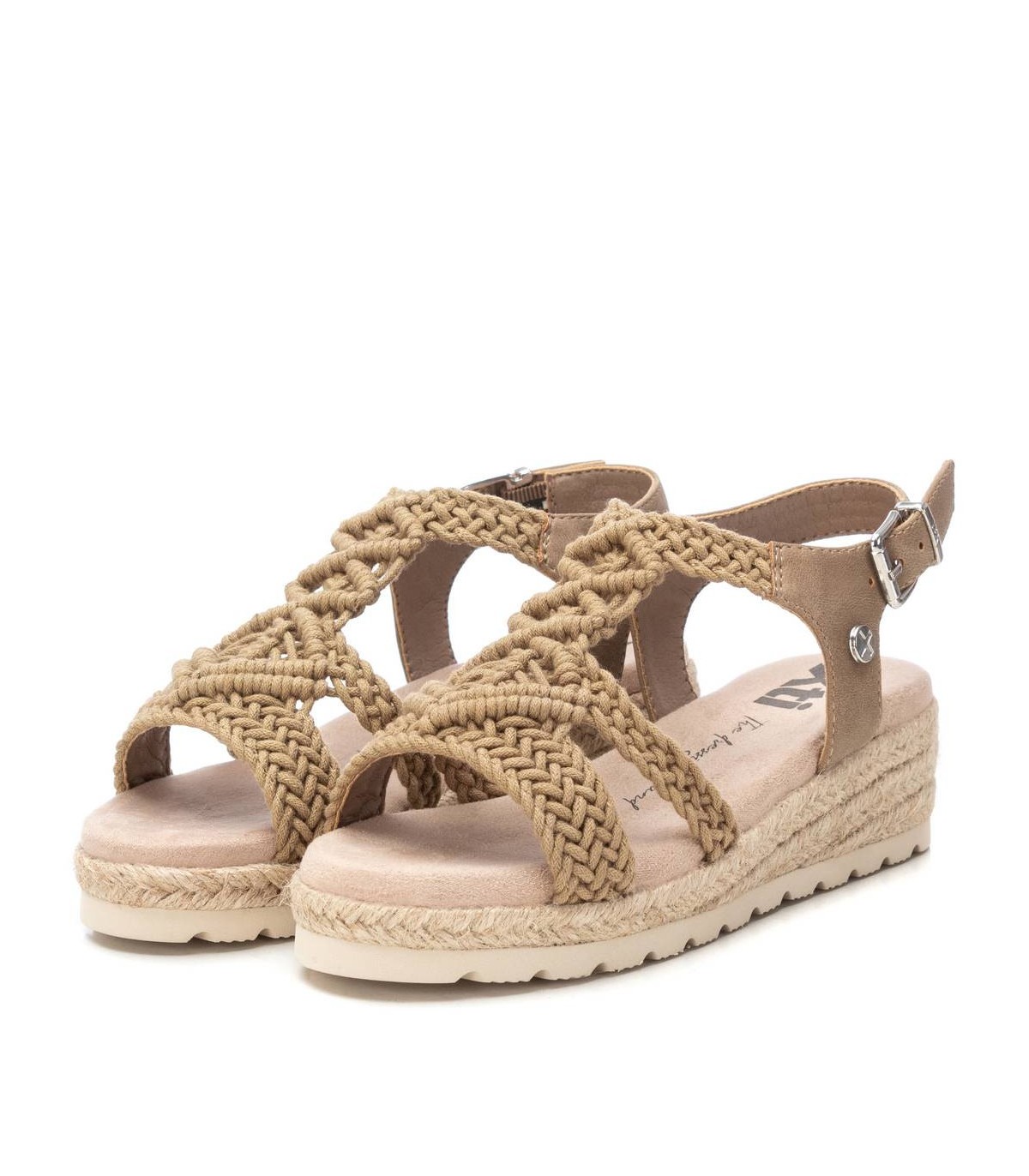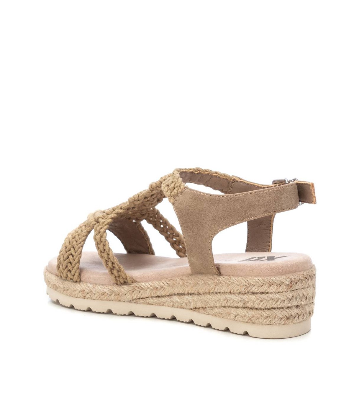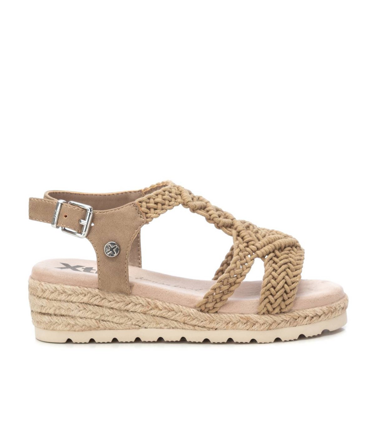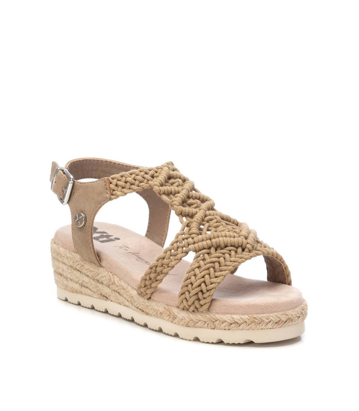 Sandalia de niña de la marca Xti kids. Fabricada con material textil tipo crochet. Pulsera con material que imita la piel con hebilla metálica para sujeción al tobillo. Cuña de yute con suela de goma antideslizante. Ideal para los looks mas veraniegos.