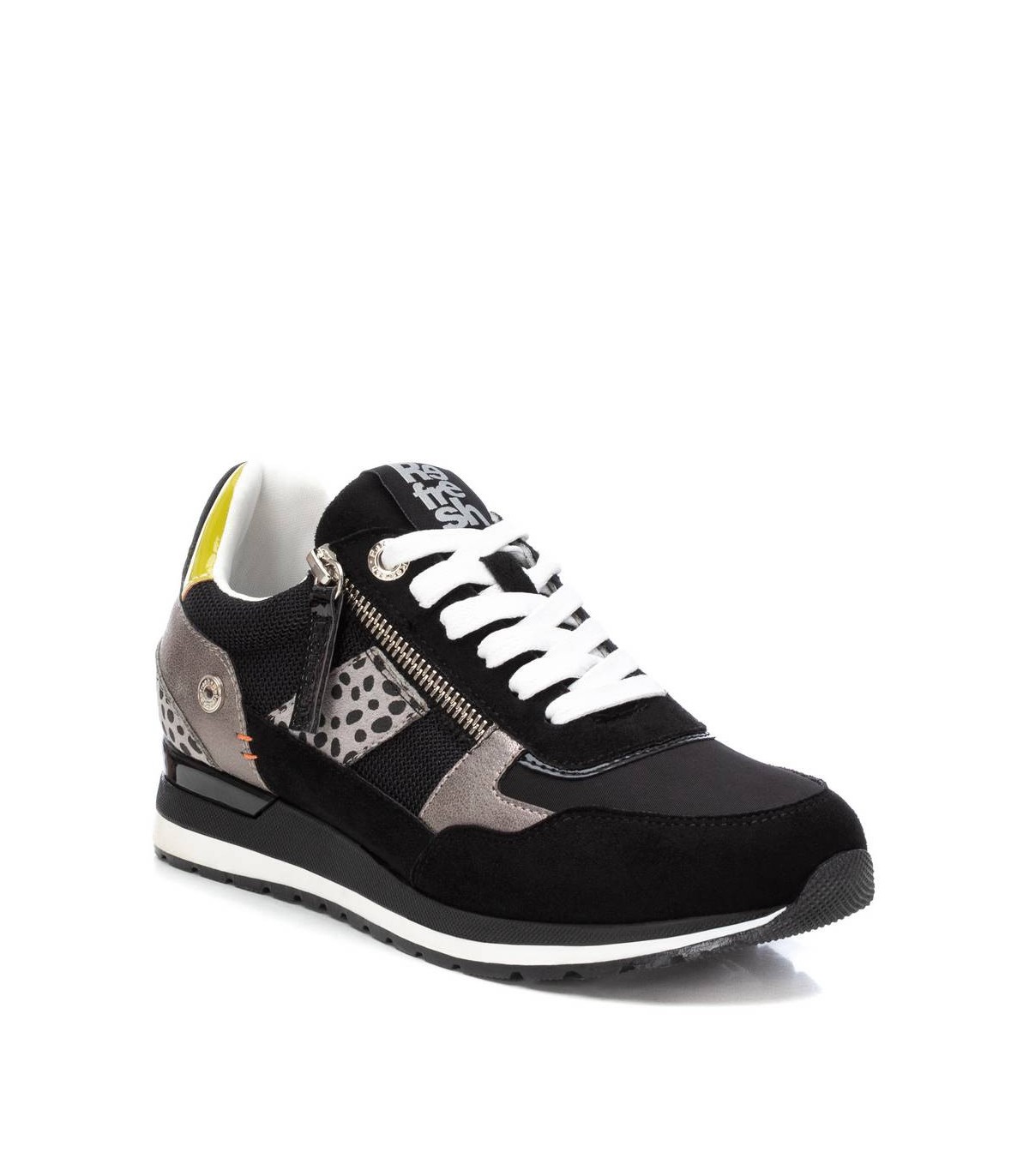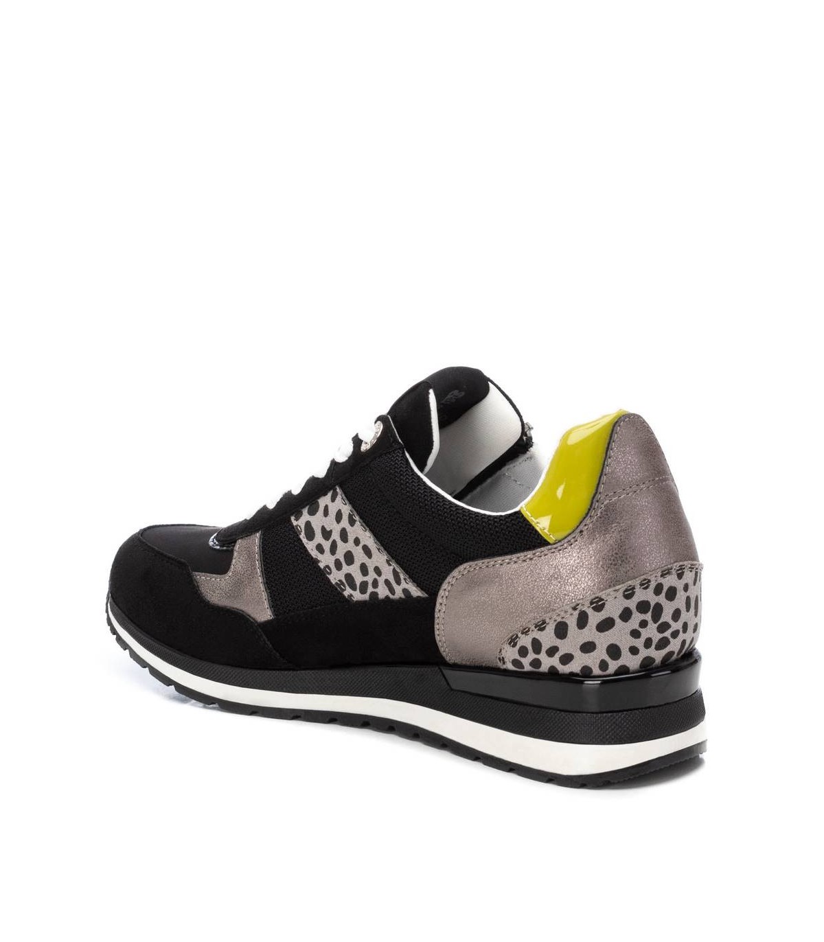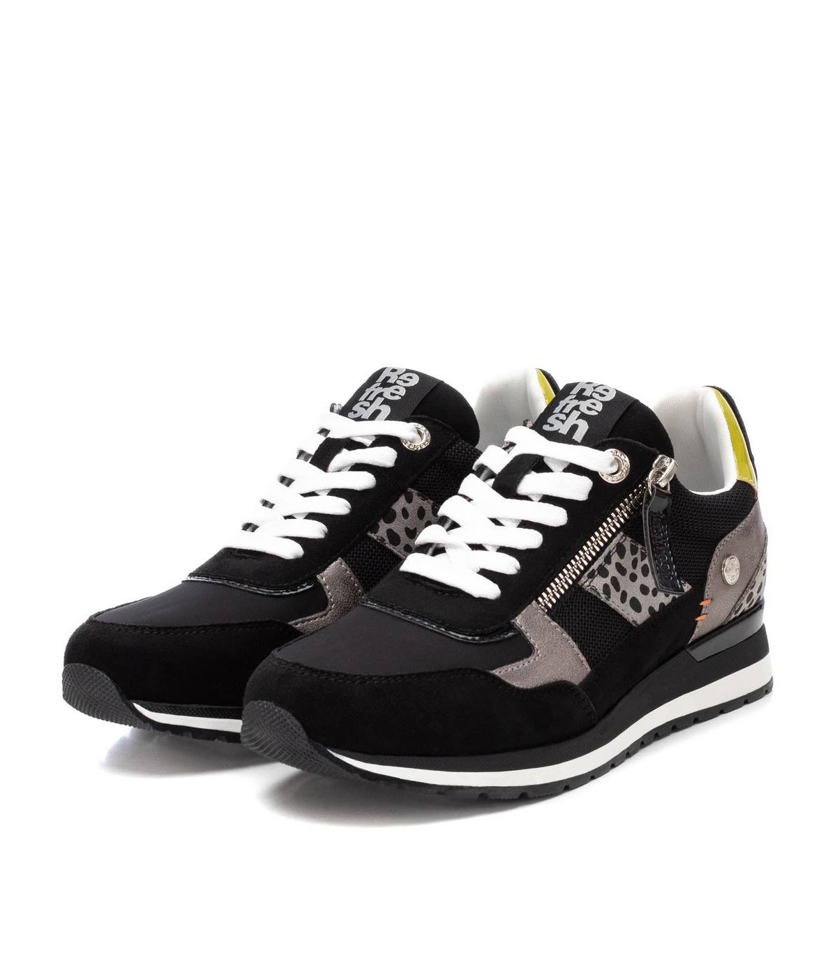 Zapatilla de mujer, de la marca Refresh. Fabricada en material que imita la piel combinado con tejido. Cierre mediante cremallera lateral y cordones ajustables. Diseño animal print en tendencia esta temporada. Cómoda suela de goma antideslizante. Este modelo ha obtenido el certificado vegano por la organización mundial PETA (Organización de los derechos de los animales).