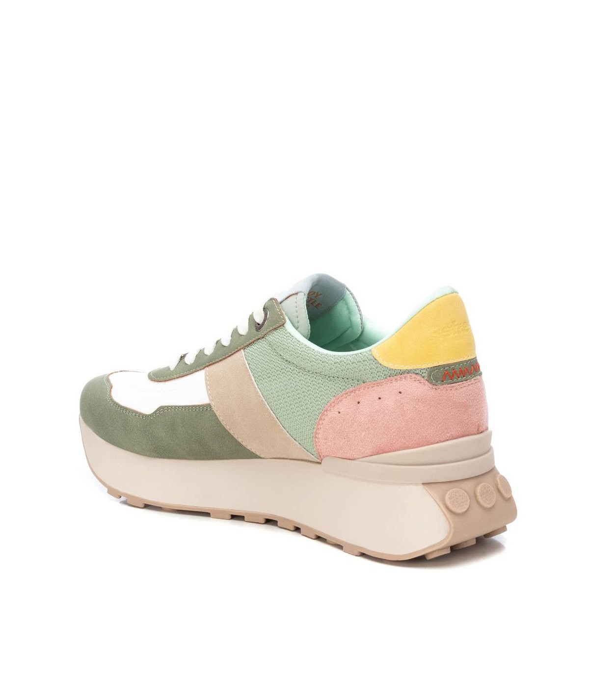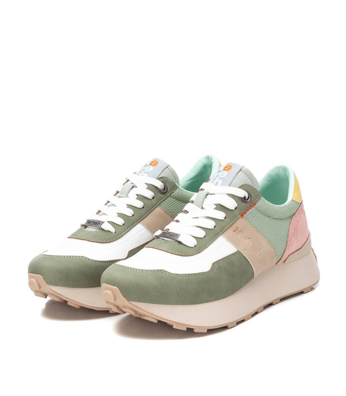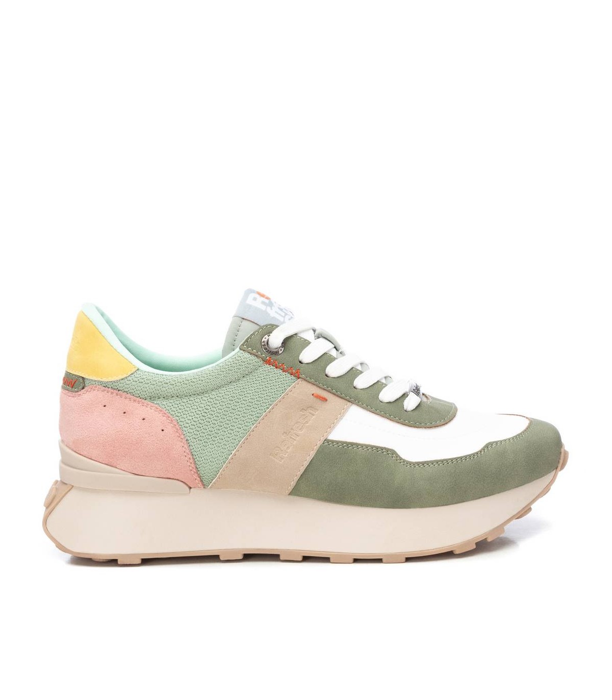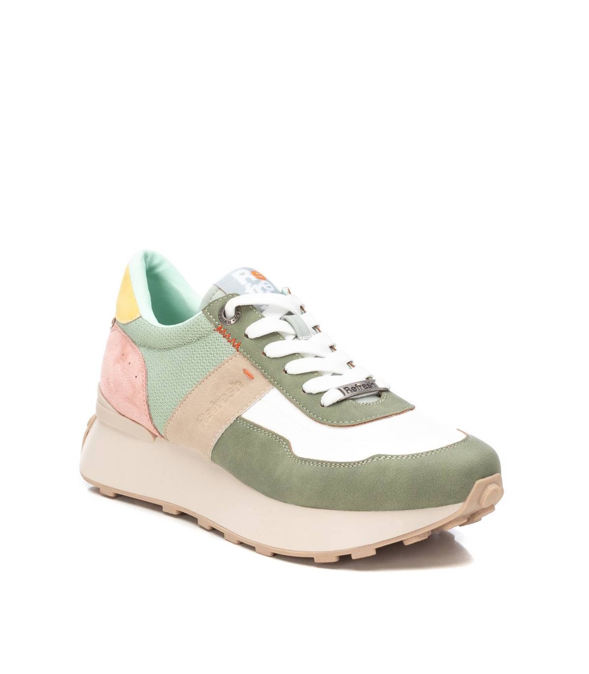 Zapatilla de mujer, de la marca Refresh. Fabricada en material que imita la piel y textil. Cierre mediante cordones ajustables. Cómodo piso grueso y suela de goma antideslizante. Este modelo ha obtenido el certificado vegano por la organización mundial PETA (Organización de los derechos de los animales).