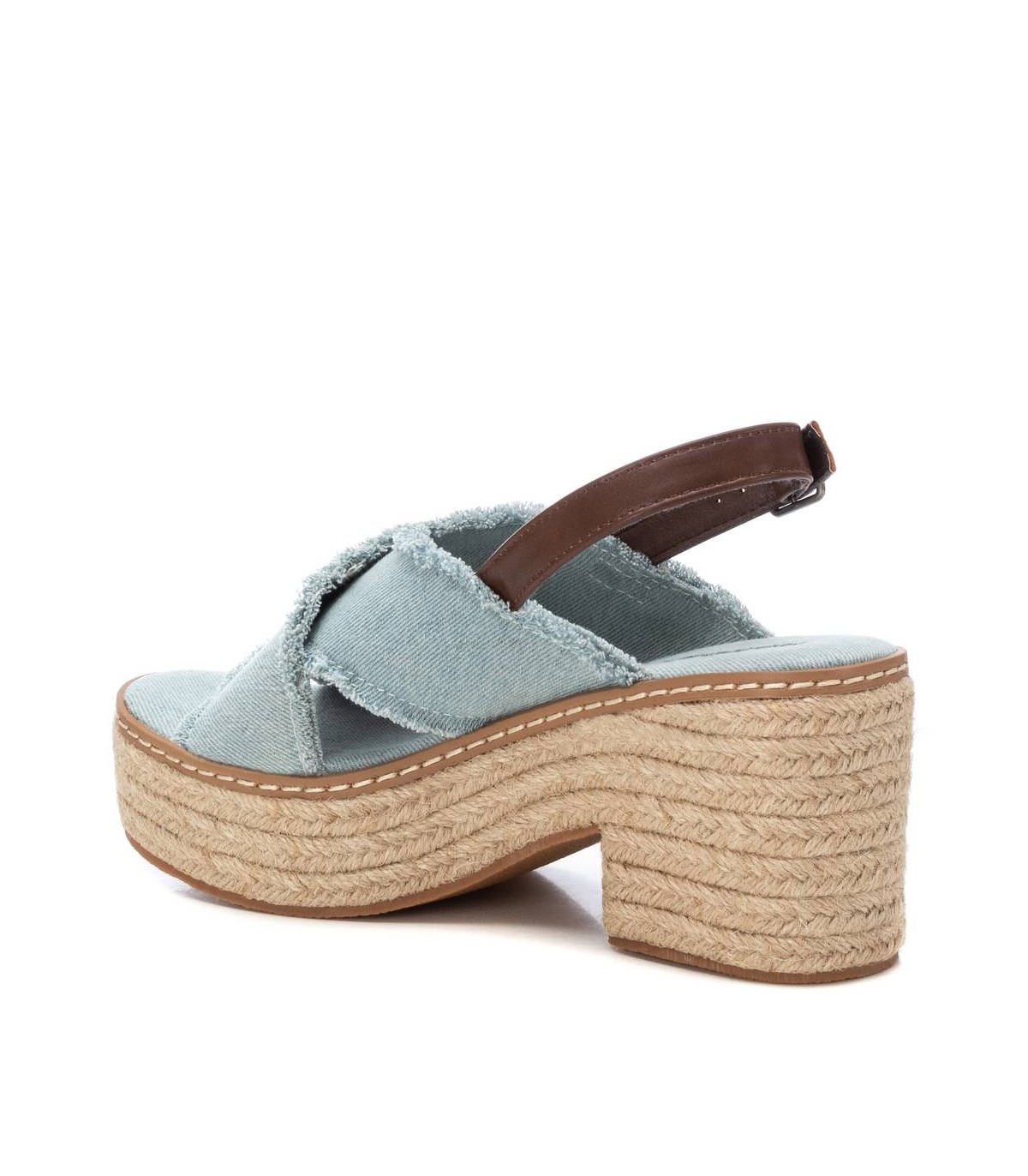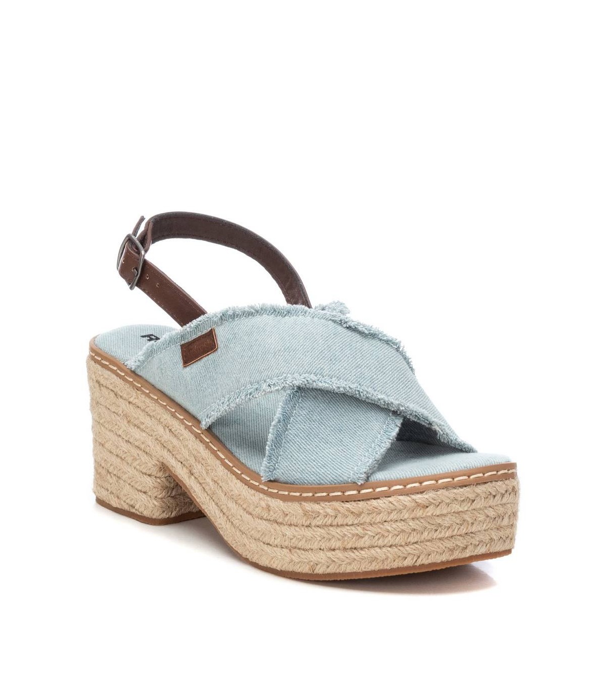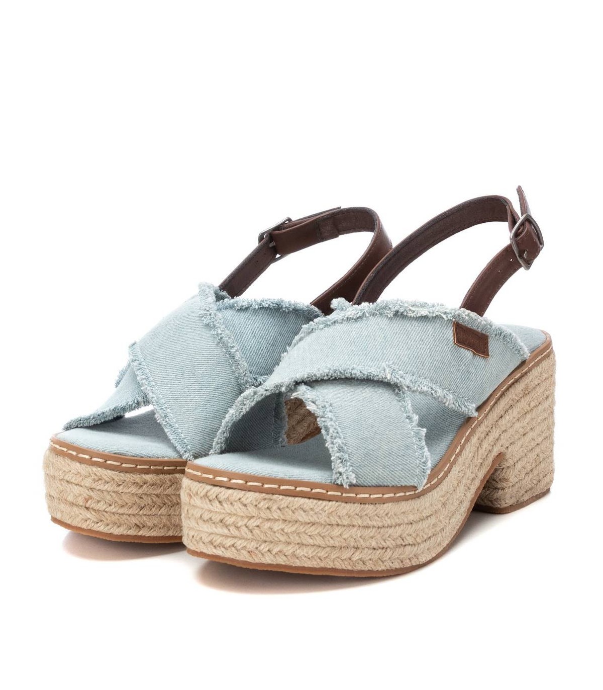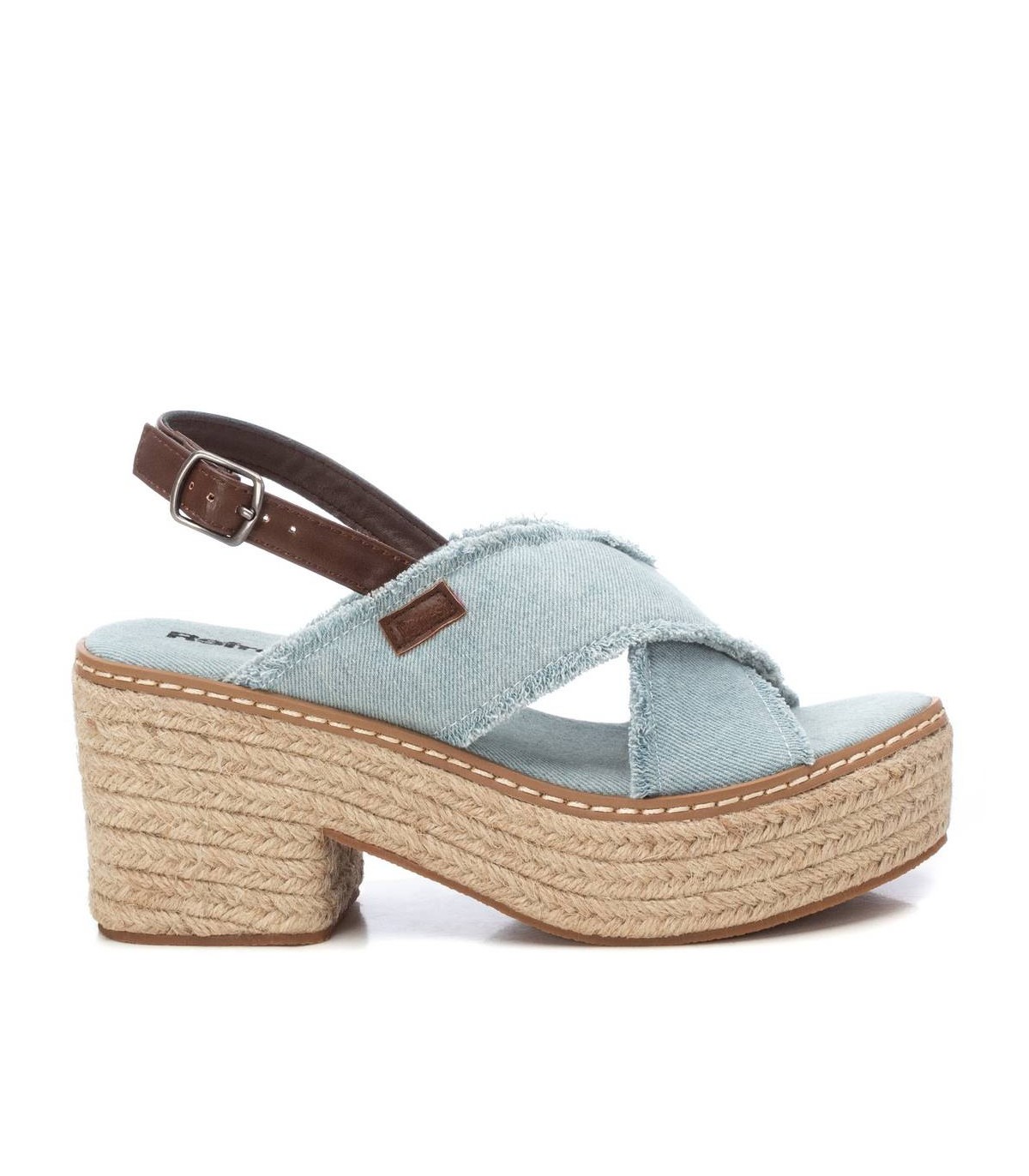 Sandalia de mujer, de la marca Refresh. Fabricada en tejido denim. Pala ancha cruzada con correa al tobillo. Cierre mediante hebilla ajustable. Tacón ancho de 8 cm con plataforma delantera forrado en yute. Suela antideslizante. Un modelo en tendencia ideal para tus looks casuales. Este modelo ha obtenido el certificado vegano por la organización mundial PETA (Organización de los derechos de los animales).