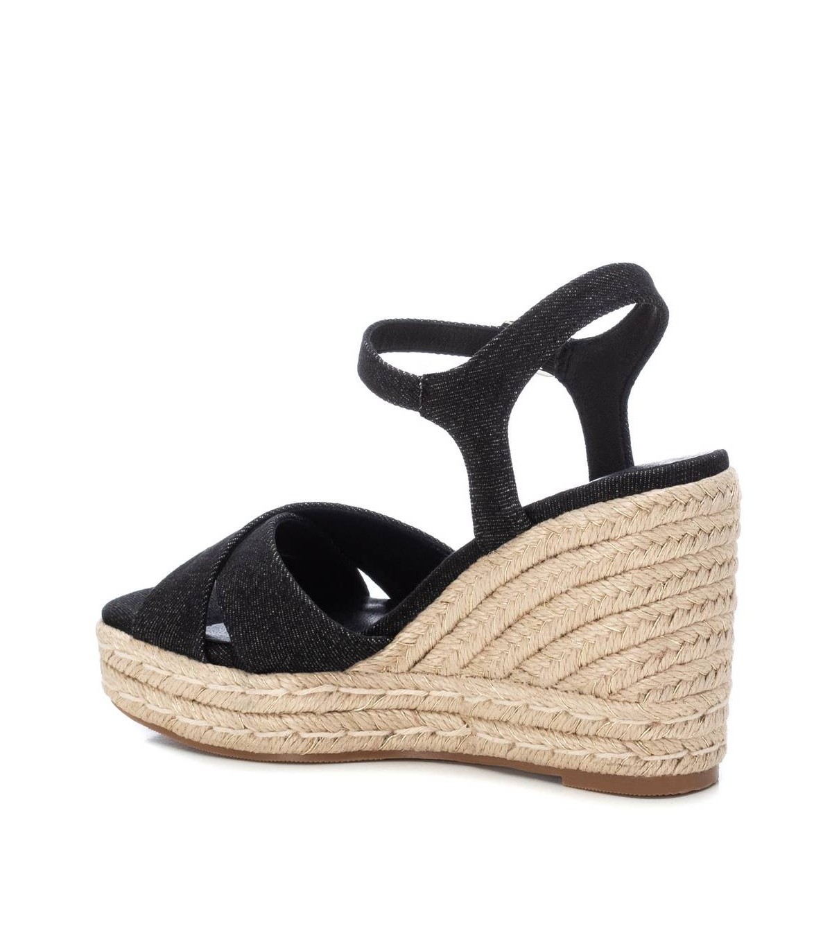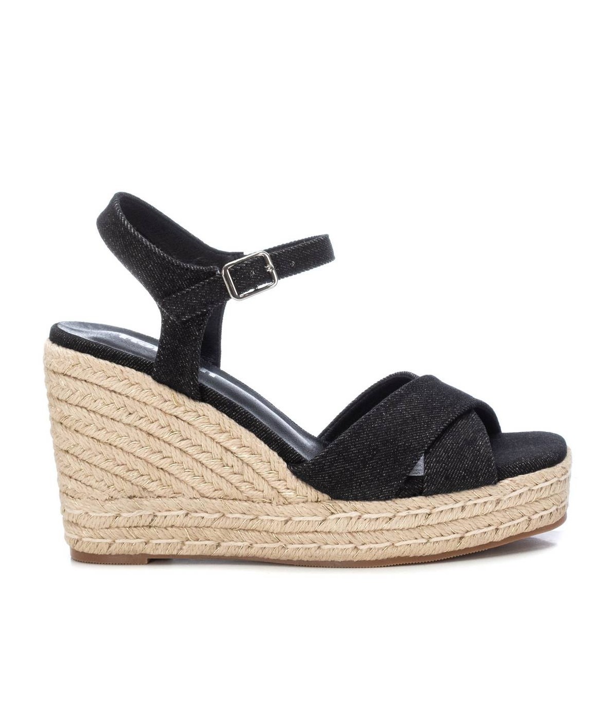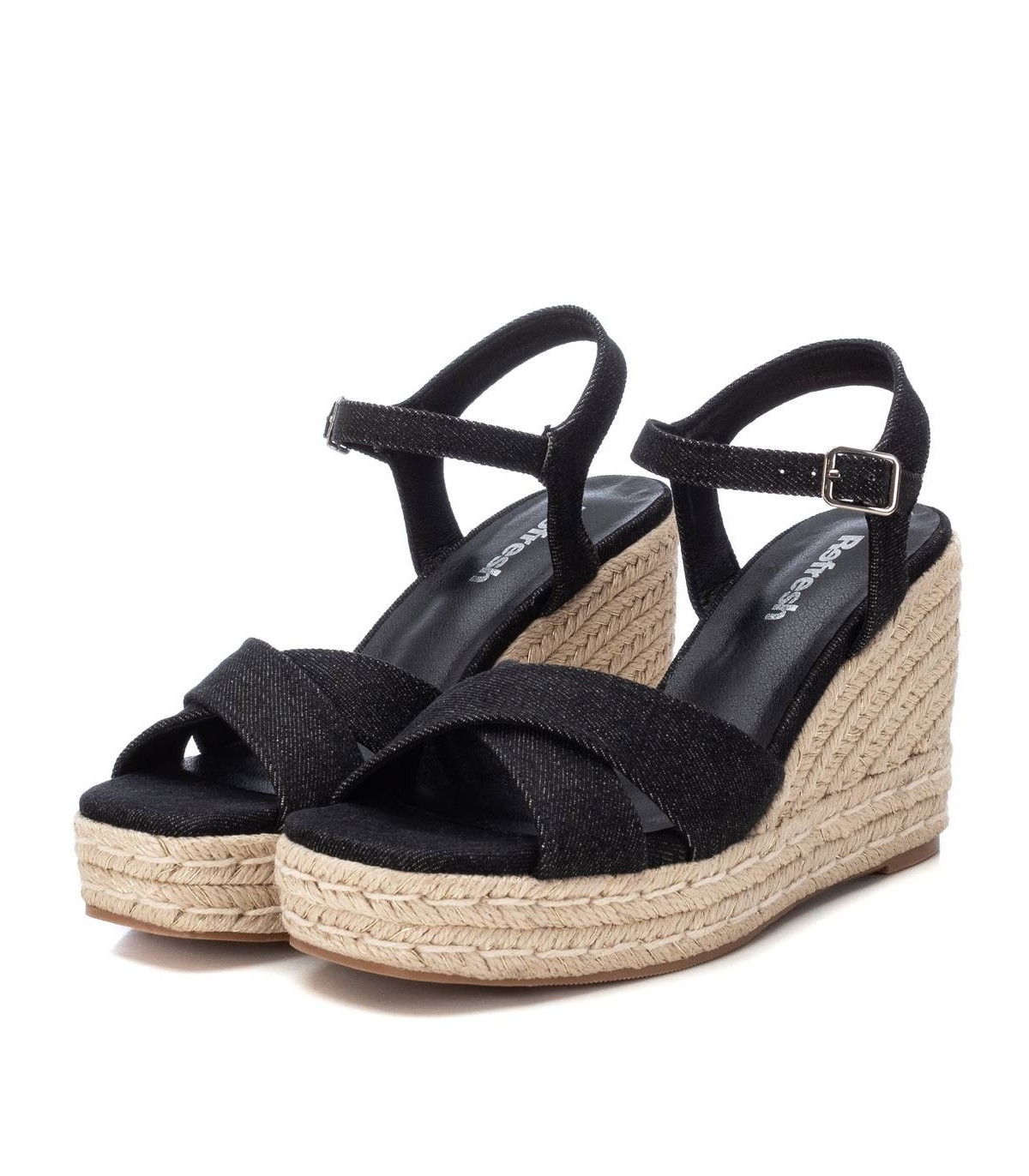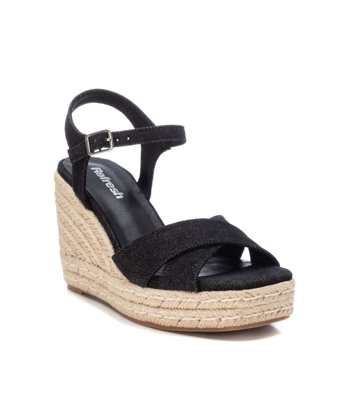 Sandalia de mujer, de la marca Refresh. Fabricada en tejido denim. Pala cruzada y pulsera al tobillo con hebilla ajustable. Cuña de 9 cm forrada en yute trenzado con plataforma delantera para mayor comodidad. Suela de goma antideslizante. Este modelo ha obtenido el certificado vegano por la organización mundial PETA (Organización de los derechos de los animales).