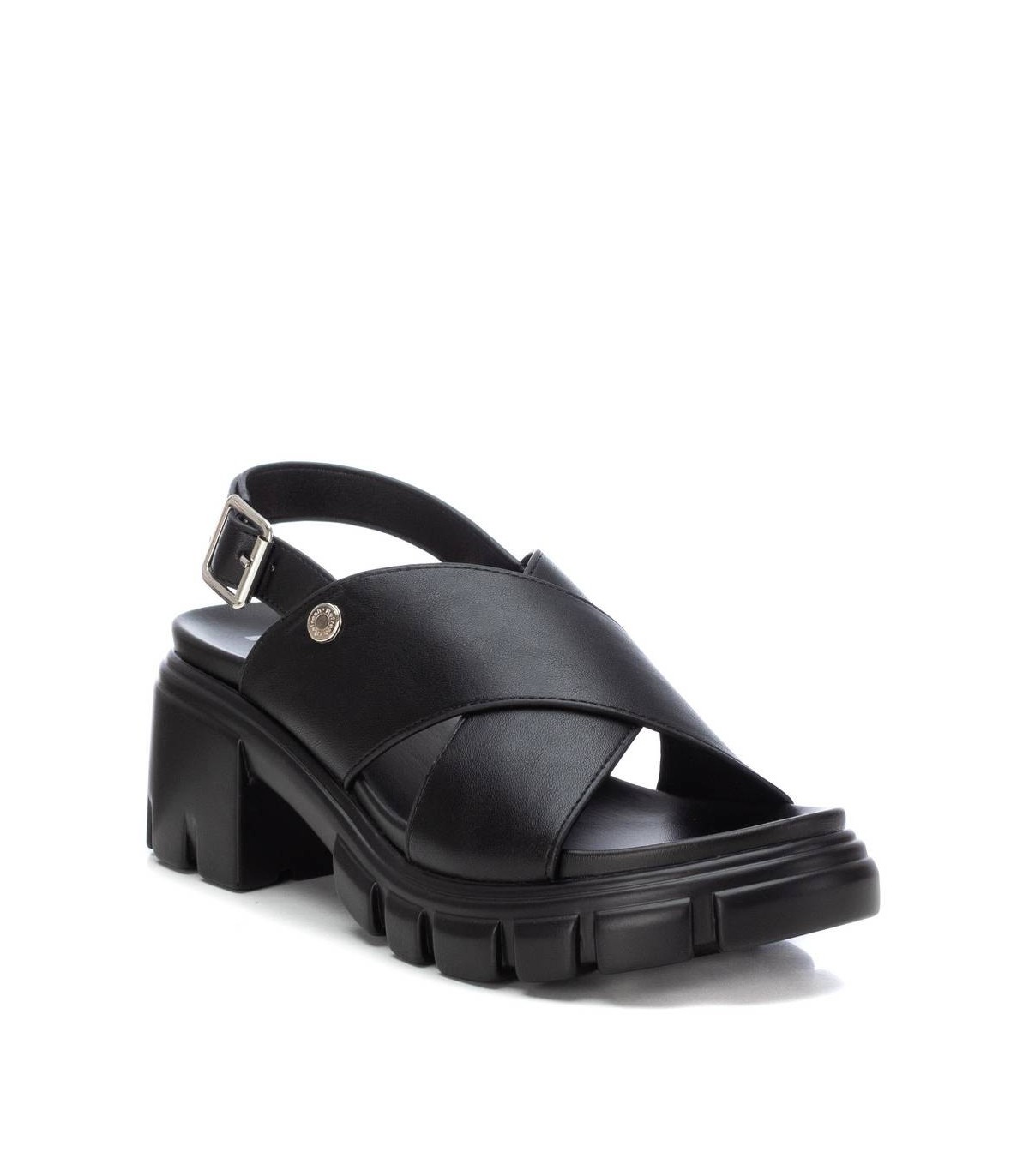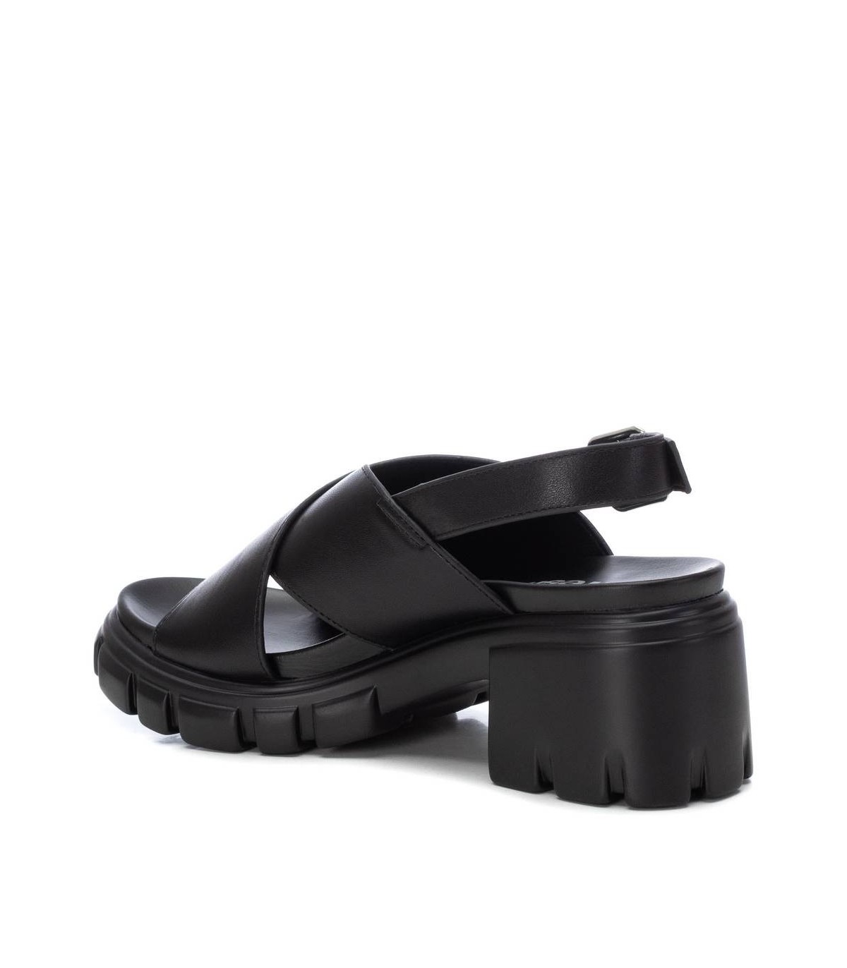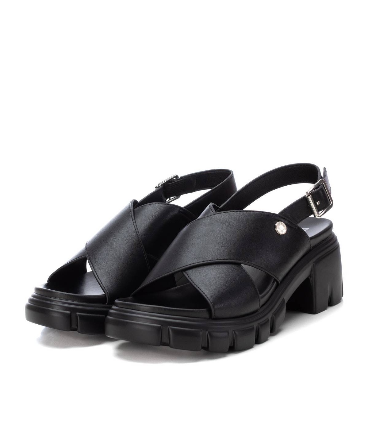Sandalia de mujer, de la marca Refresh. Fabricada en material que imita la piel. Doble pala ancha cruzada con correa al tobillo. Cierre mediante hebilla. Tacón ancho de 7 cm con plataforma para mayor comodidad. Suela dentada antideslizante. Este modelo ha obtenido el certificado vegano por la organización mundial PETA (Organización de los derechos de los animales).