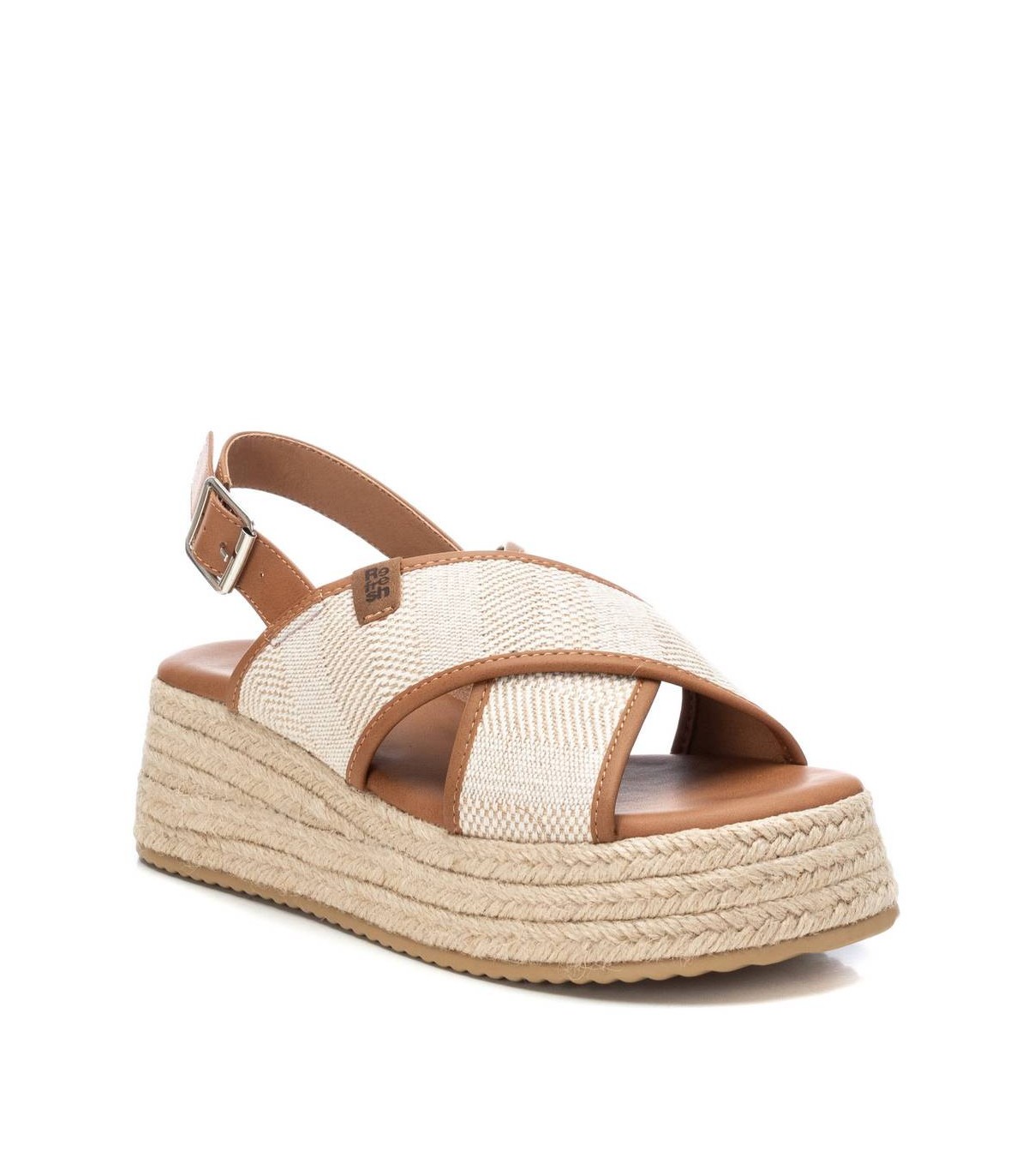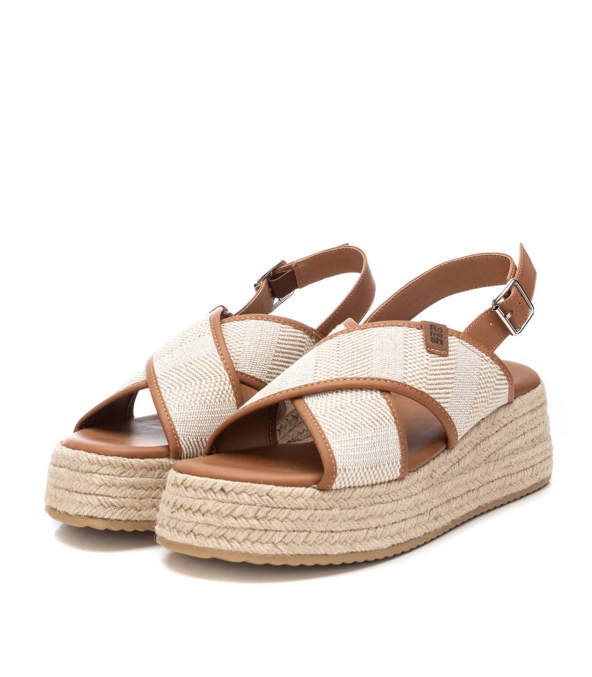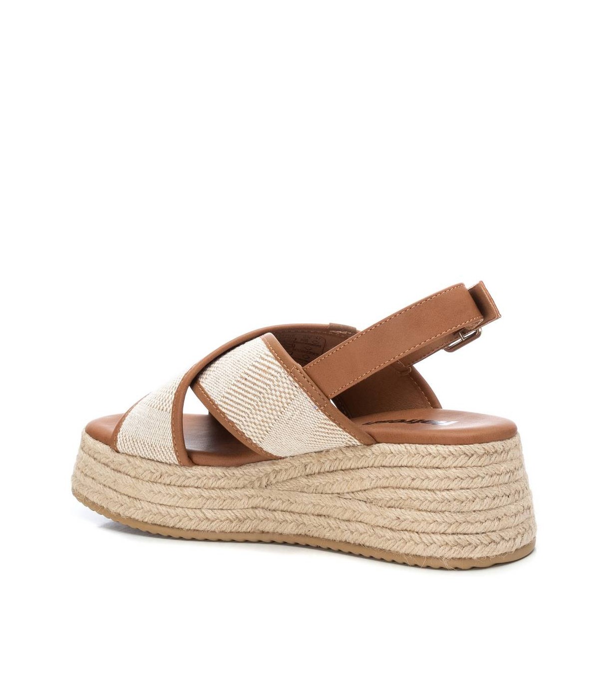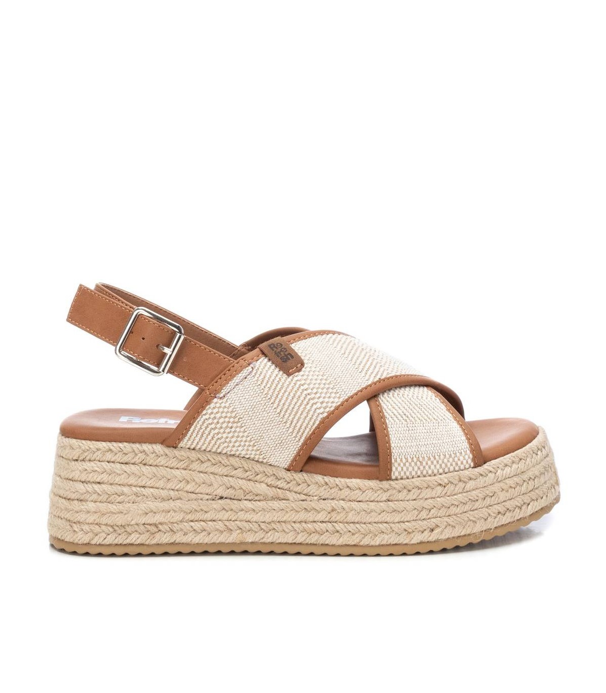 Sandalia de mujer, de la marca Refresh. Fabricada en textil y material que imita la piel. Cierre mediante hebilla. Cómoda planta acolchada. Cuña de 5 cm forrada en yute trenzado y plataforma para mayor comodidad. Suela antideslizante. Este modelo ha obtenido el certificado vegano por la organización mundial PETA (Organización de los derechos de los animales).