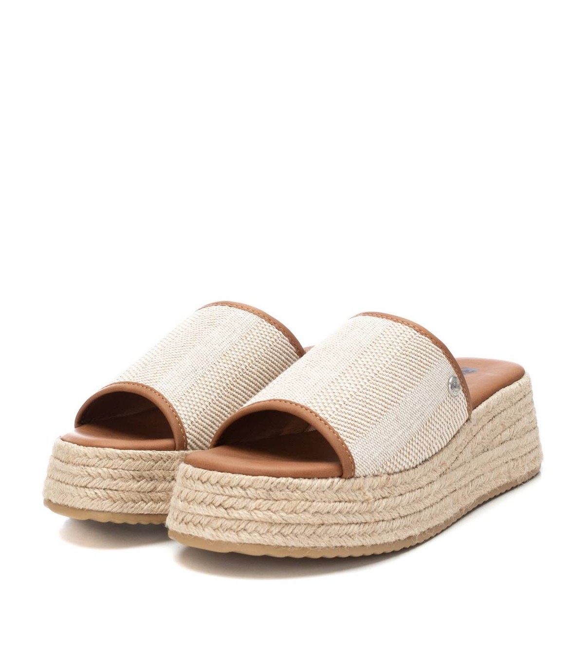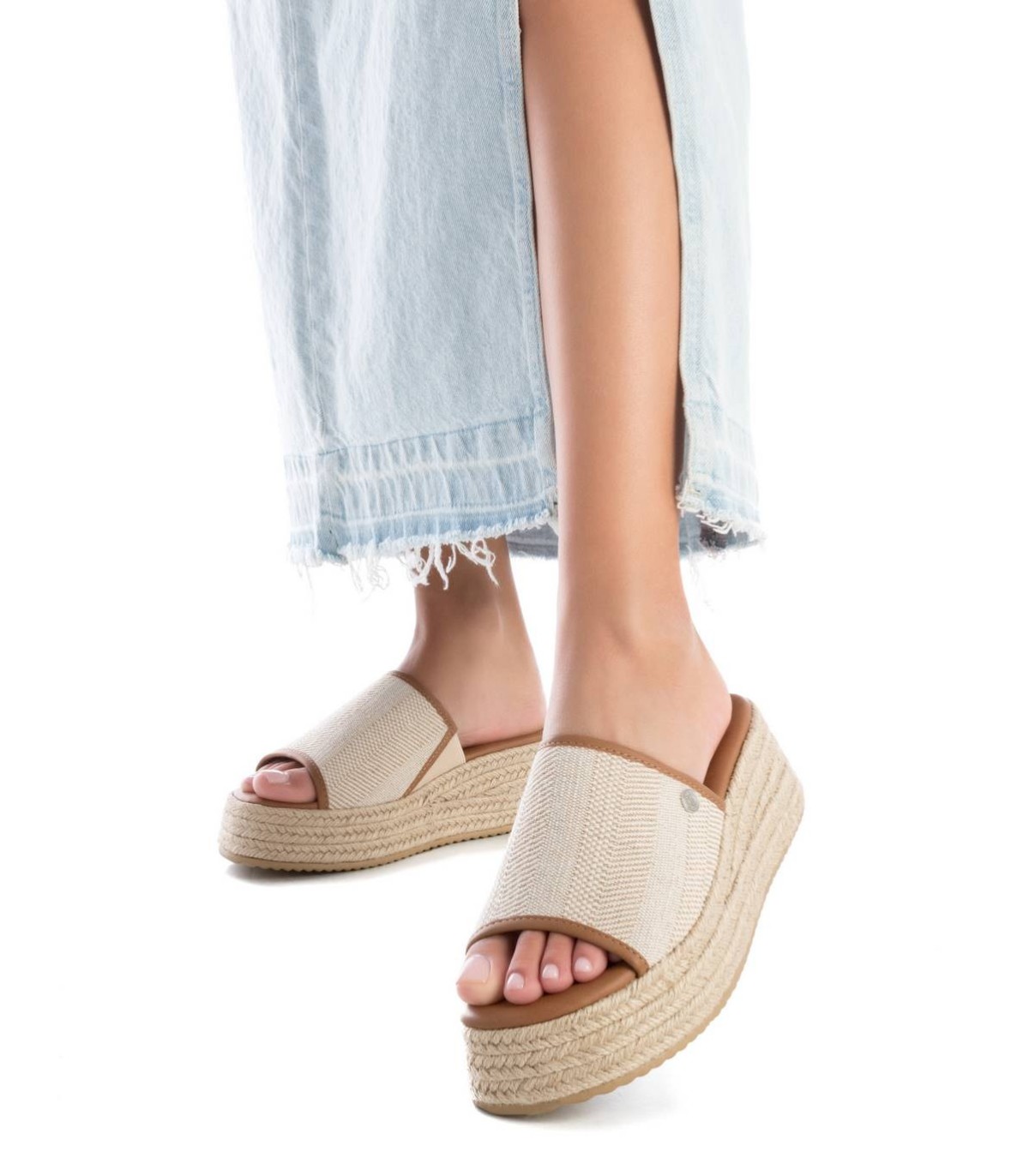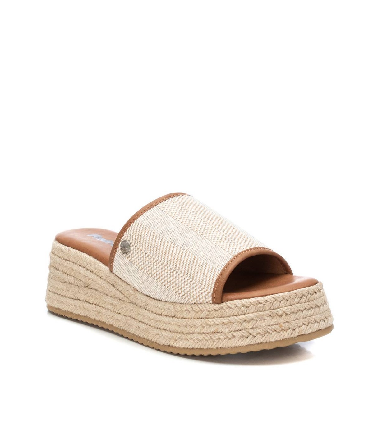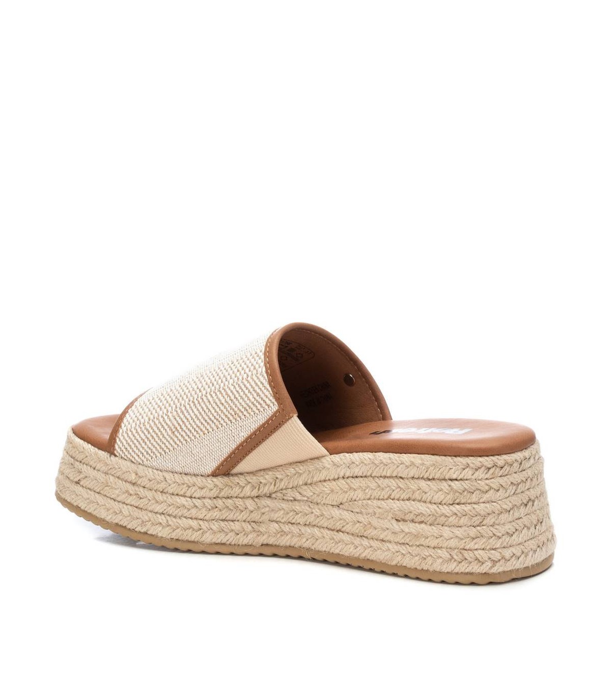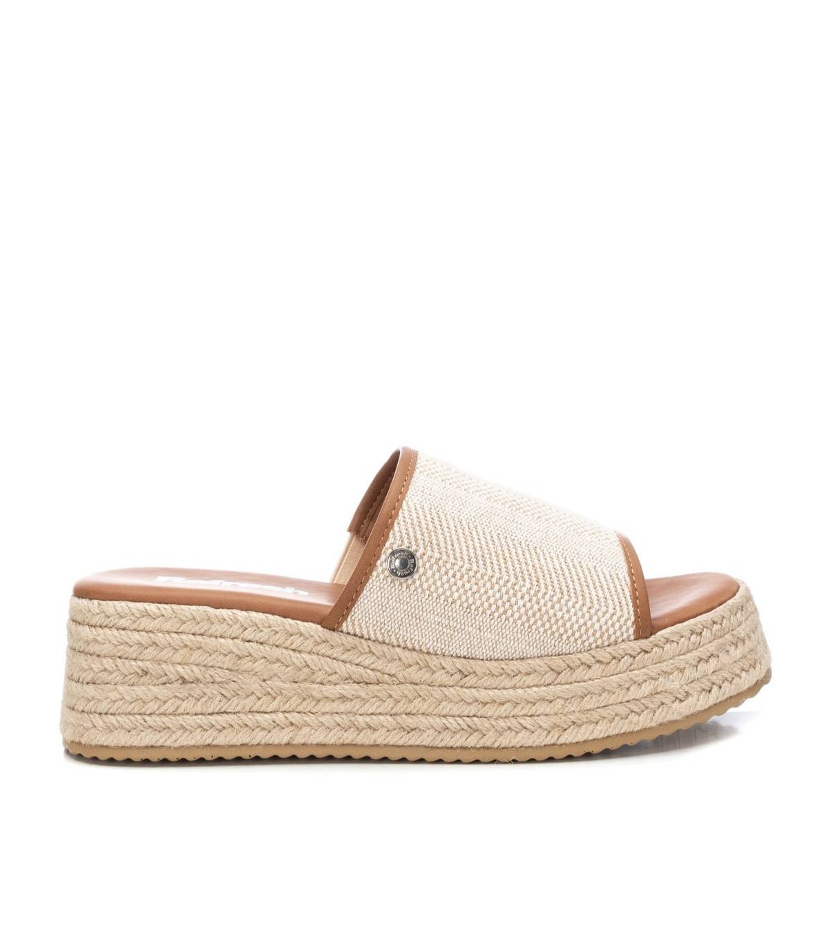 Sandalia de mujer, de la marca Refresh. Fabricada en material textil. Diseño tipo mule con vivos en contraste. Cuña de 5 cm forrada en yute trenzado y plataforma delantera para mayor comodidad. Suela antideslizante. Este modelo ha obtenido el certificado vegano por la organización mundial PETA (Organización de los derechos de los animales).