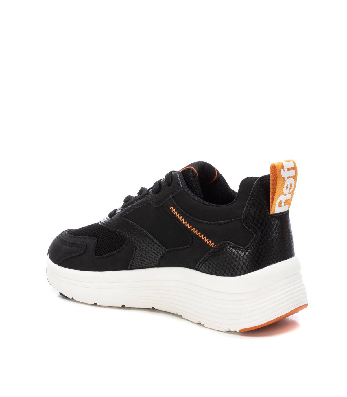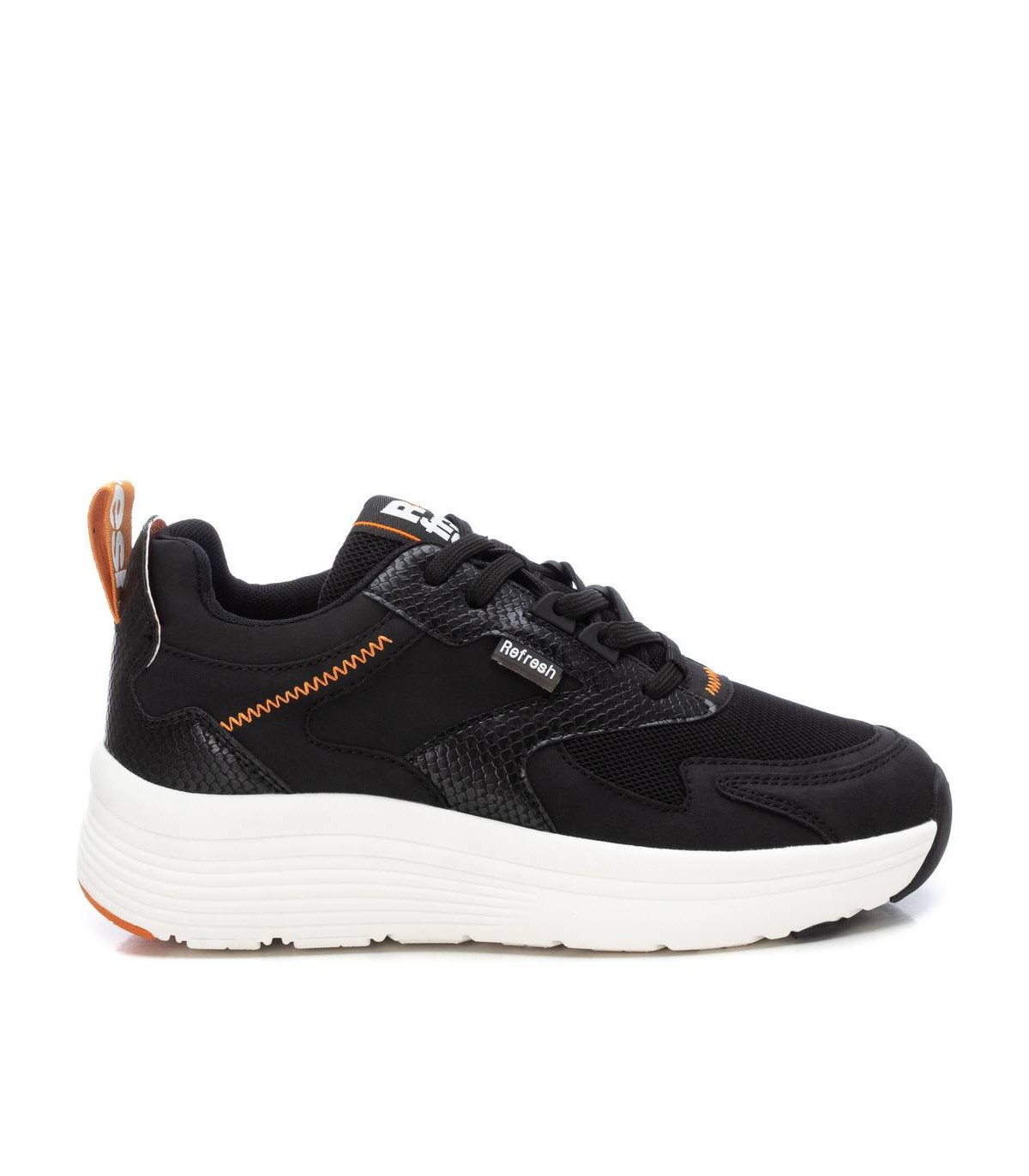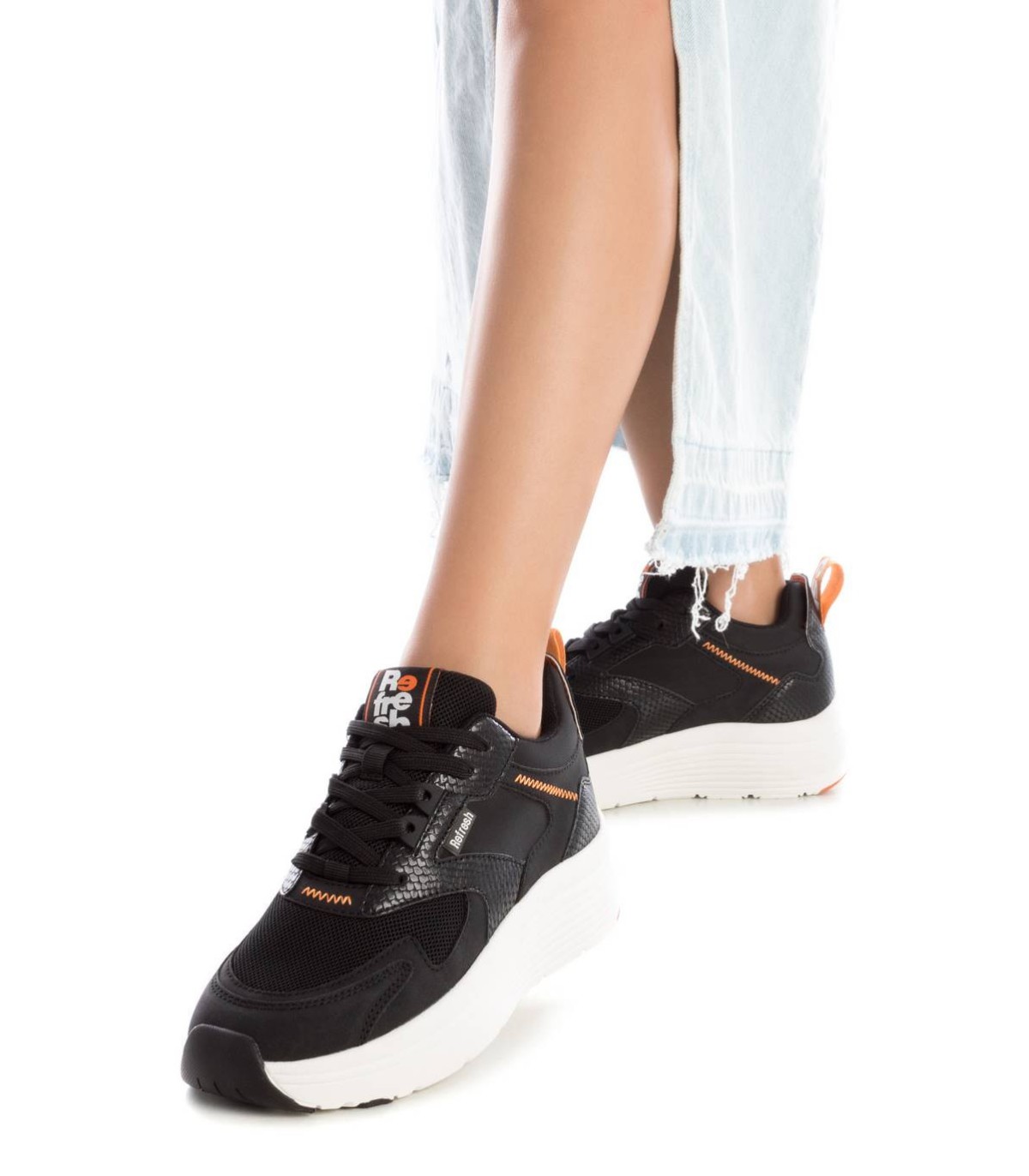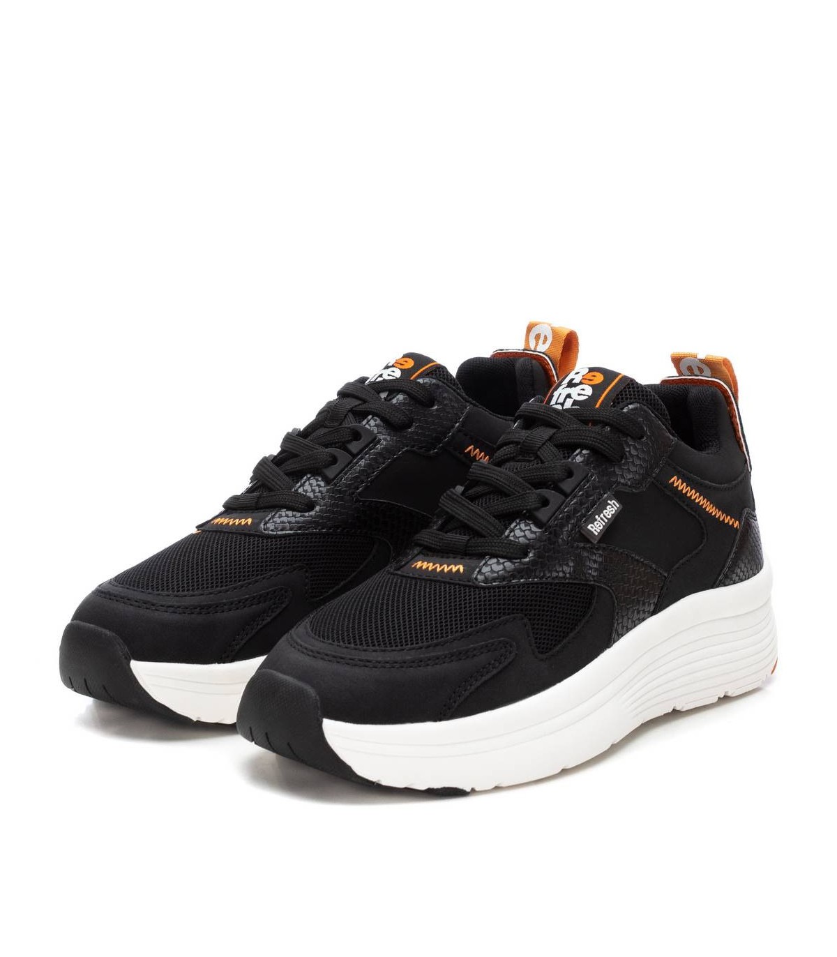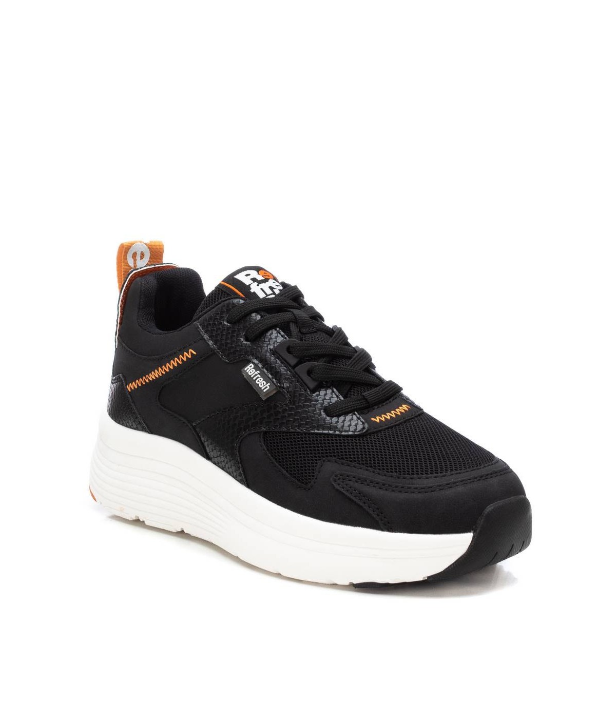 Zapatilla de mujer, de la marca Refresh. Fabricada en material que imita la piel combinado con textil. Cierre mediante cordones ajustables. Tirador trasero que facilita la puesta. Piso volumen con suela de goma antideslizante. Este modelo ha obtenido el certificado vegano por la organización mundial PETA (Organización de los derechos de los animales).