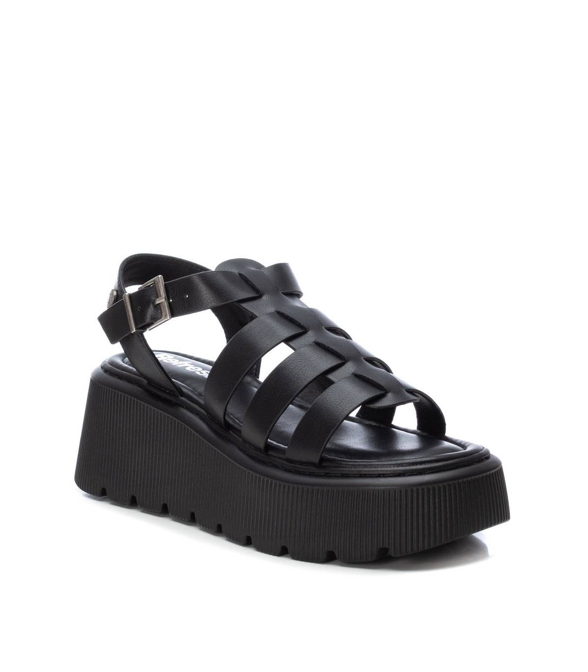 Sandalia de mujer, de la marca Refresh. Fabricada en material que imita la piel. Diseño tipo cangrejera con cierre mediante hebilla. Cuña de 6 cm con plataforma. Suela antideslizante. Este modelo ha obtenido el certificado vegano por la organización mundial PETA (Organización de los derechos de los animales).