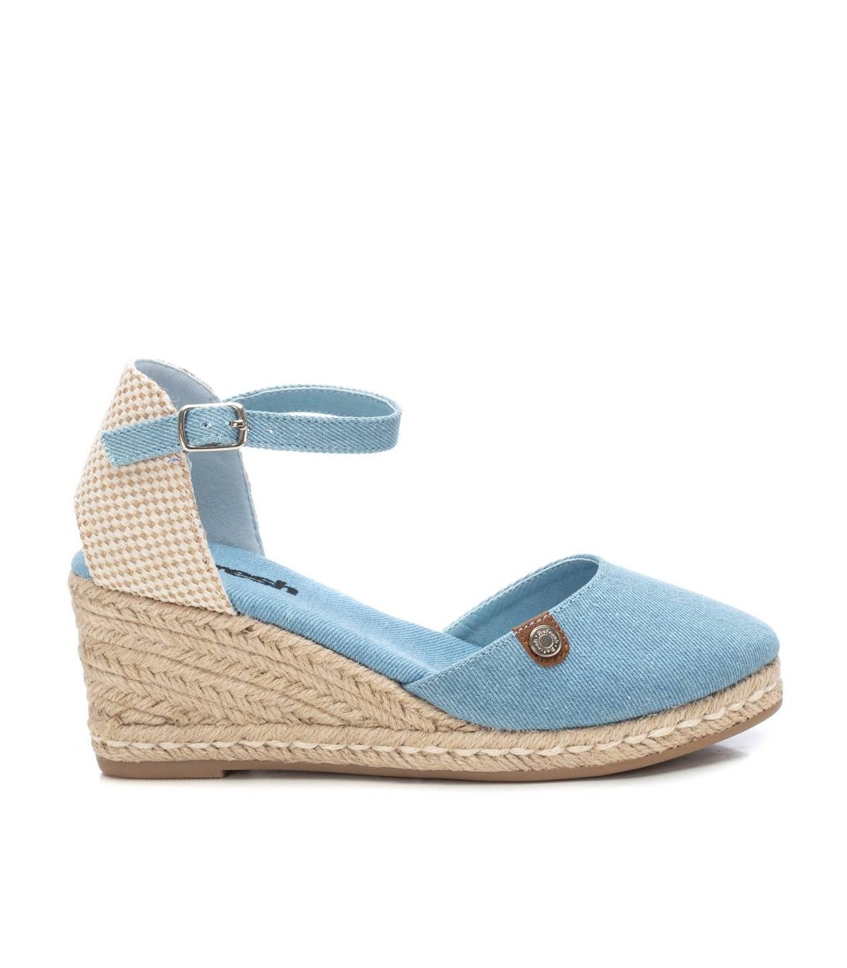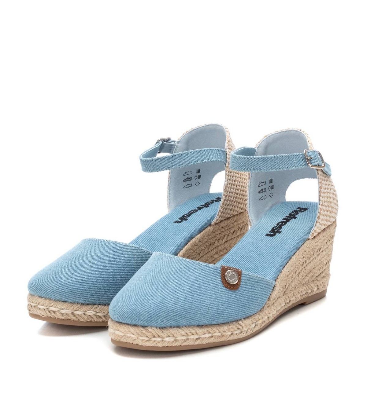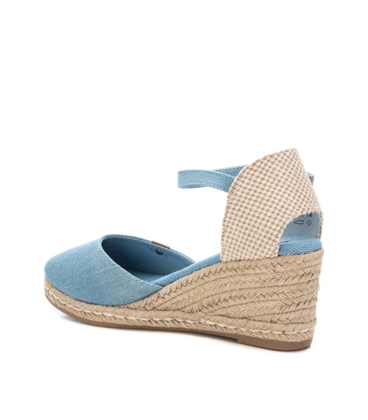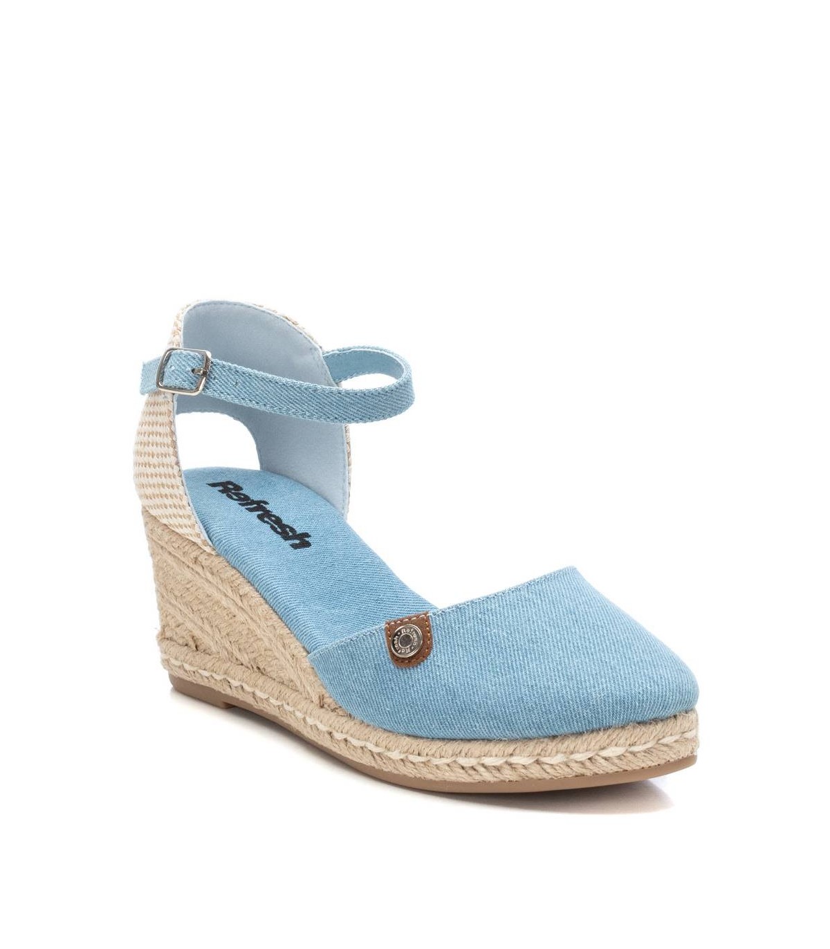 Valenciana de mujer, de la marca Refresh. Fabricada en tejido denim. Talón cerrado y pulsera al tobillo con hebilla. Cuña de 7 cm forrada en yute trenzado. Suela de goma antideslizante. Este modelo ha obtenido el certificado vegano por la organización mundial PETA (Organización de los derechos de los animales).