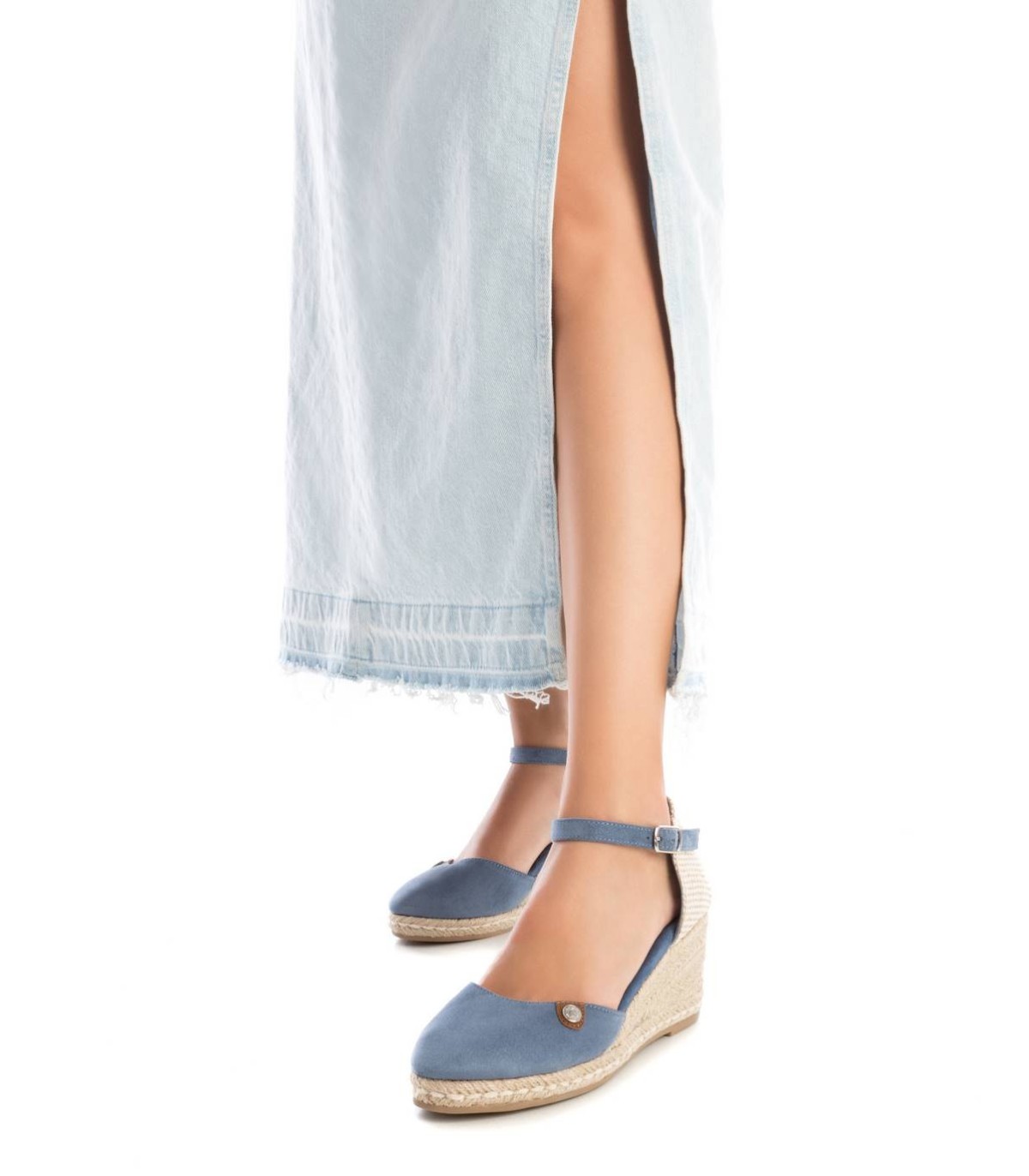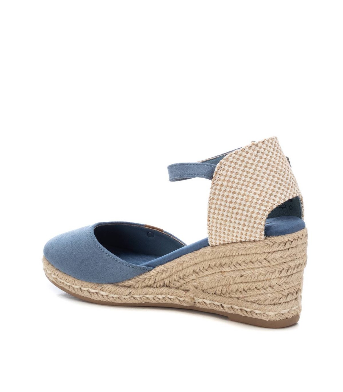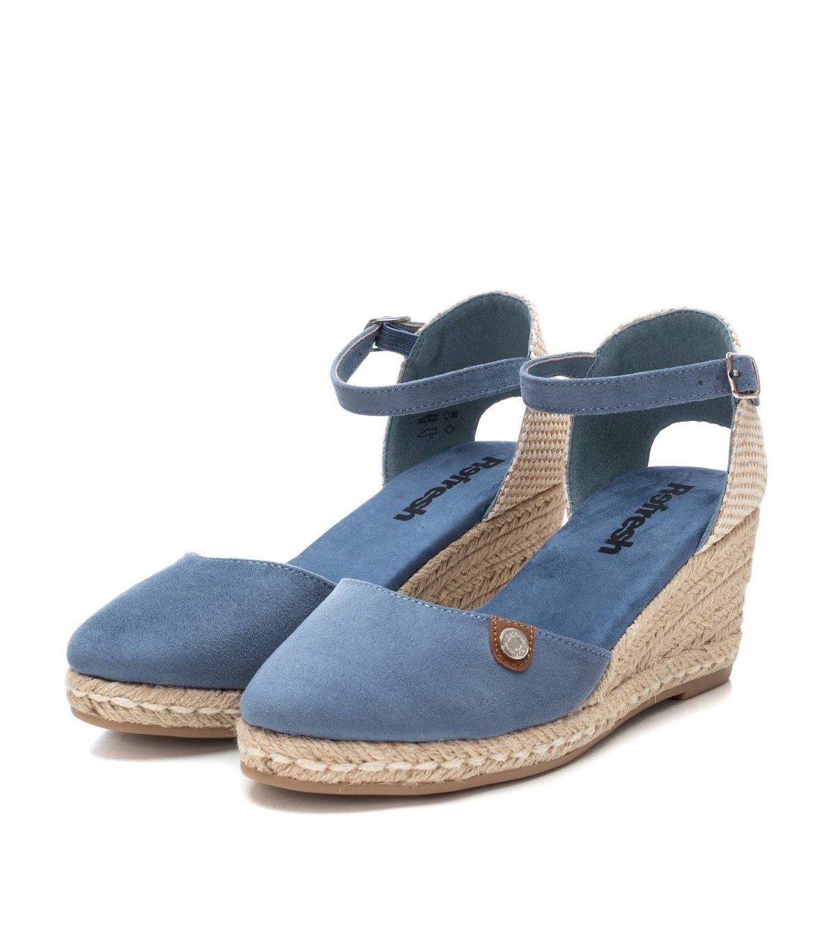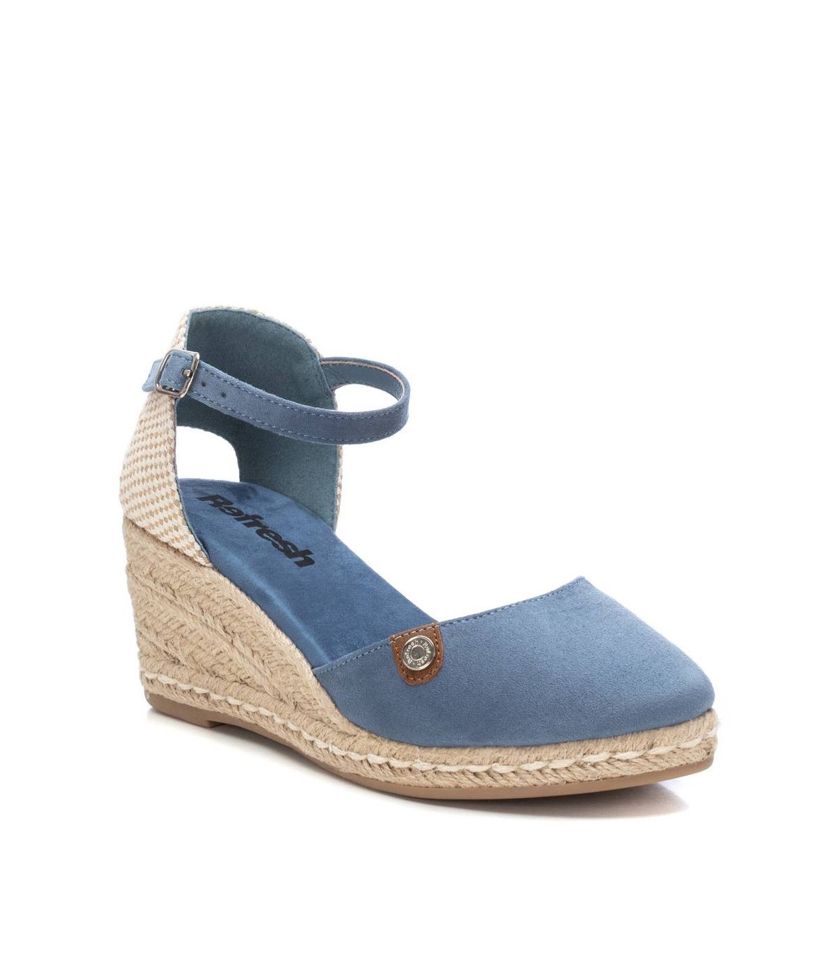 Alpargata tipo valenciana de mujer, de la marca Refresh. Fabricada en suave antelina. Pulsera al tobillo con hebilla. Cuña de 6 cm de yute y suela de goma antideslizante. Este modelo ha obtenido el certificado vegano por la organización mundial PETA (Organización de los derechos de los animales).