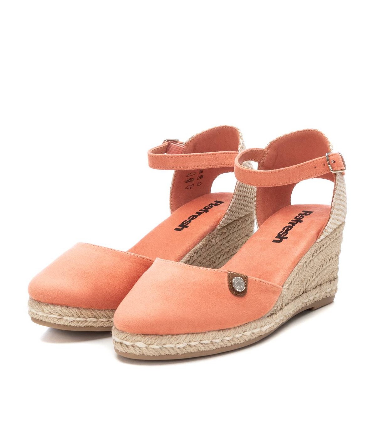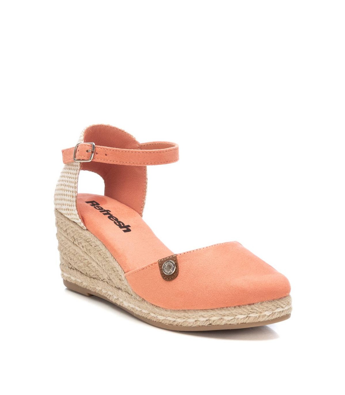 Alpargata tipo valenciana de mujer, de la marca Refresh. Fabricada en suave antelina. Pulsera al tobillo con hebilla. Cuña de 6 cm de yute y suela de goma antideslizante. Este modelo ha obtenido el certificado vegano por la organización mundial PETA (Organización de los derechos de los animales).