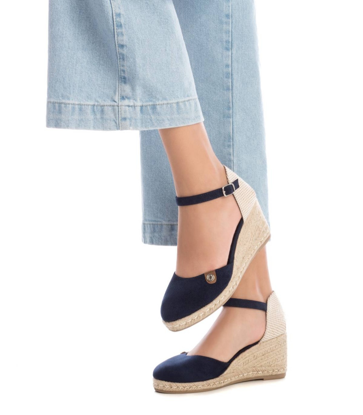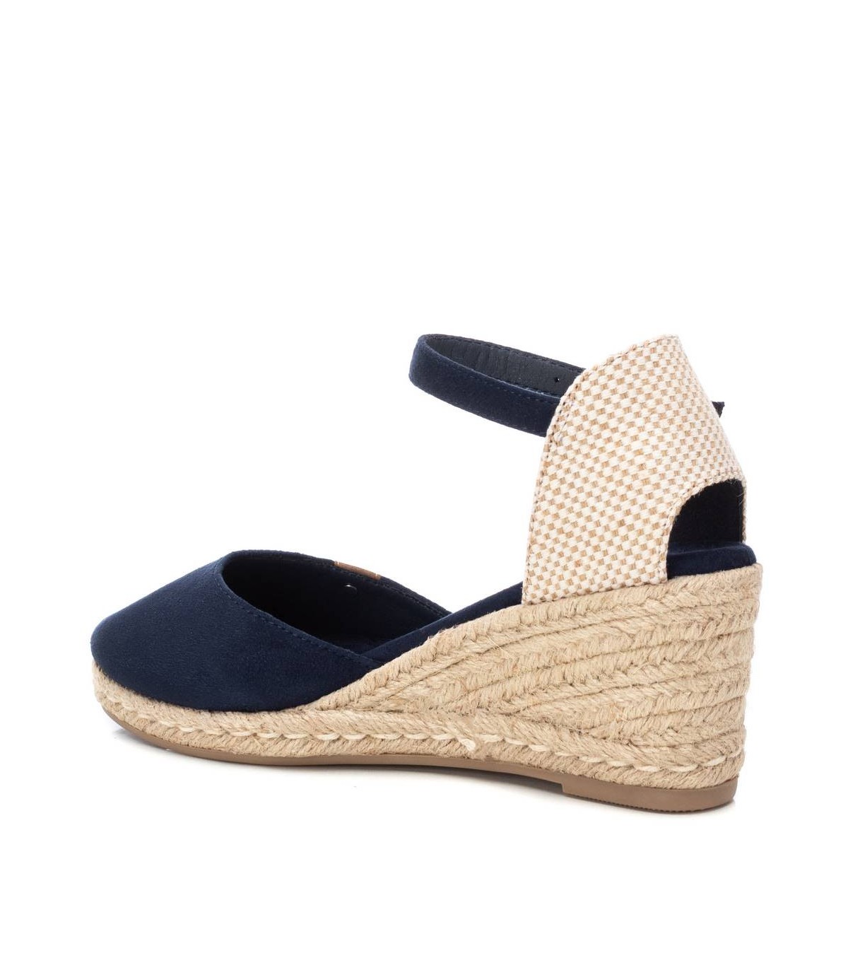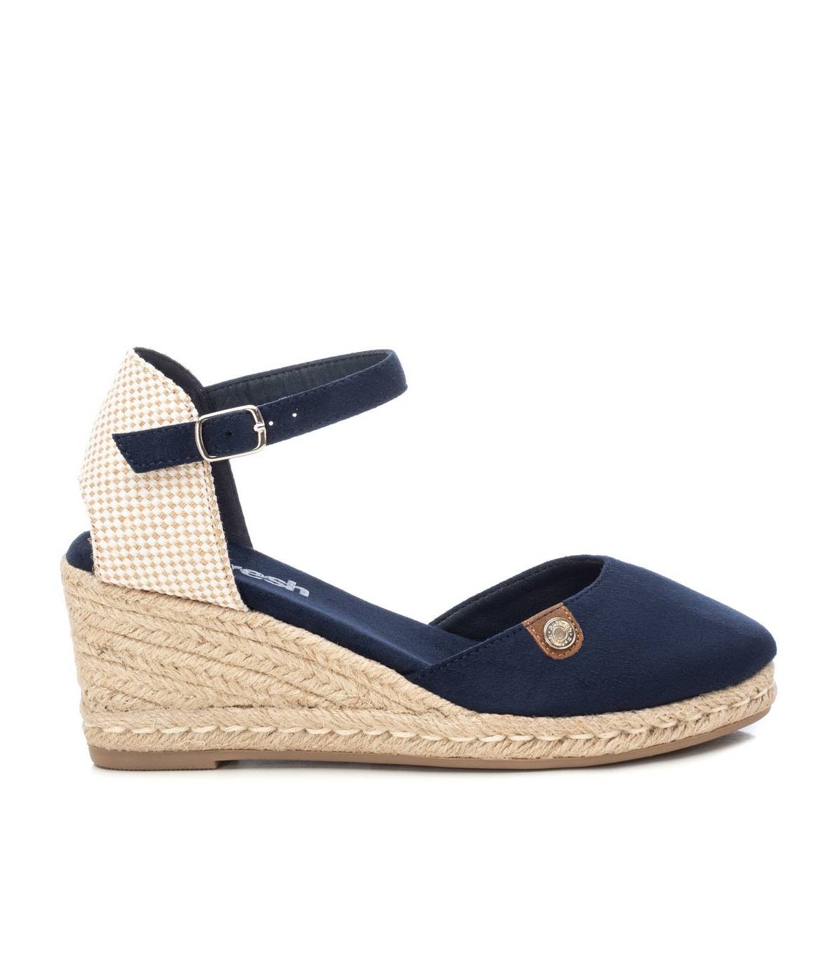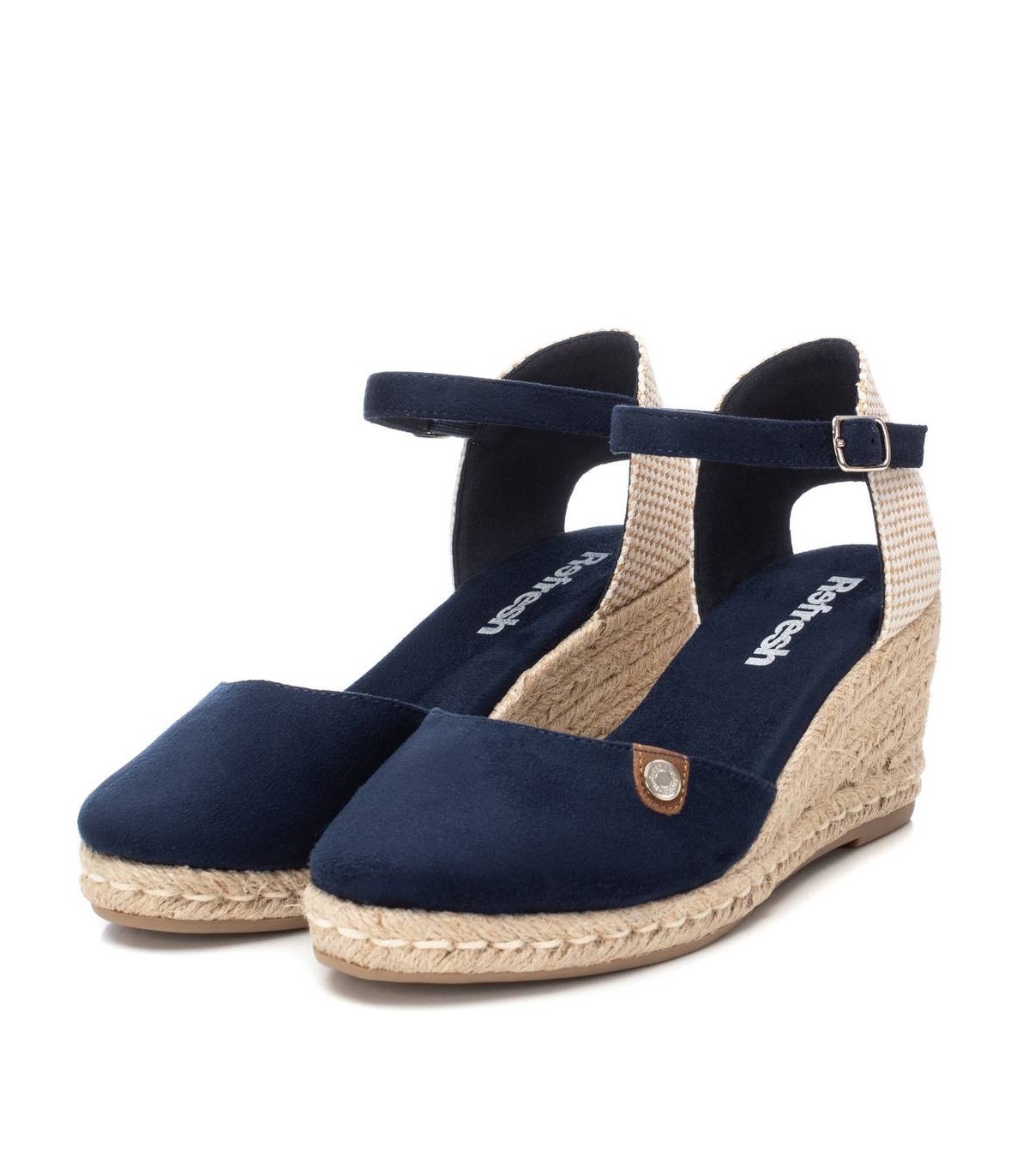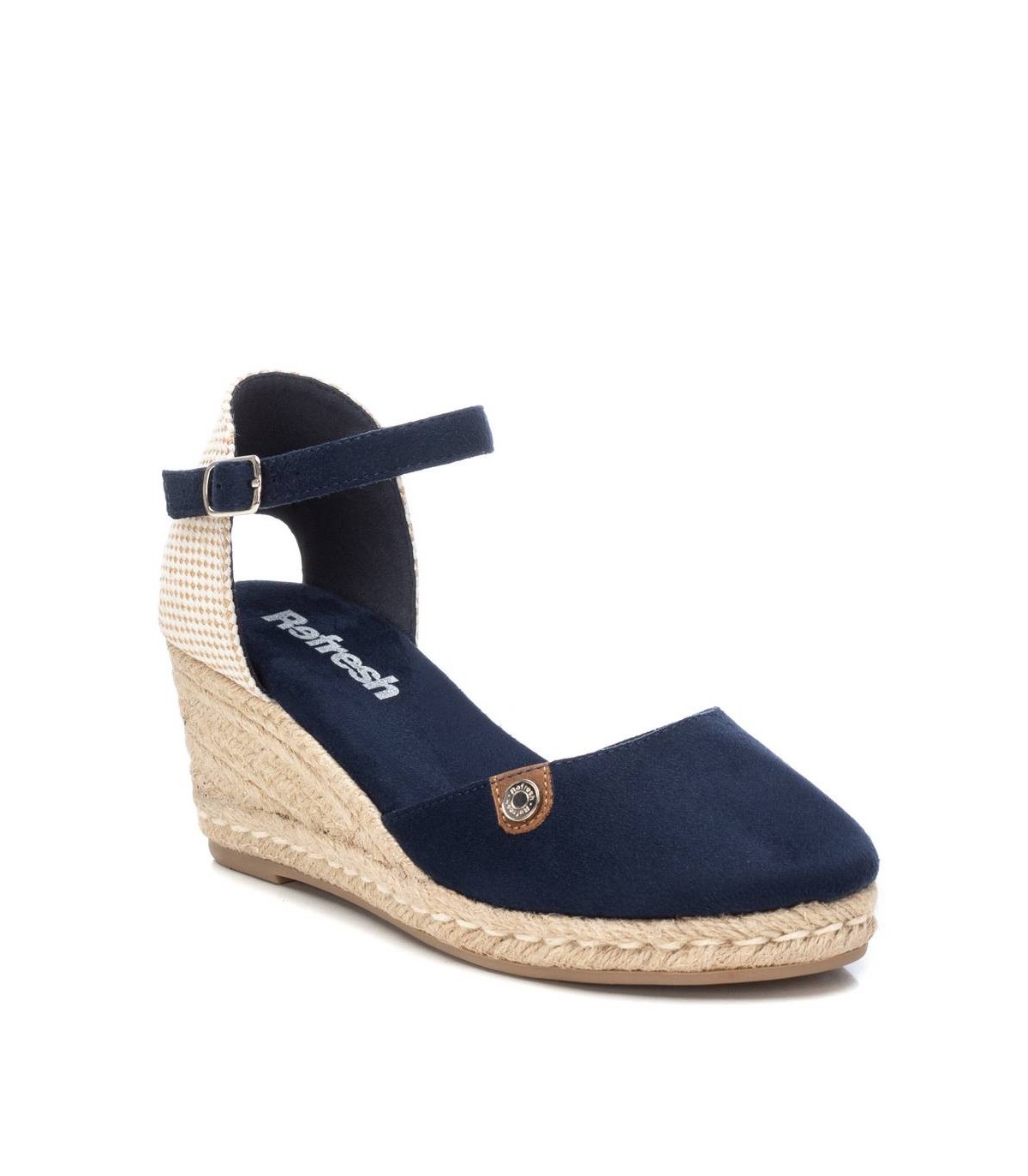Alpargata tipo valenciana de mujer, de la marca Refresh. Fabricada en suave antelina. Pulsera al tobillo con hebilla. Cuña de 6 cm de yute y suela de goma antideslizante. Este modelo ha obtenido el certificado vegano por la organización mundial PETA (Organización de los derechos de los animales).