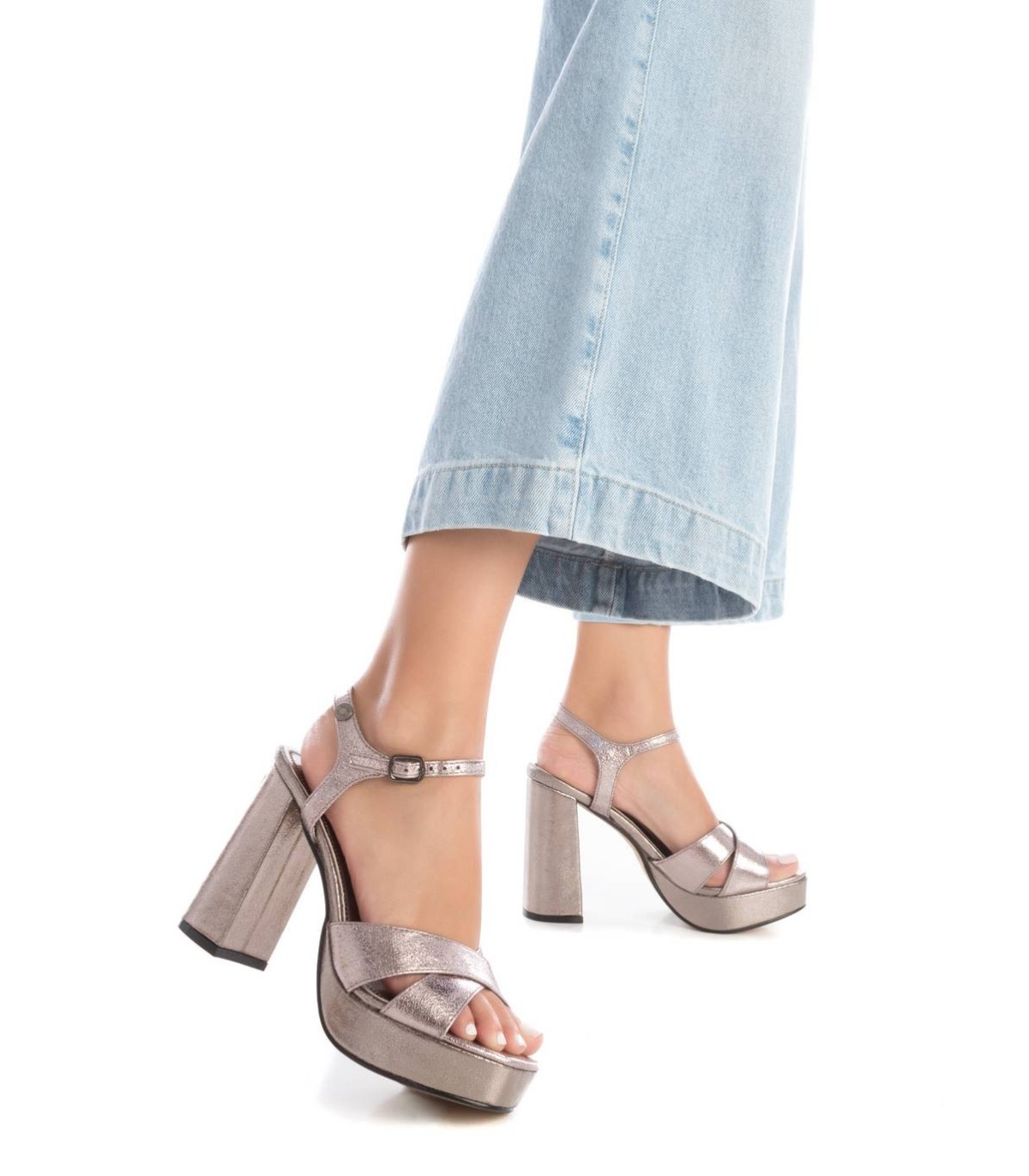 Sandalia de mujer, de la marca Refresh. Fabricada en material que imita la piel con acabado metalizado. Pala cruzada y pulsera al tobillo con hebilla para un buen ajuste. Tacón ancho de 9 cm con plataforma delantera forrado en el mismo material. Suela antideslizante. Ideales para darle un toque diferente a tus looks de fiesta. Este modelo ha obtenido el certificado vegano por la organización mundial PETA (Organización de los derechos de los animales).