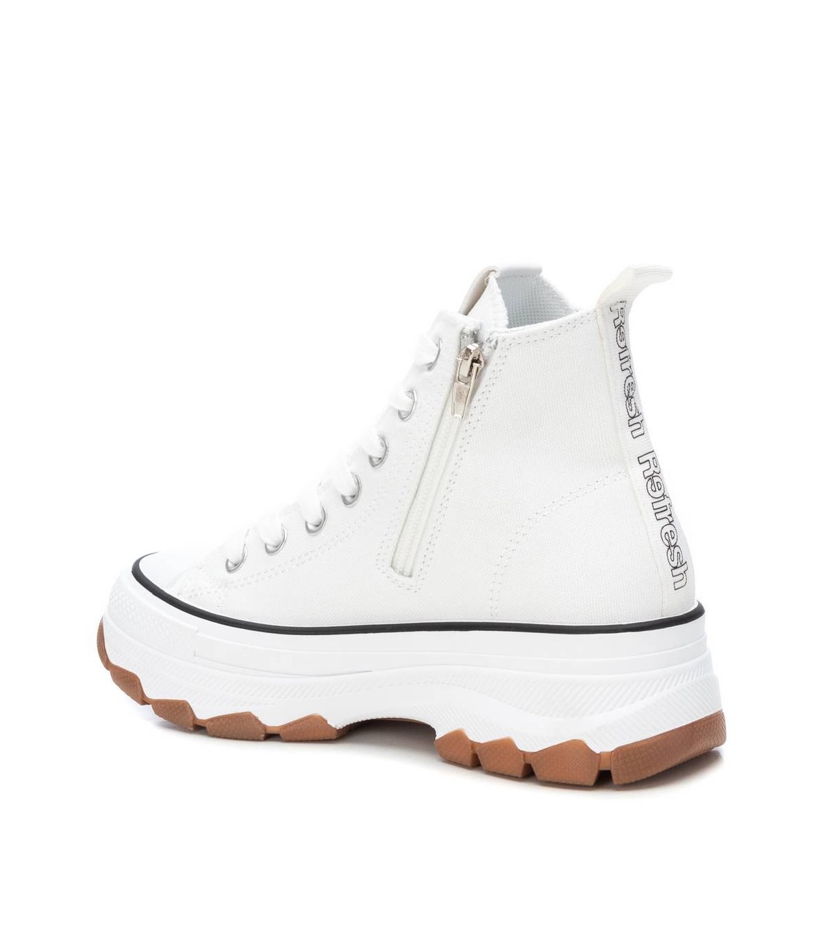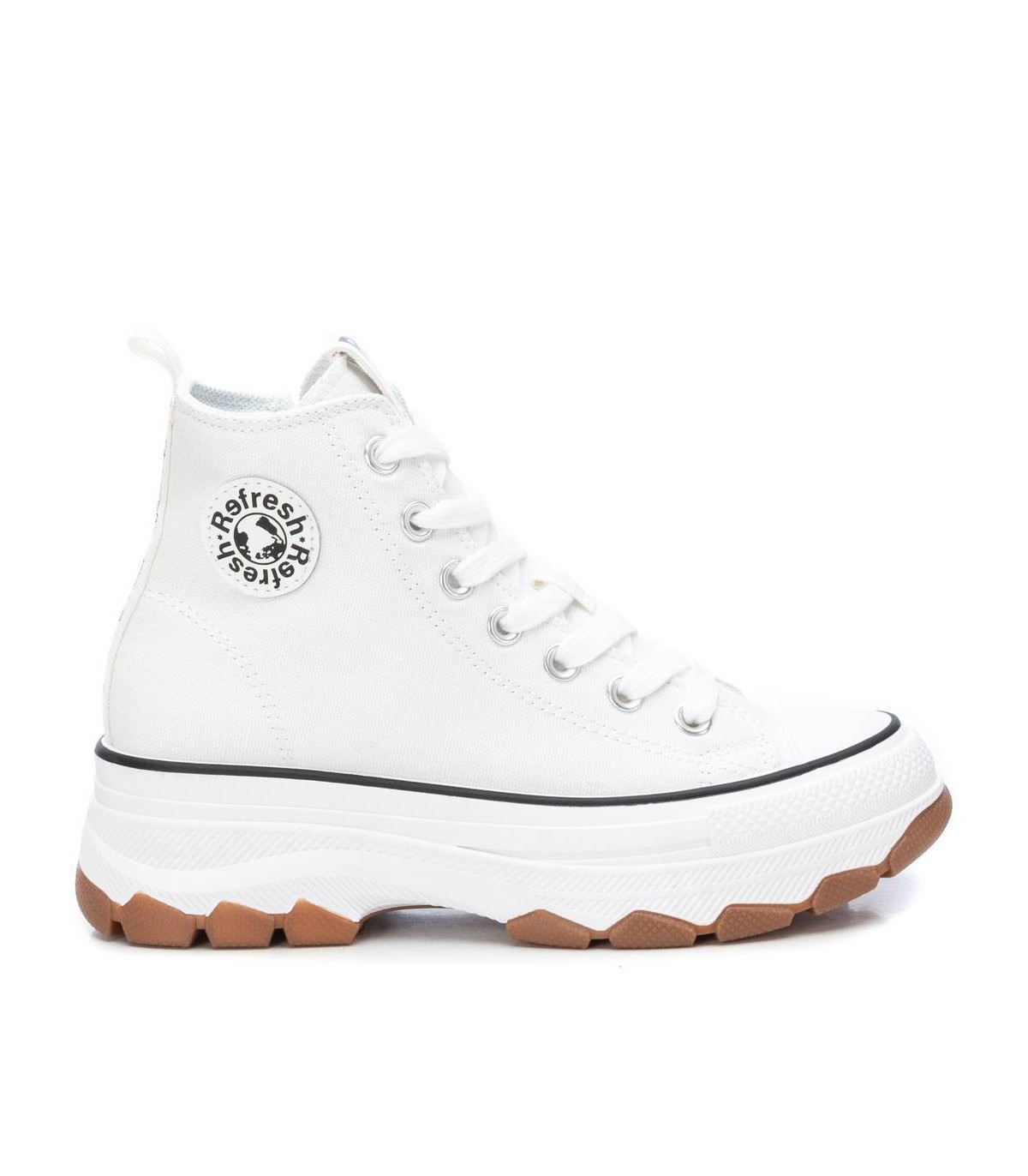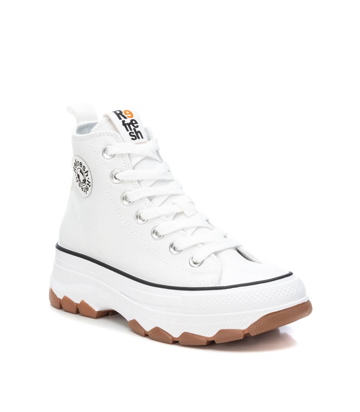 Zapatilla tipo botín de mujer, de la marca Refresh. Fabricada en lona. Cierre mediante cremallera lateral y cordones ajustables. Tirador trasero para facilitar la puesta. Piso volumen con suela dentada de goma antideslizante. Este modelo ha obtenido el certificado vegano por la organización mundial PETA (Organización de los derechos de los animales).