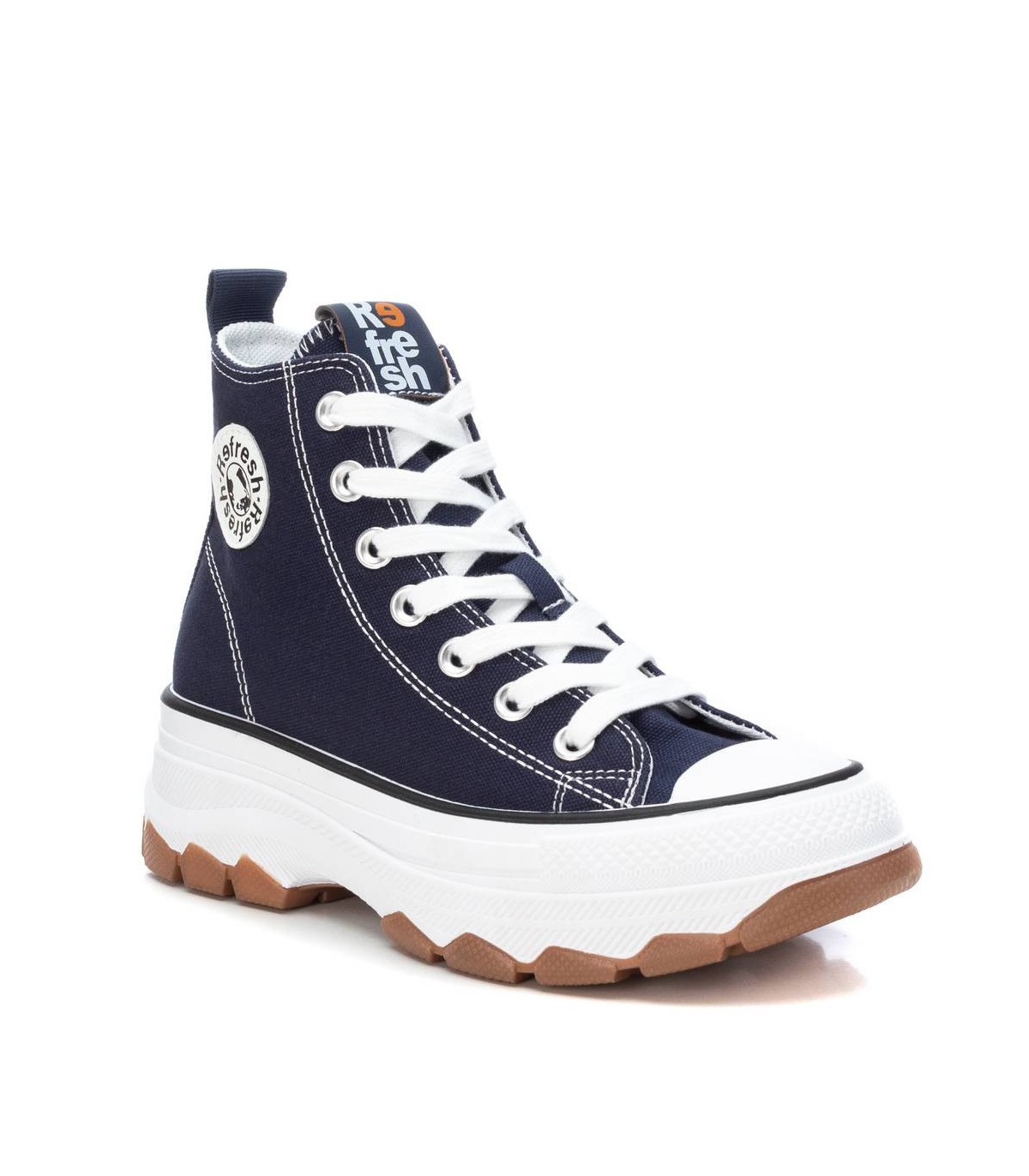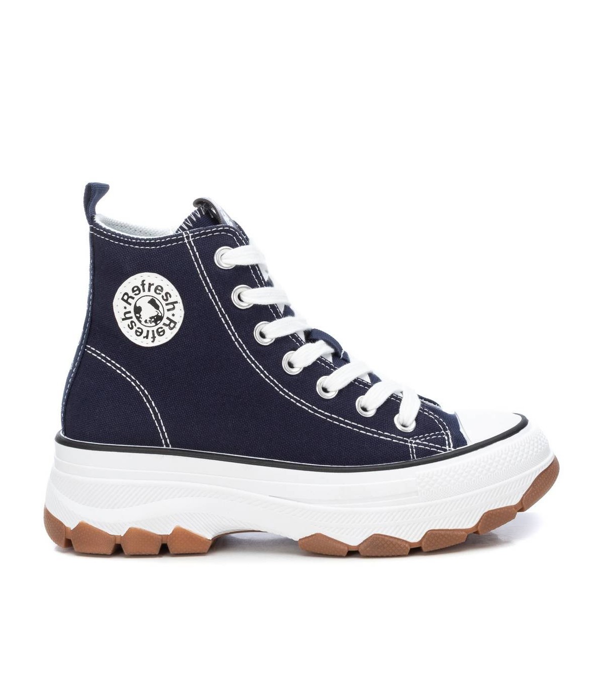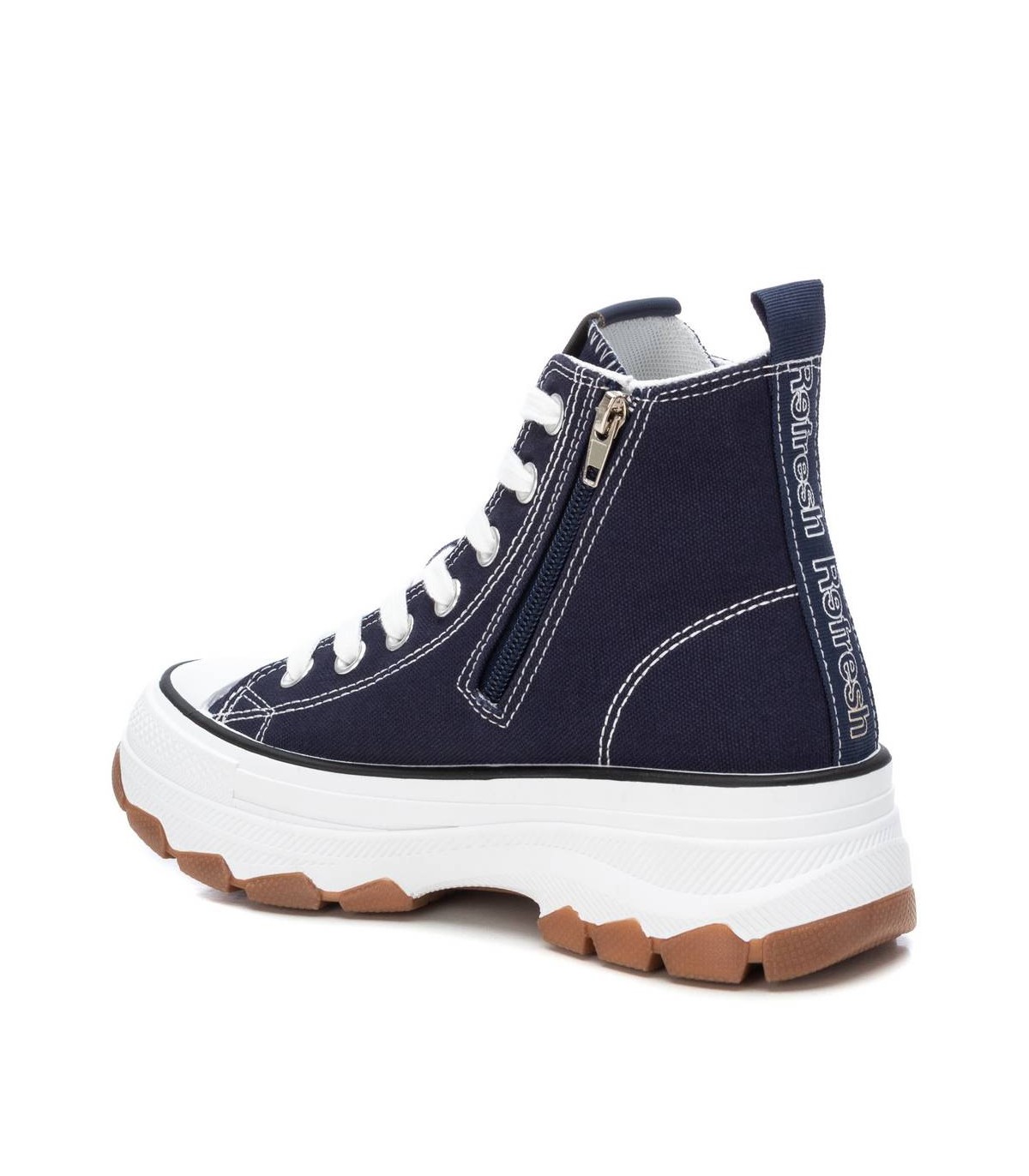 Zapatilla tipo botín de mujer, de la marca Refresh. Fabricada en lona. Cierre mediante cremallera lateral y cordones ajustables. Tirador trasero para facilitar la puesta. Piso volumen con suela dentada de goma antideslizante. Este modelo ha obtenido el certificado vegano por la organización mundial PETA (Organización de los derechos de los animales).