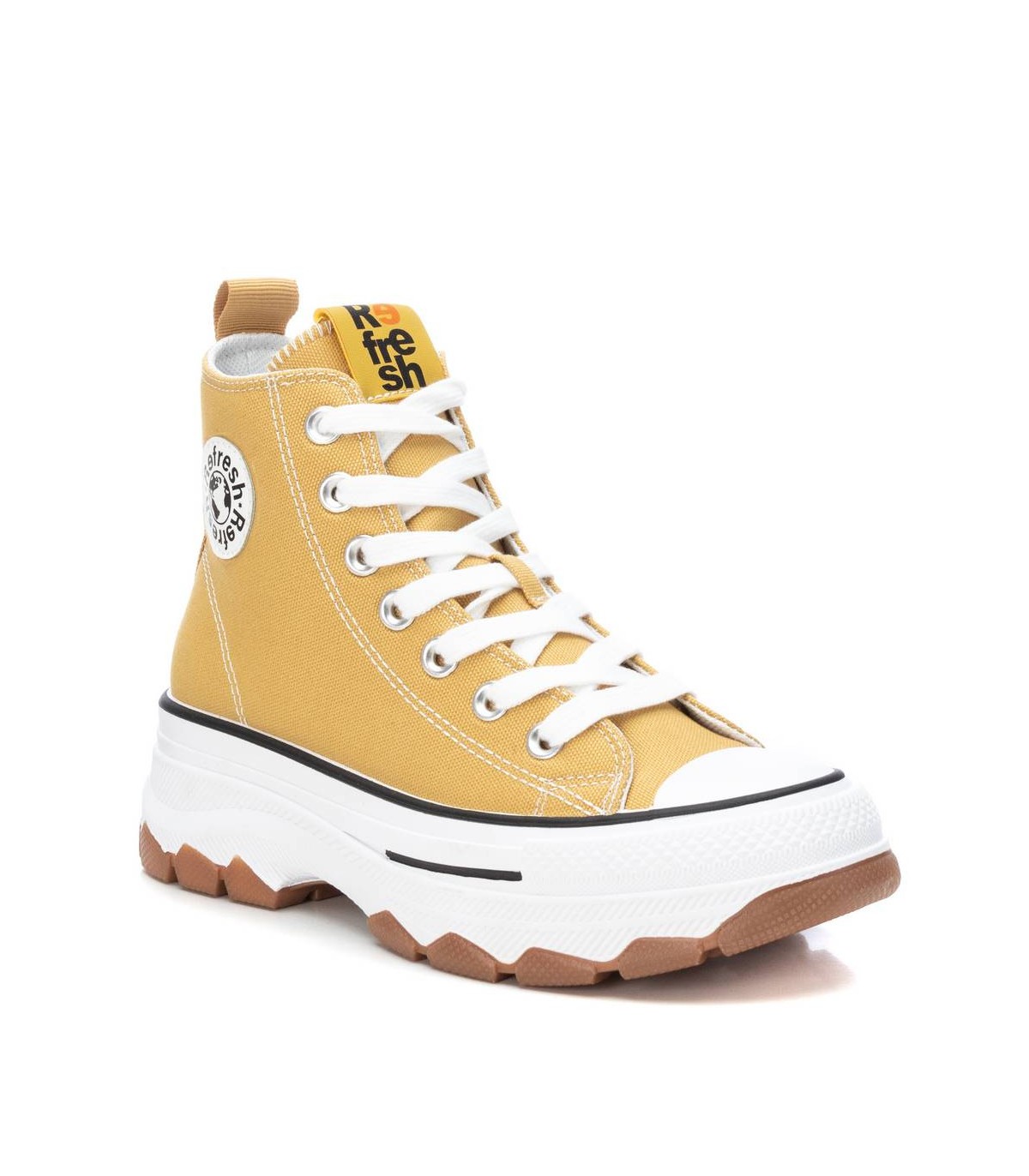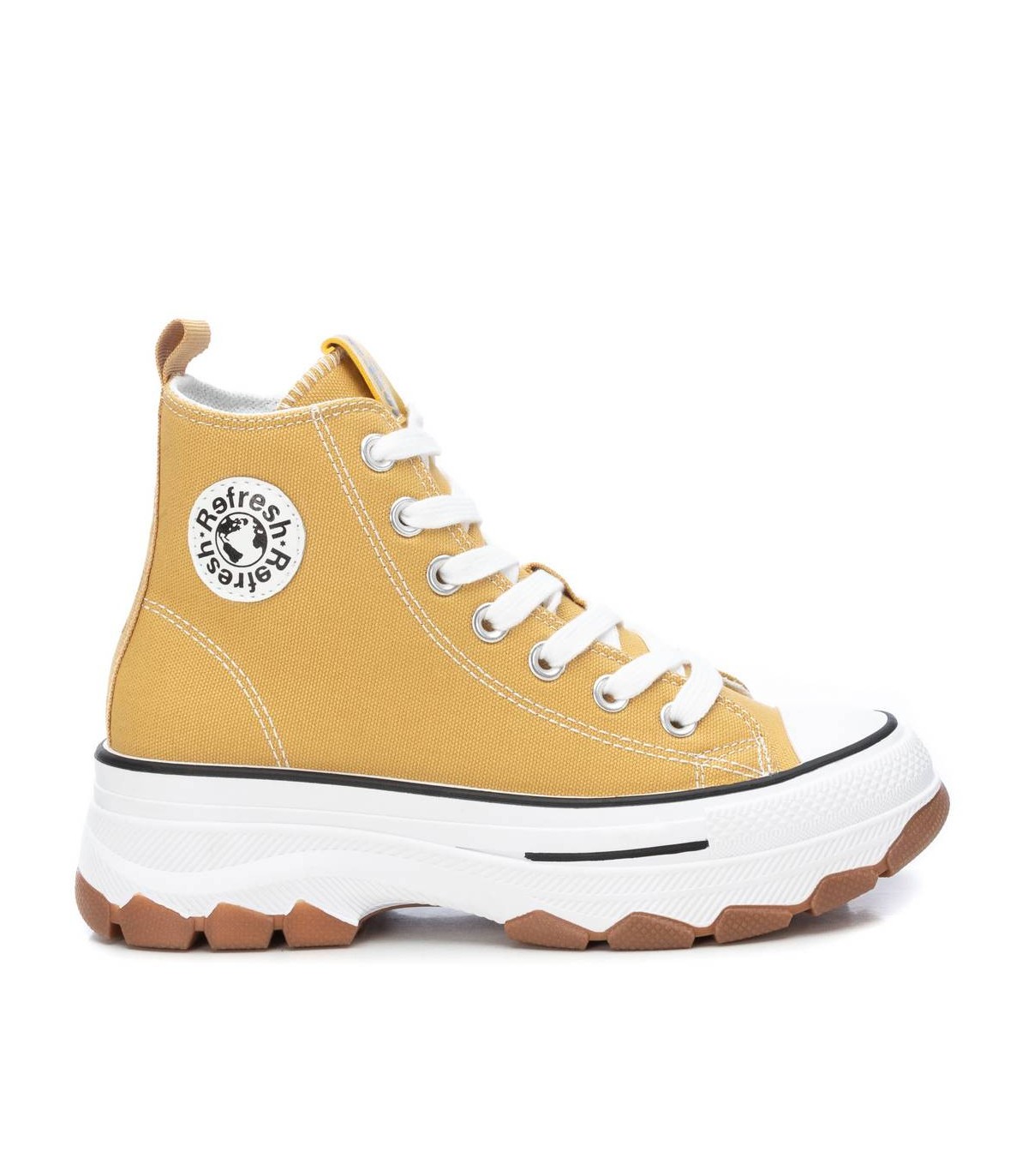 Zapatilla tipo botín de mujer, de la marca Refresh. Fabricada en lona. Cierre mediante cremallera lateral y cordones ajustables. Tirador trasero para facilitar la puesta. Piso volumen con suela dentada de goma antideslizante. Este modelo ha obtenido el certificado vegano por la organización mundial PETA (Organización de los derechos de los animales).