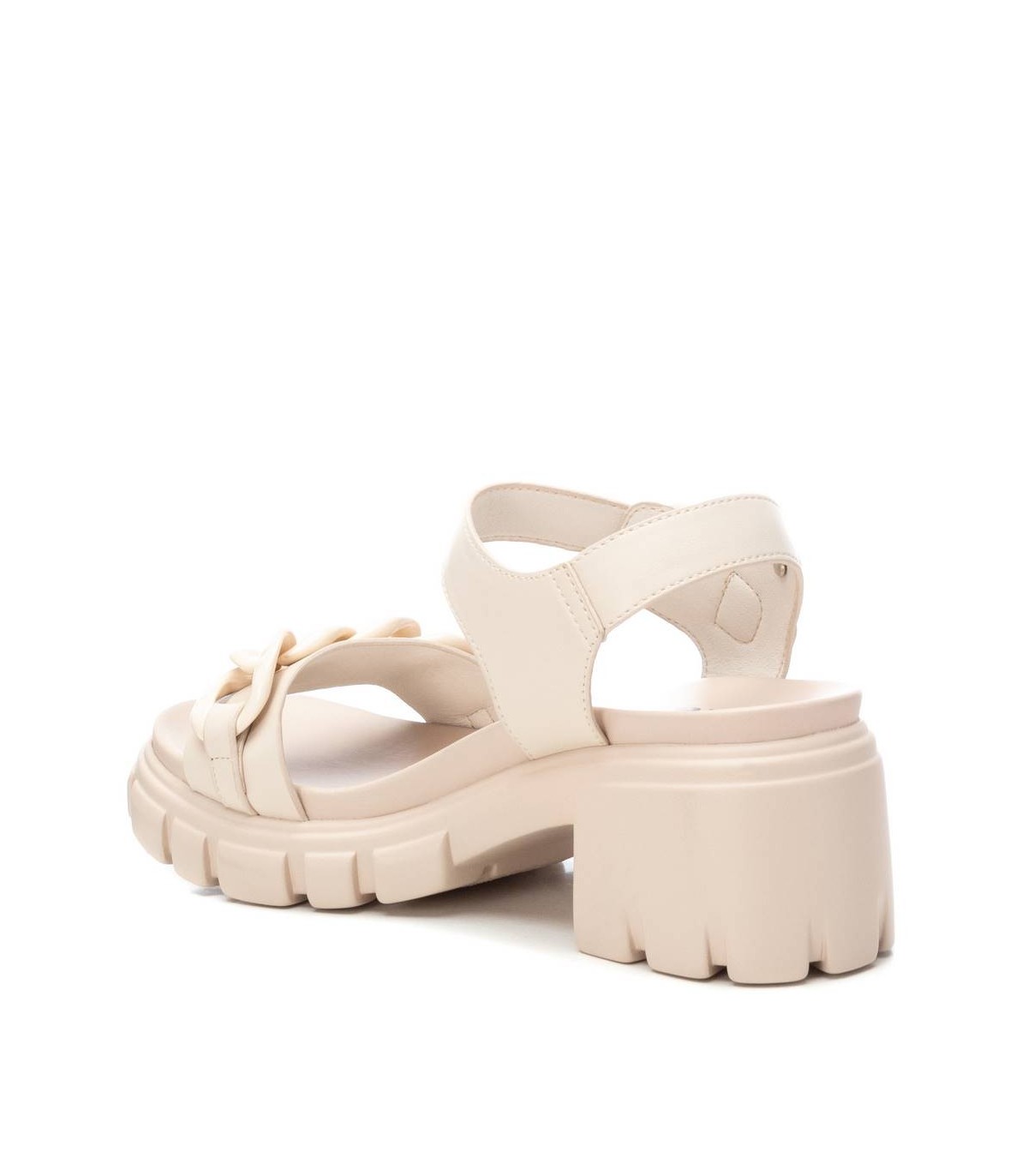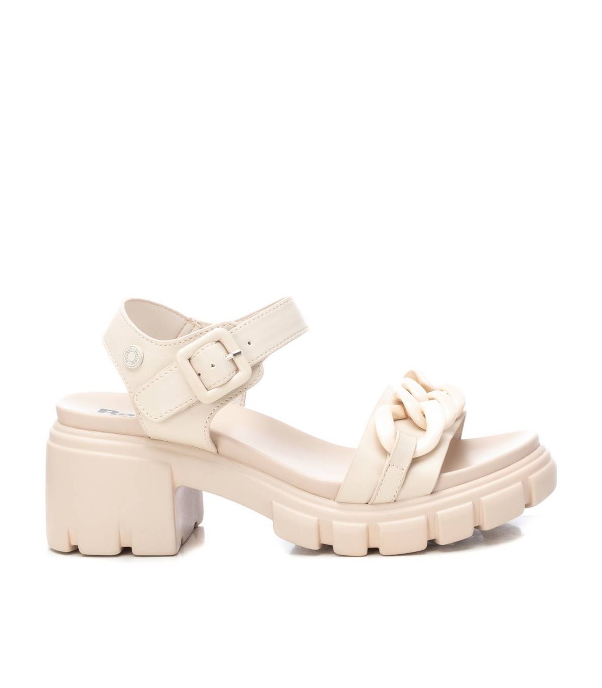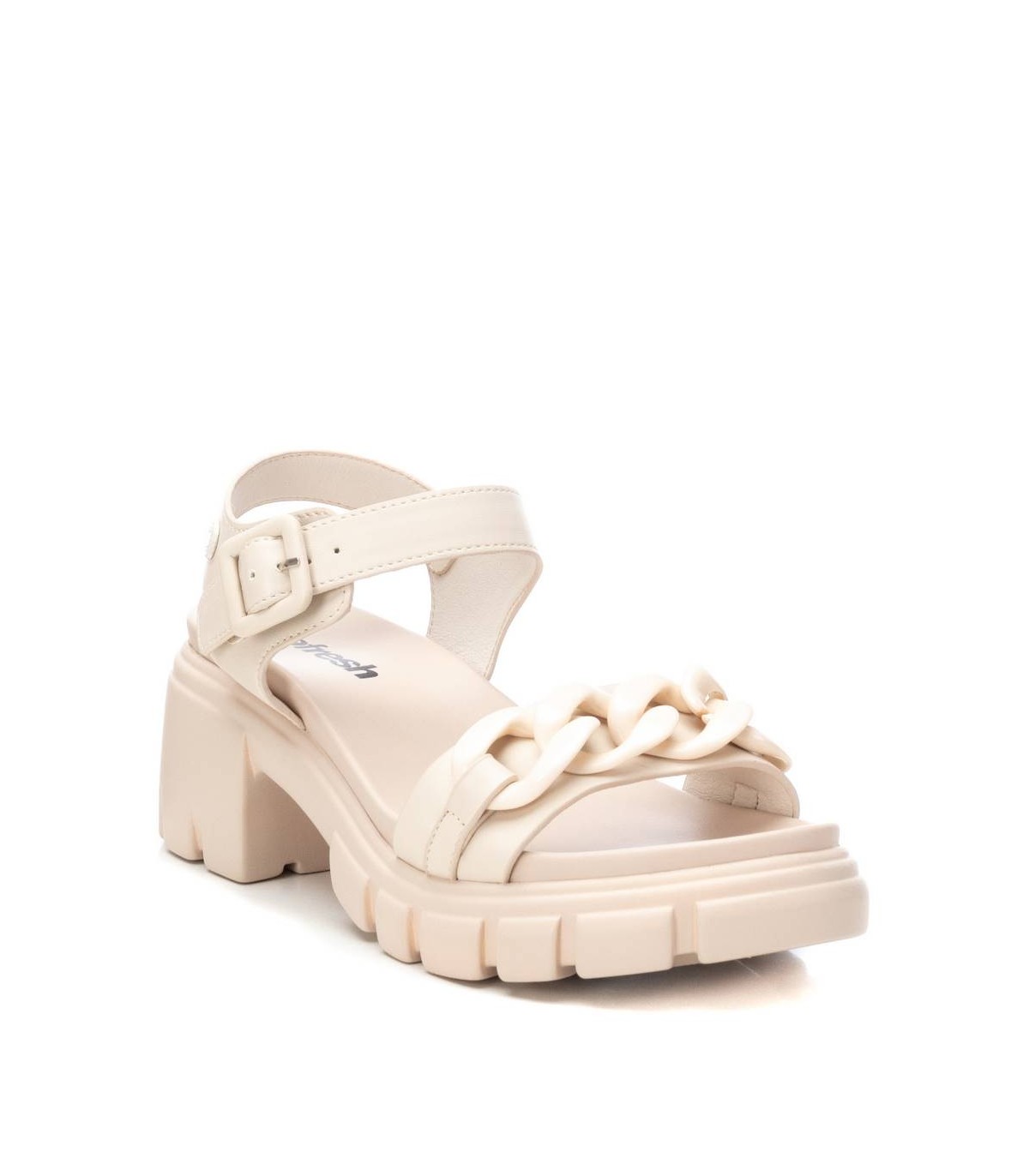 Sandalia de mujer, de la marca Refresh. Fabricada en material que imita la piel. Cadena decorativa en la pala. Pulsera al tobillo con cierre de hebilla. Tacón ancho de 6 cm con plataforma delantera. Suela dentada antideslizante. Este modelo ha obtenido el certificado vegano por la organización mundial PETA (Organización de los derechos de los animales).