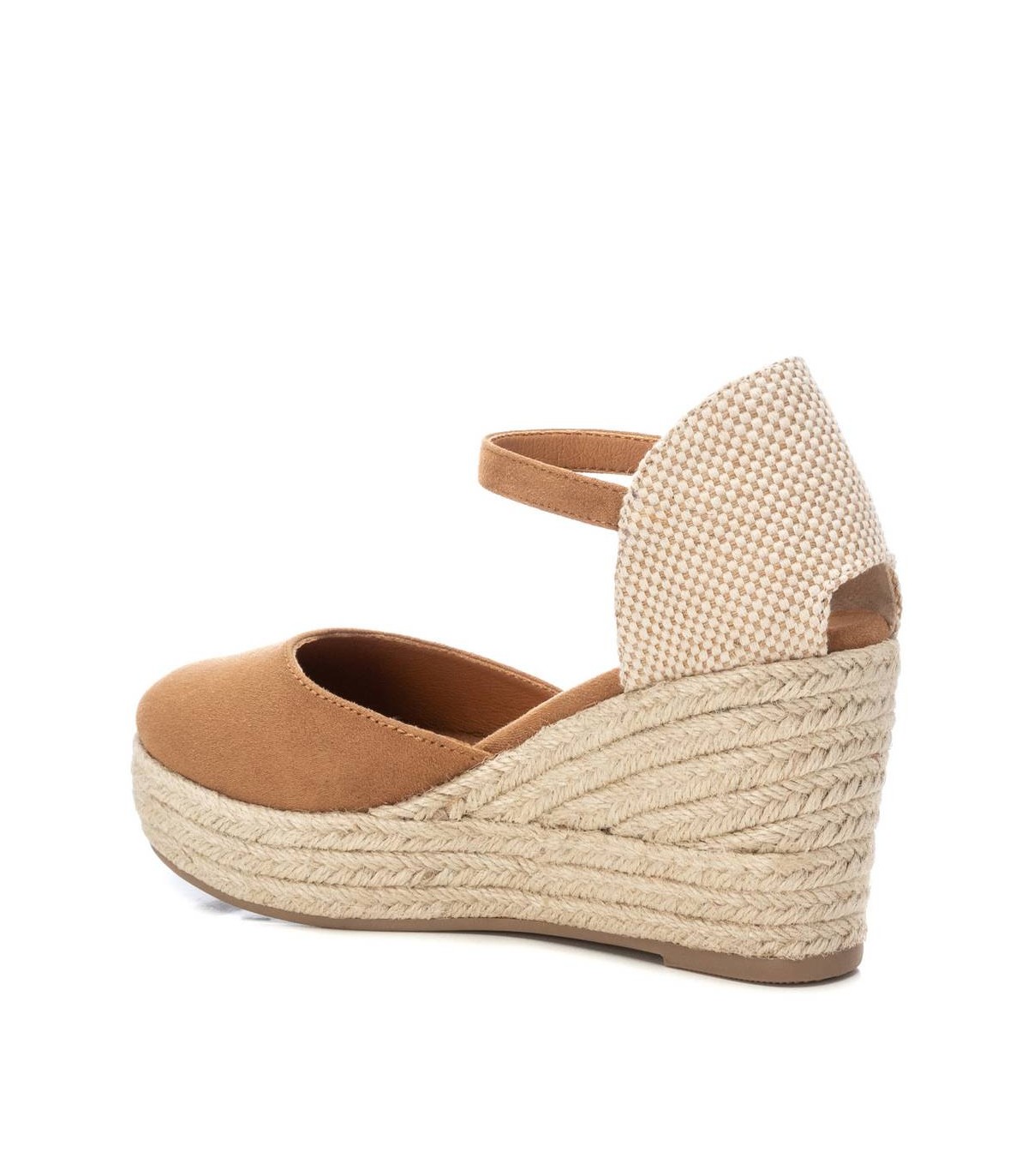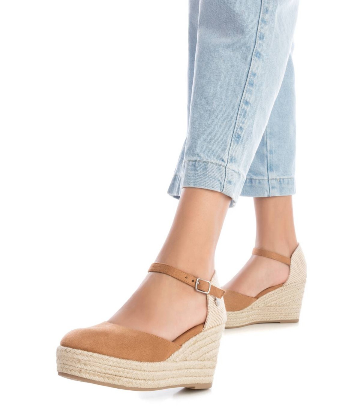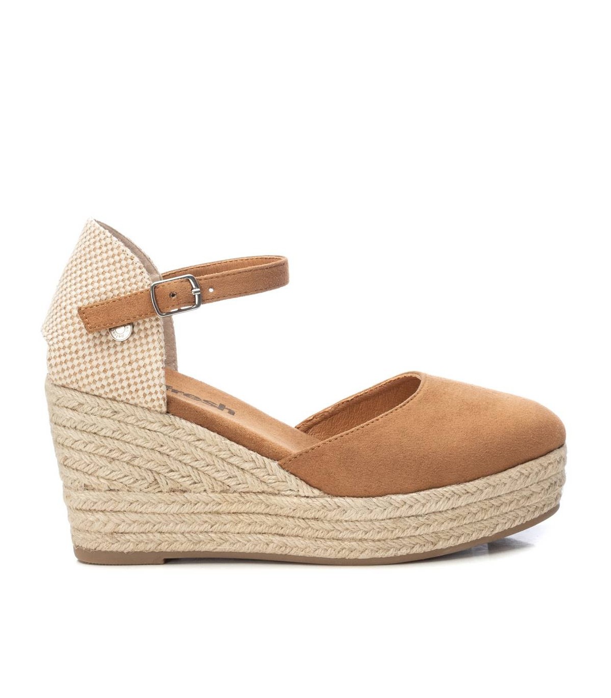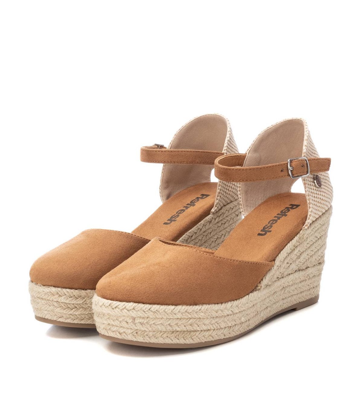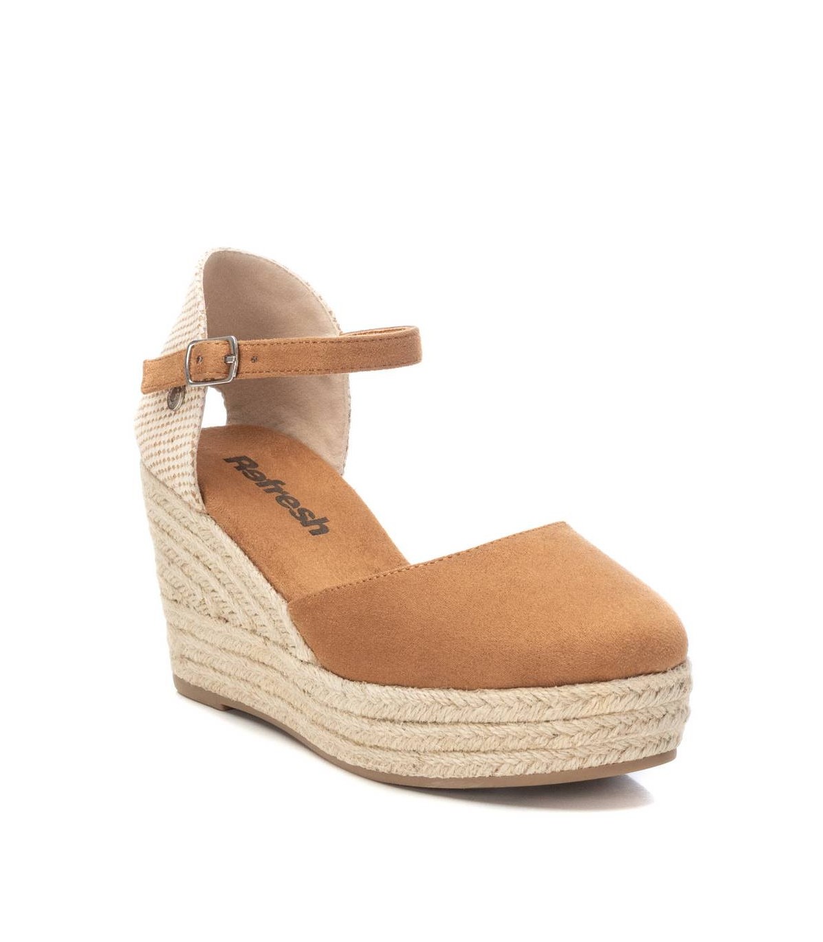 Alpargata tipo valenciana de mujer, de la marca Refresh. Fabricada en suave antelina. Pulsera al tobillo con hebilla. Cuña de 8 cm de yute y suela de goma antideslizante. Este modelo ha obtenido el certificado vegano por la organización mundial PETA (Organización de los derechos de los animales).