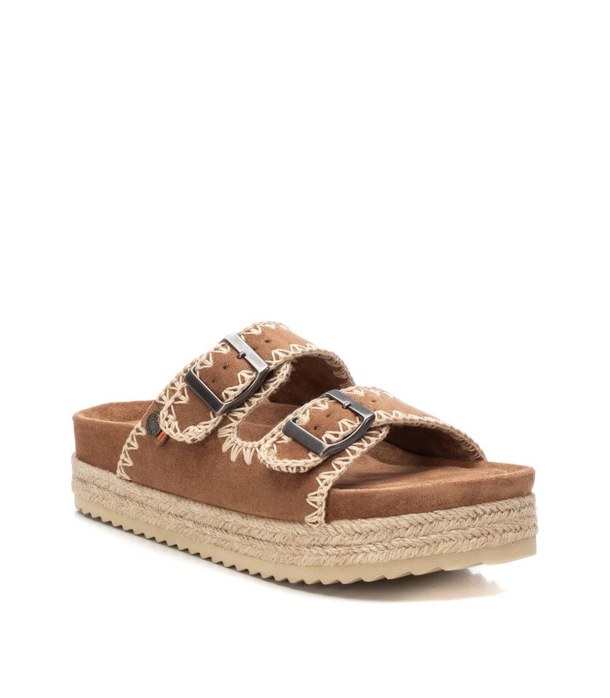 Sandalia de mujer, de la marca Refresh. Fabricada en suave antelina. Modelo de doble pala con hebillas ajustables. Planta bios forrada con el mismo material que el corte. Piso forrado en yute trenzado y suela antideslizante. Este modelo ha obtenido el certificado vegano por la organización mundial PETA (Organización de los derechos de los animales).