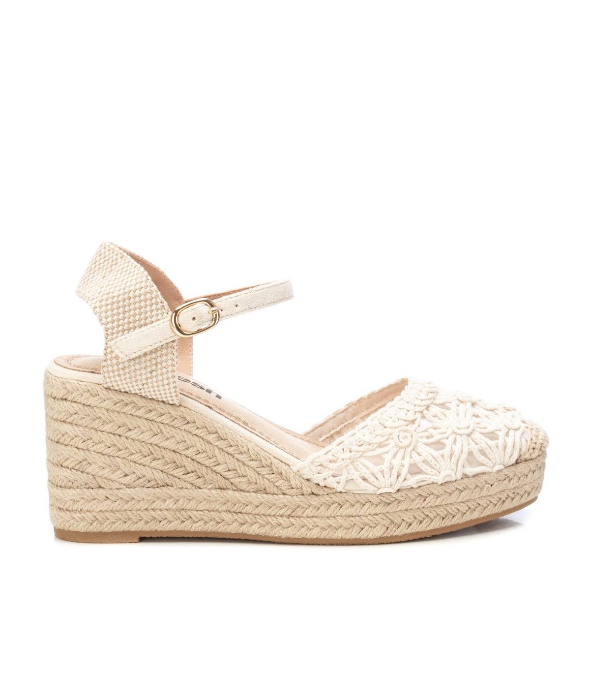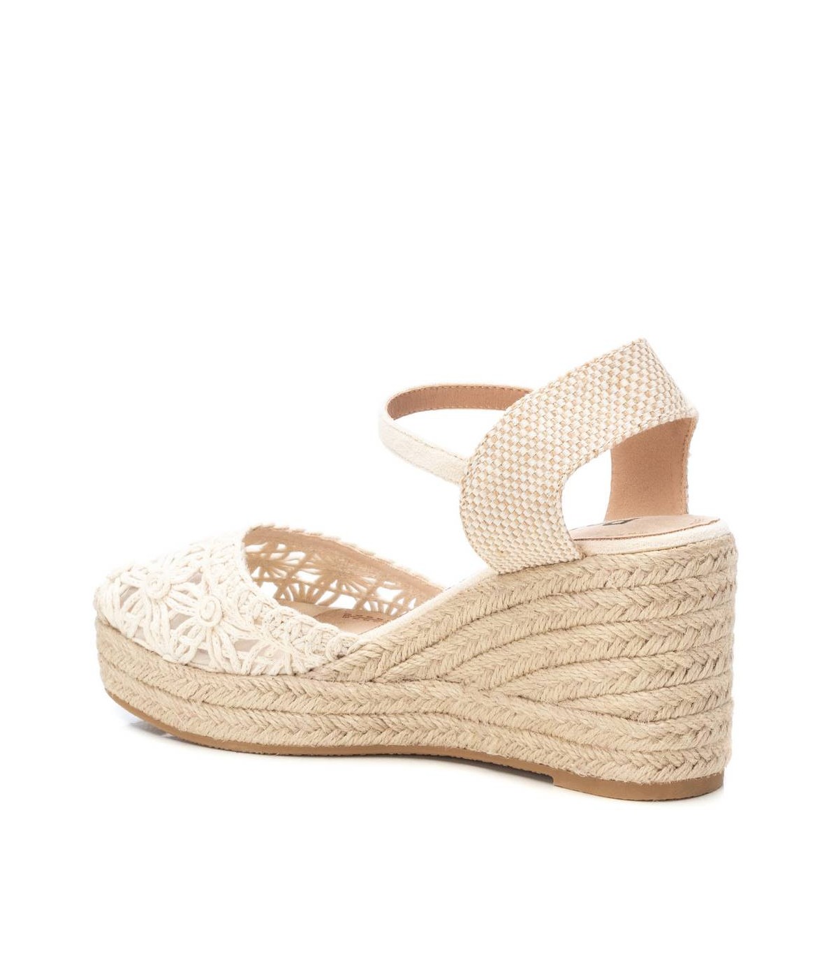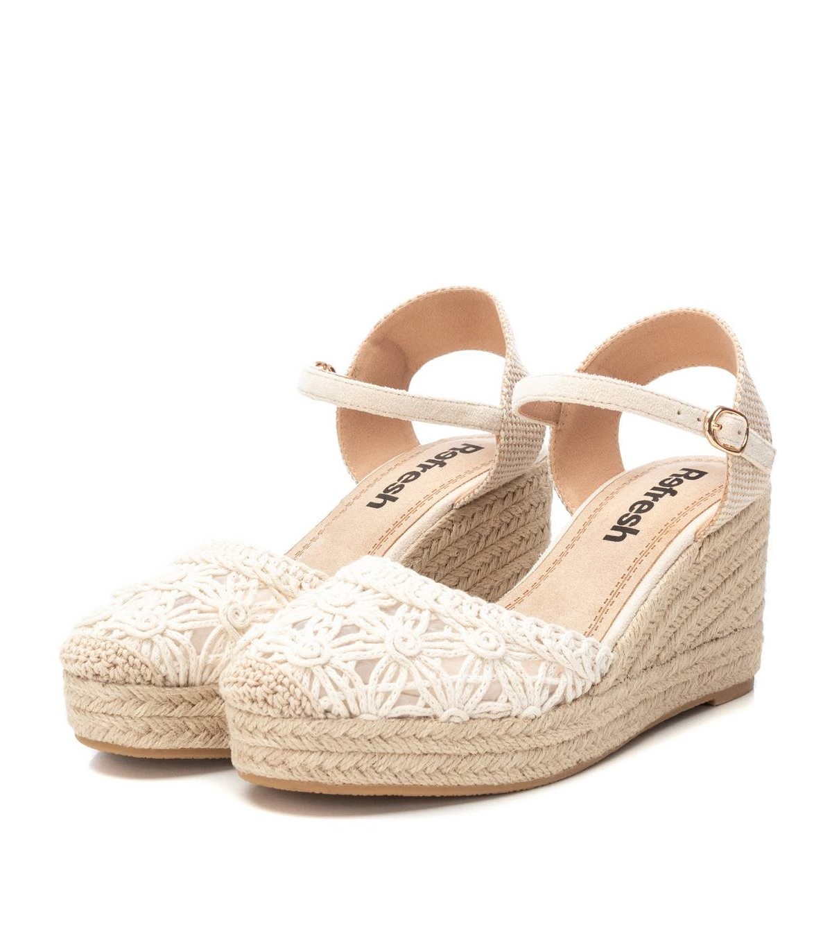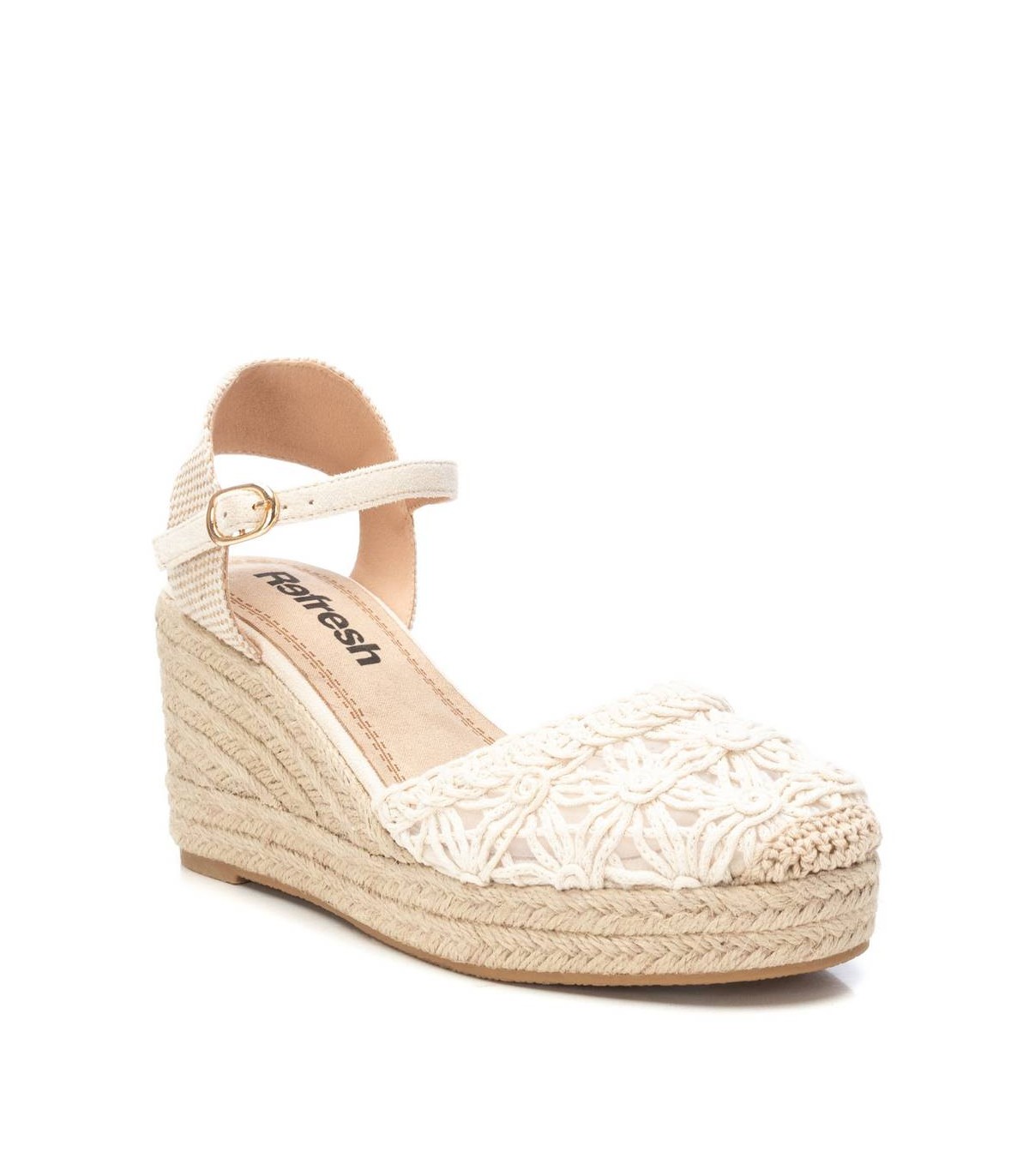 Alpargata tipo valenciana de mujer, de la marca Refresh. Fabricada en textil estilo crochet. Pulsera al tobillo con hebilla. Cuña de 8 cm de yute y suela de goma antideslizante. Este modelo ha obtenido el certificado vegano por la organización mundial PETA (Organización de los derechos de los animales).