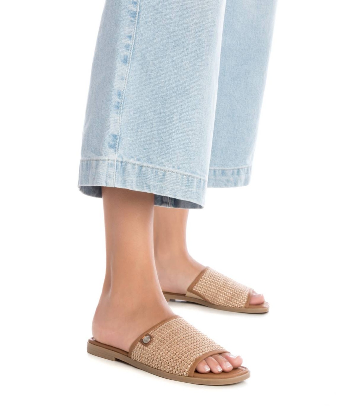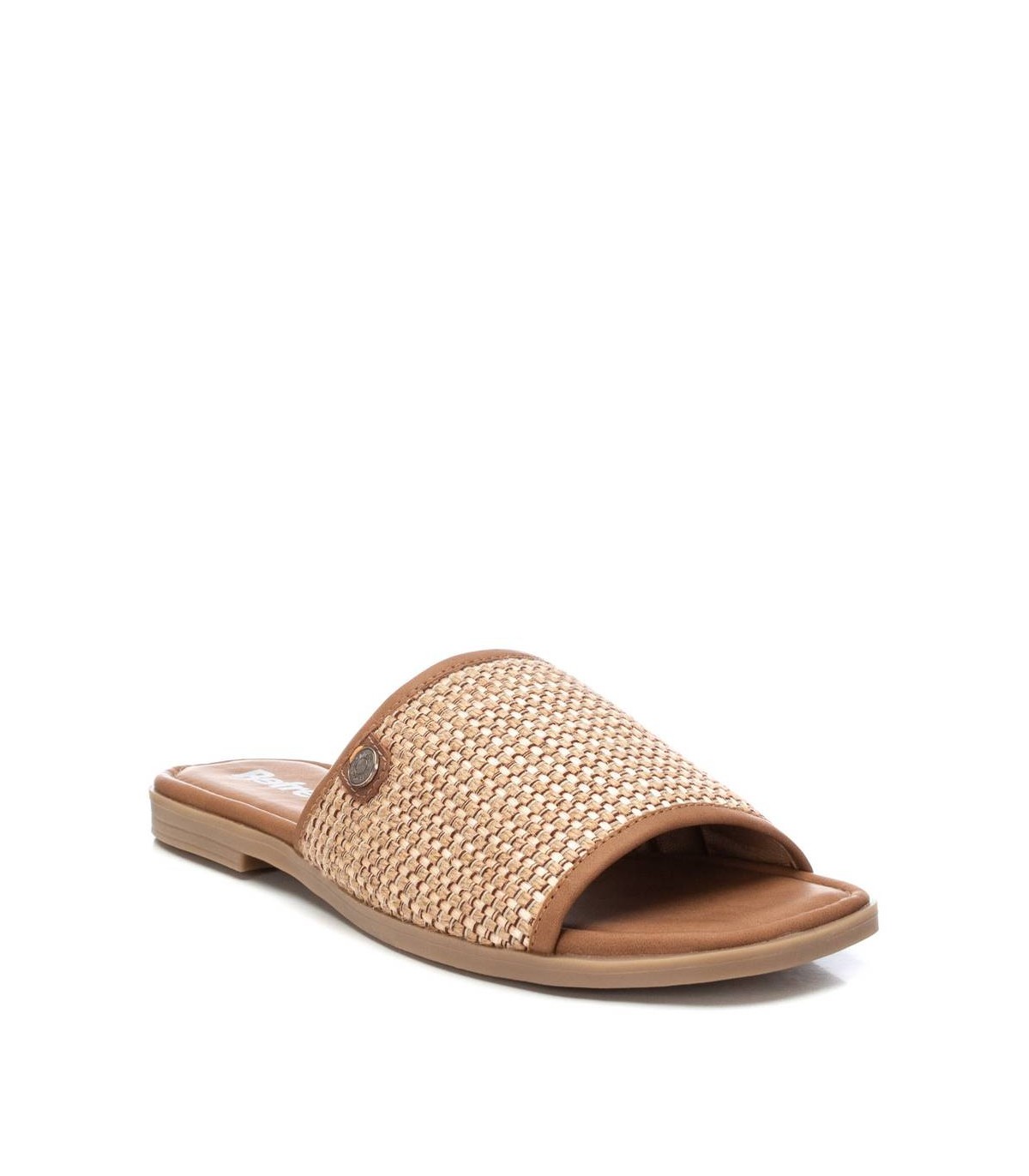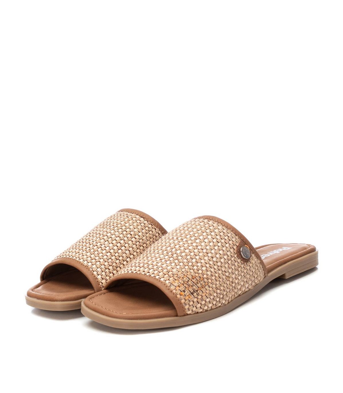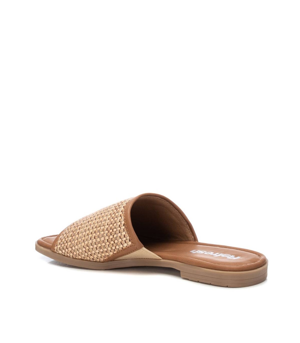 Sandalia de mujer, de la marca Refresh. Fabricada en rafia con ribete en material que imita la piel. Diseño de pala ancha destalonado. Planta acolchada y suela flexible de goma antideslizante. Este modelo ha obtenido el certificado vegano por la organización mundial PETA (Organización de los derechos de los animales).