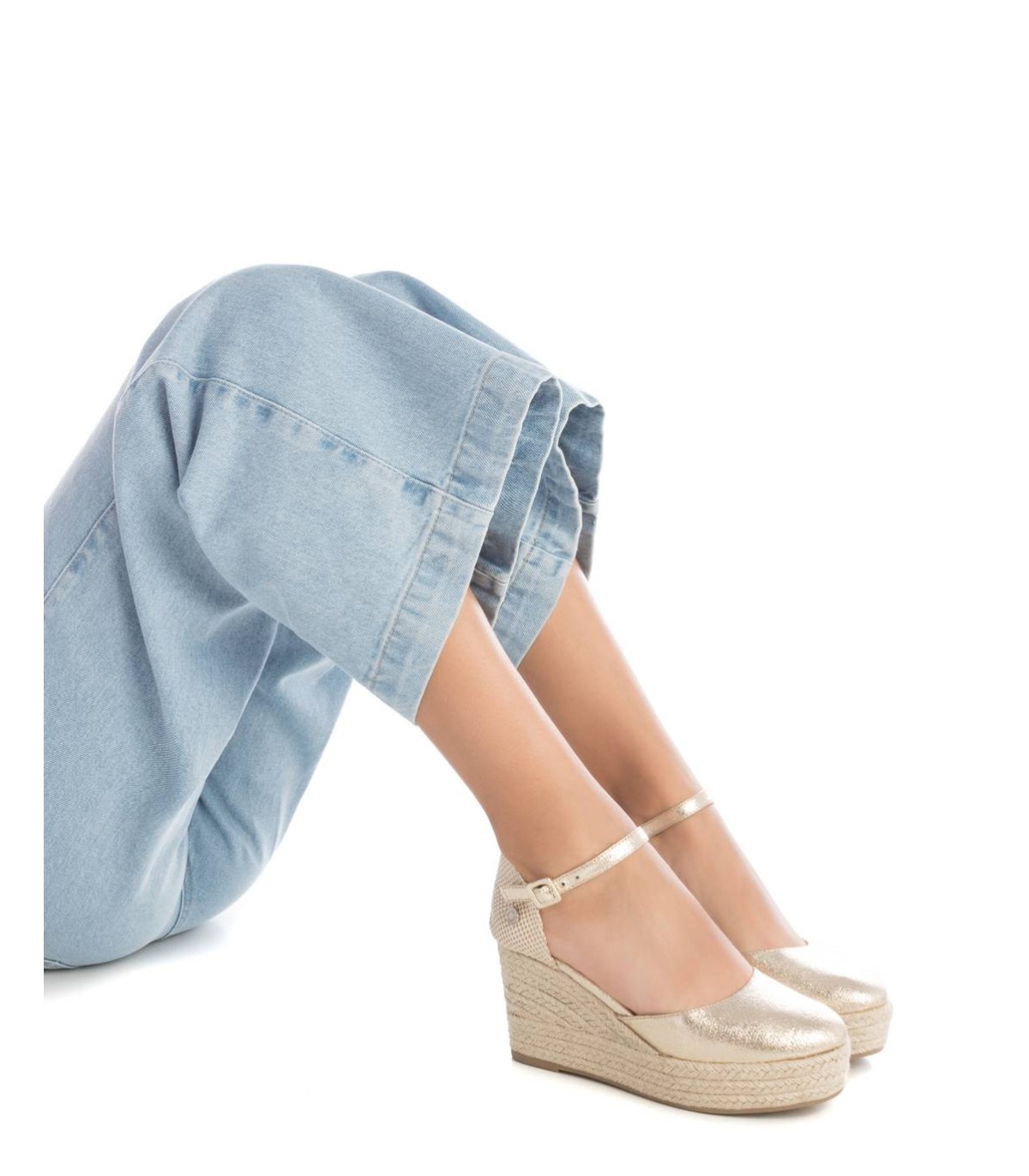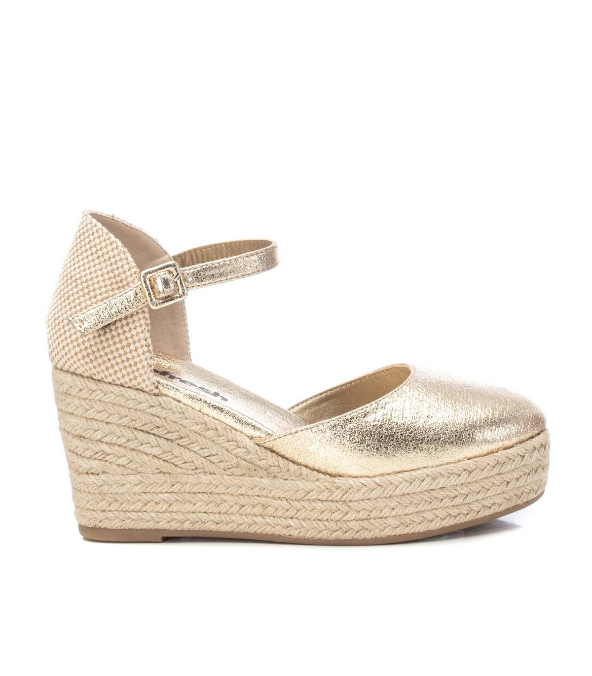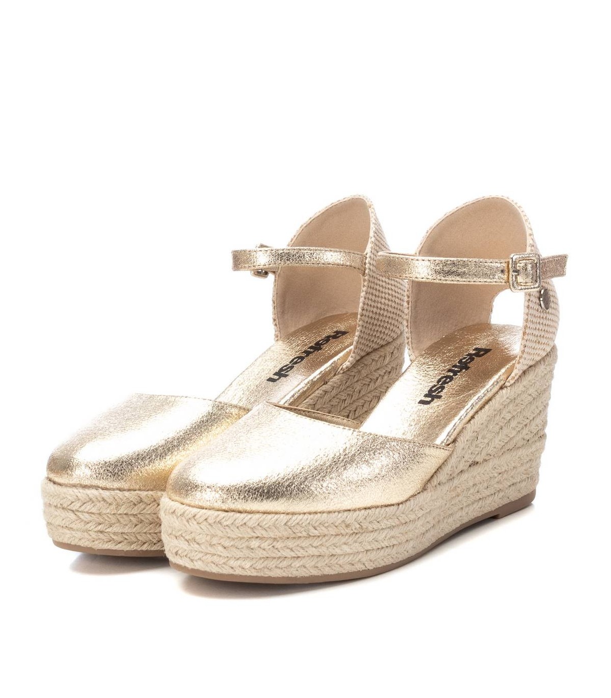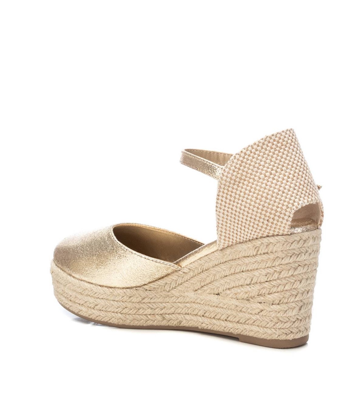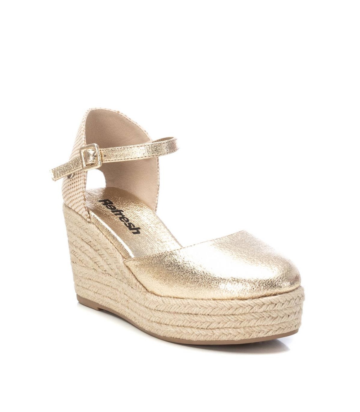 Alpargata tipo valenciana de mujer, de la marca Refresh. Fabricada en material que imita la piel con efecto metalizado. Pulsera al tobillo con hebilla. Cuña de 8 cm de yute y suela de goma antideslizante. Este modelo ha obtenido el certificado vegano por la organización mundial PETA (Organización de los derechos de los animales).