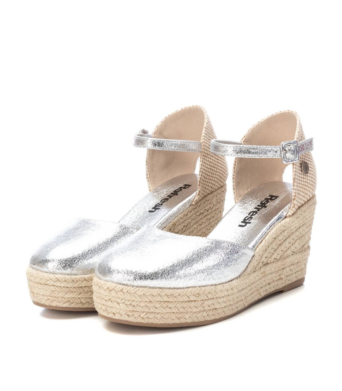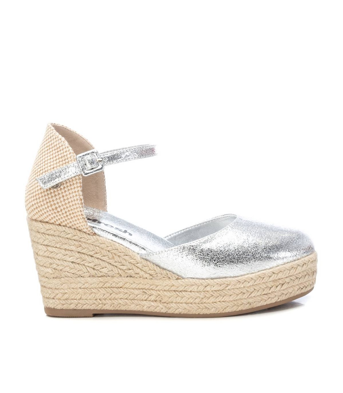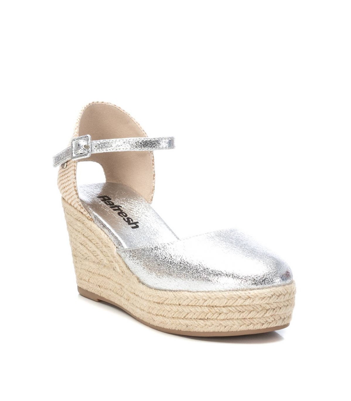 Alpargata tipo valenciana de mujer, de la marca Refresh. Fabricada en material que imita la piel con efecto metalizado. Pulsera al tobillo con hebilla. Cuña de 8 cm de yute y suela de goma antideslizante. Este modelo ha obtenido el certificado vegano por la organización mundial PETA (Organización de los derechos de los animales).