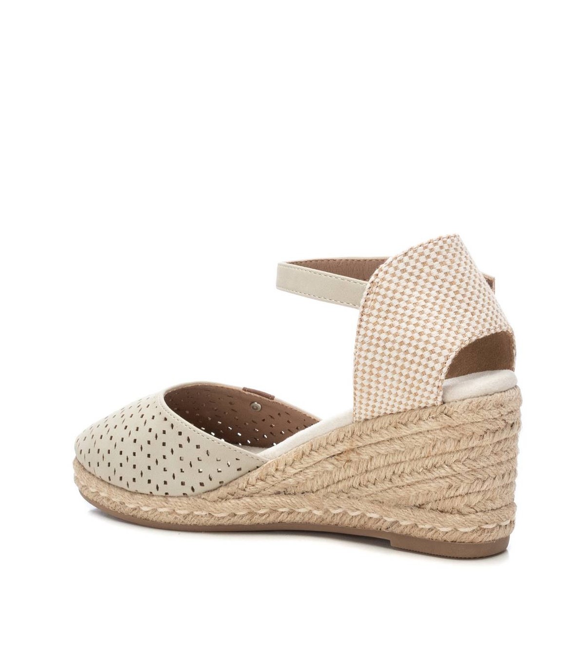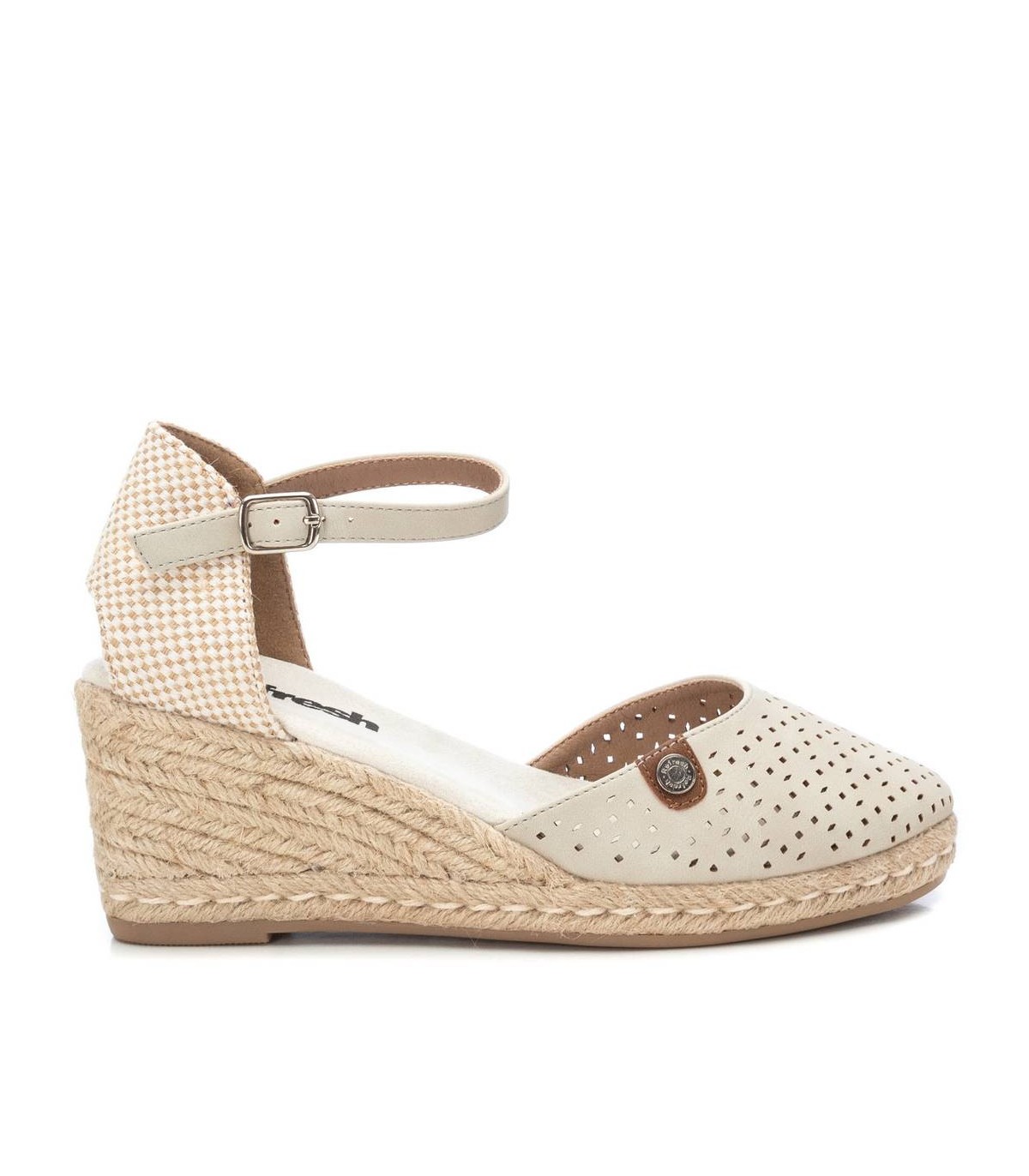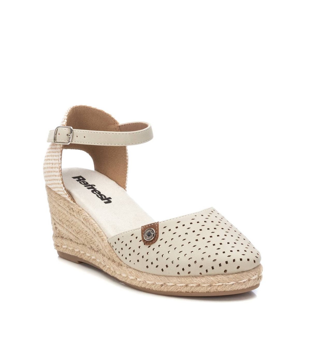 Alpargata tipo valenciana de mujer, de la marca Refresh. Fabricada en material que imita la piel con diseño troquelado. Pulsera al tobillo con hebilla. Cuña de 7 cm de yute y suela de goma antideslizante. Este modelo ha obtenido el certificado vegano por la organización mundial PETA (Organización de los derechos de los animales).