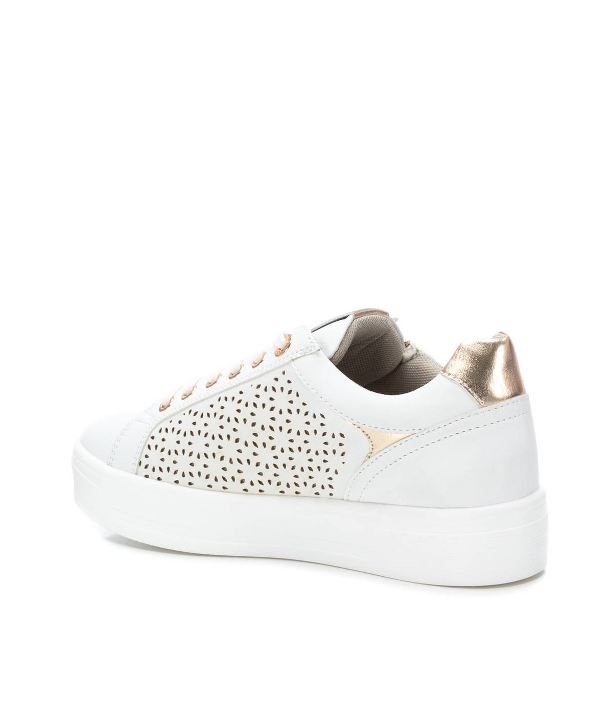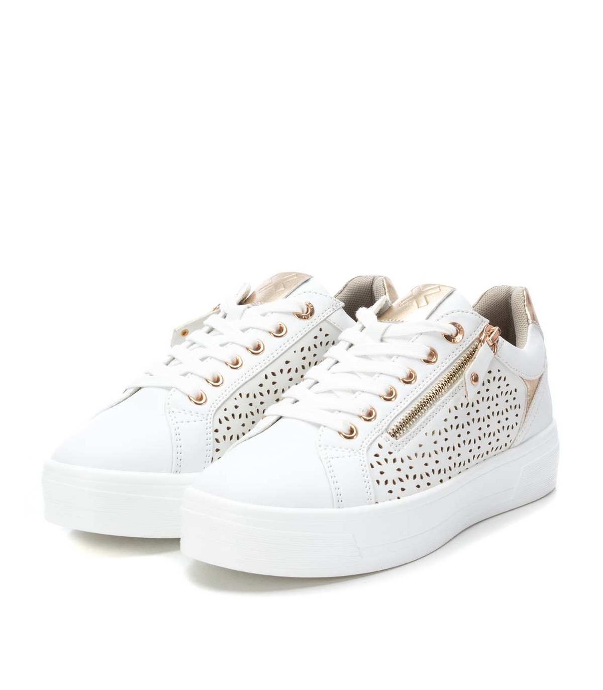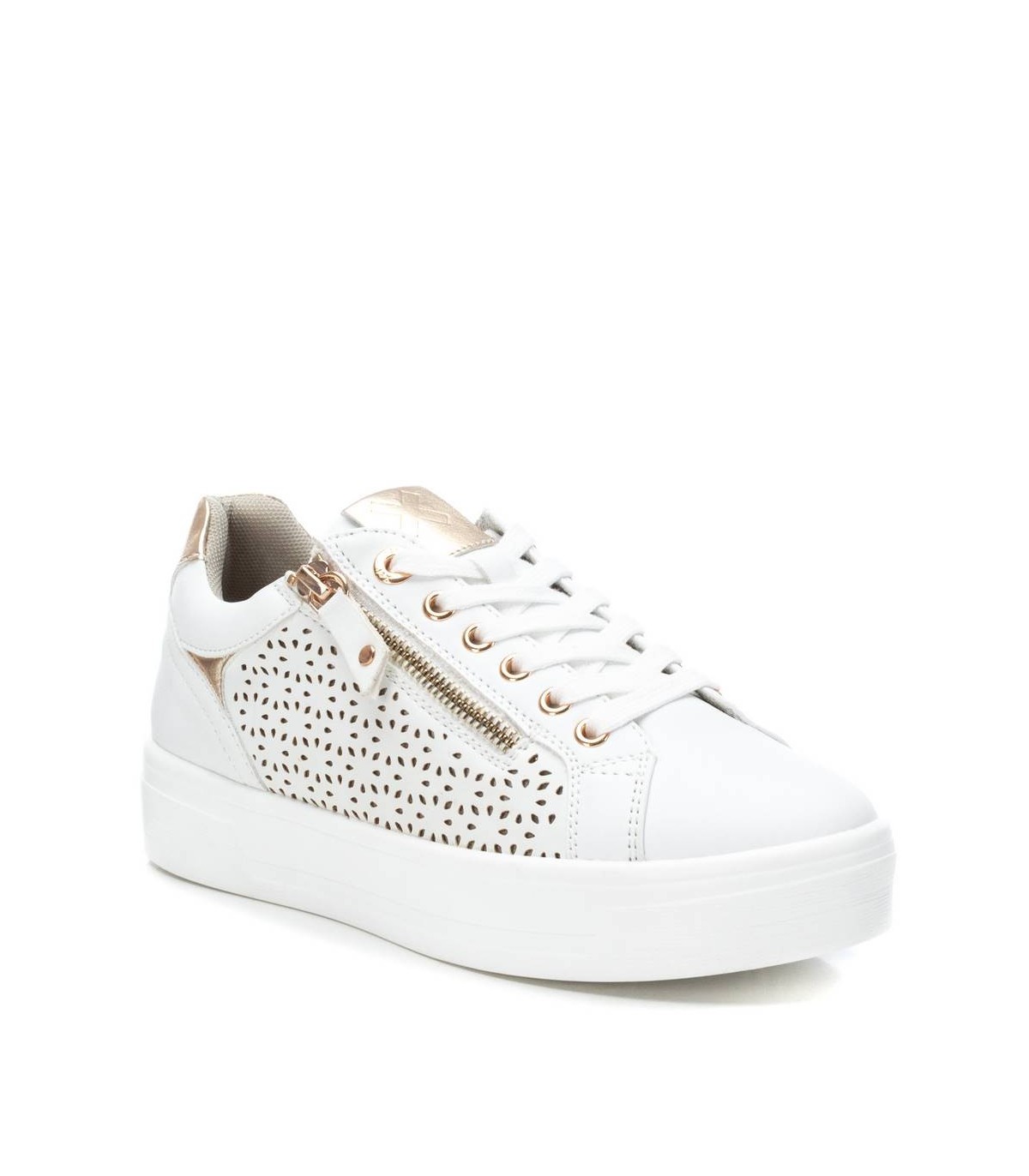 Zapatilla de mujer, de la marca Xti. Fabricada en material que imita a la piel con lateral troquelado. Cierre mediante cremallera en el lateral, con cordones decorativos. Bonita suela de goma antideslizante. Este modelo ha obtenido el certificado vegano por la organización mundial PETA (Organización de los derechos de los animales).