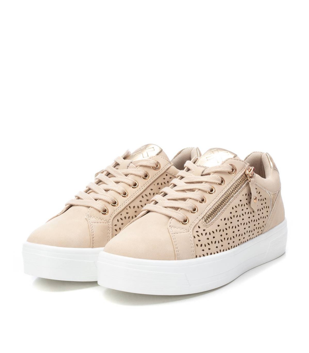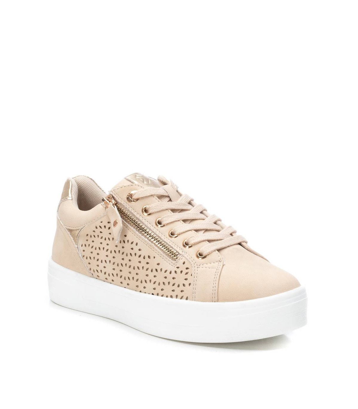 Zapatilla de mujer, de la marca Xti. Fabricada en material que imita a la piel con lateral troquelado. Cierre mediante cremallera en el lateral, con cordones decorativos. Bonita suela de goma antideslizante. Este modelo ha obtenido el certificado vegano por la organización mundial PETA (Organización de los derechos de los animales).