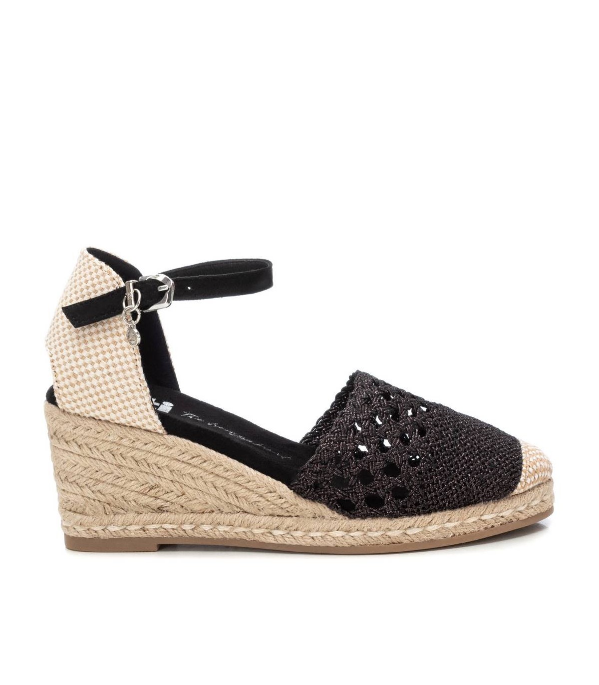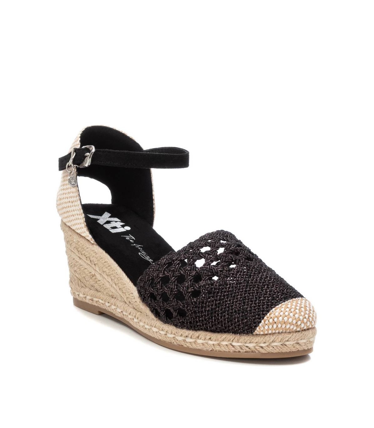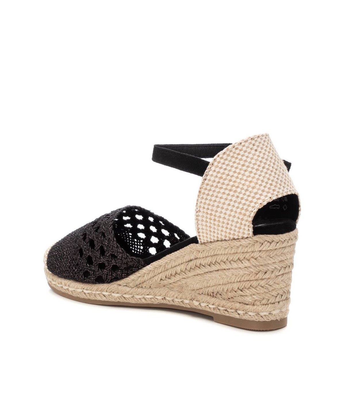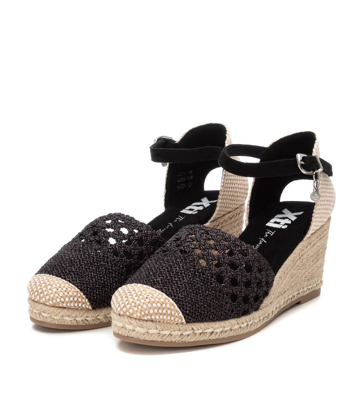 Zapato de mujer con cuña, tipo valenciana, de la marca Xti. Fabricado en tejido de ganchillo, este modelo te acompañará en todos tus looks del verano. Pulsera al tobillo con cierre de hebilla. Cuña de 6 cm forrada en yute y suela de goma antideslizante. Este modelo ha obtenido el certificado vegano por la organización mundial PETA (Organización de los derechos de los animales).
