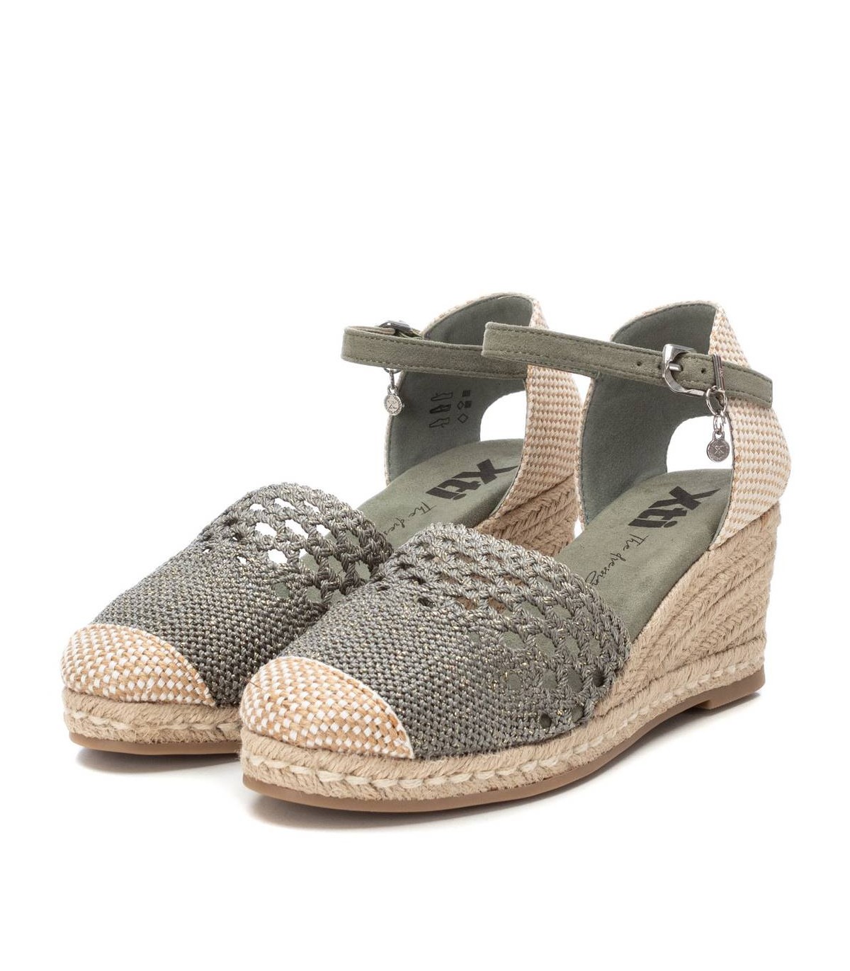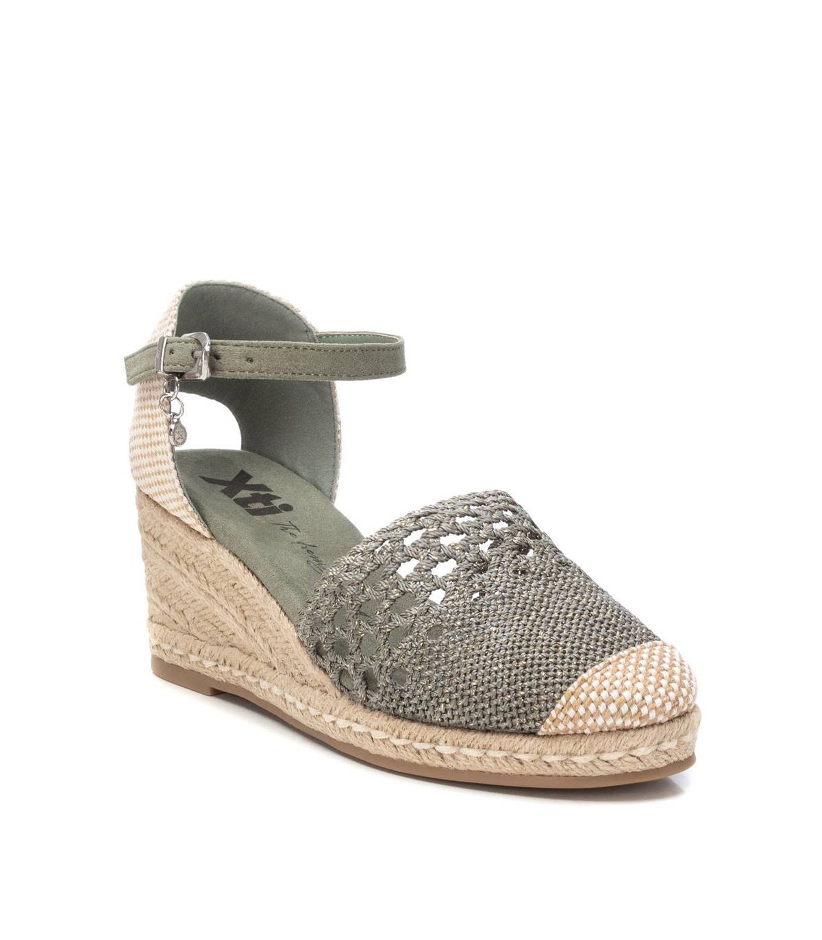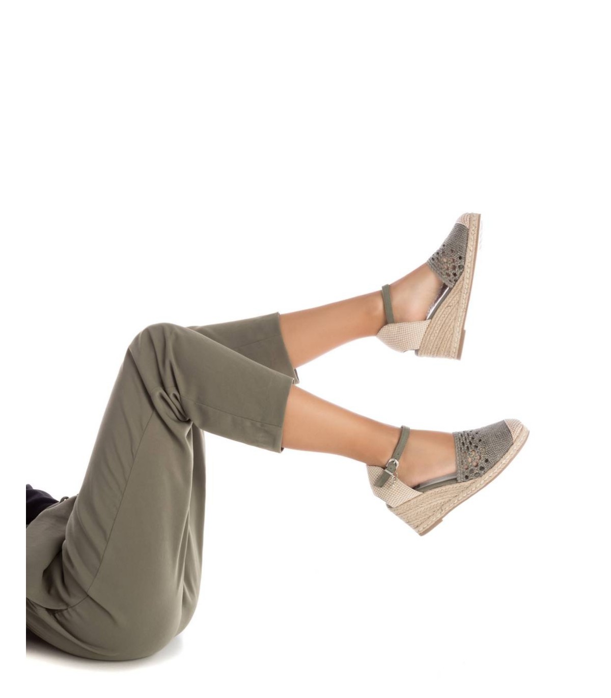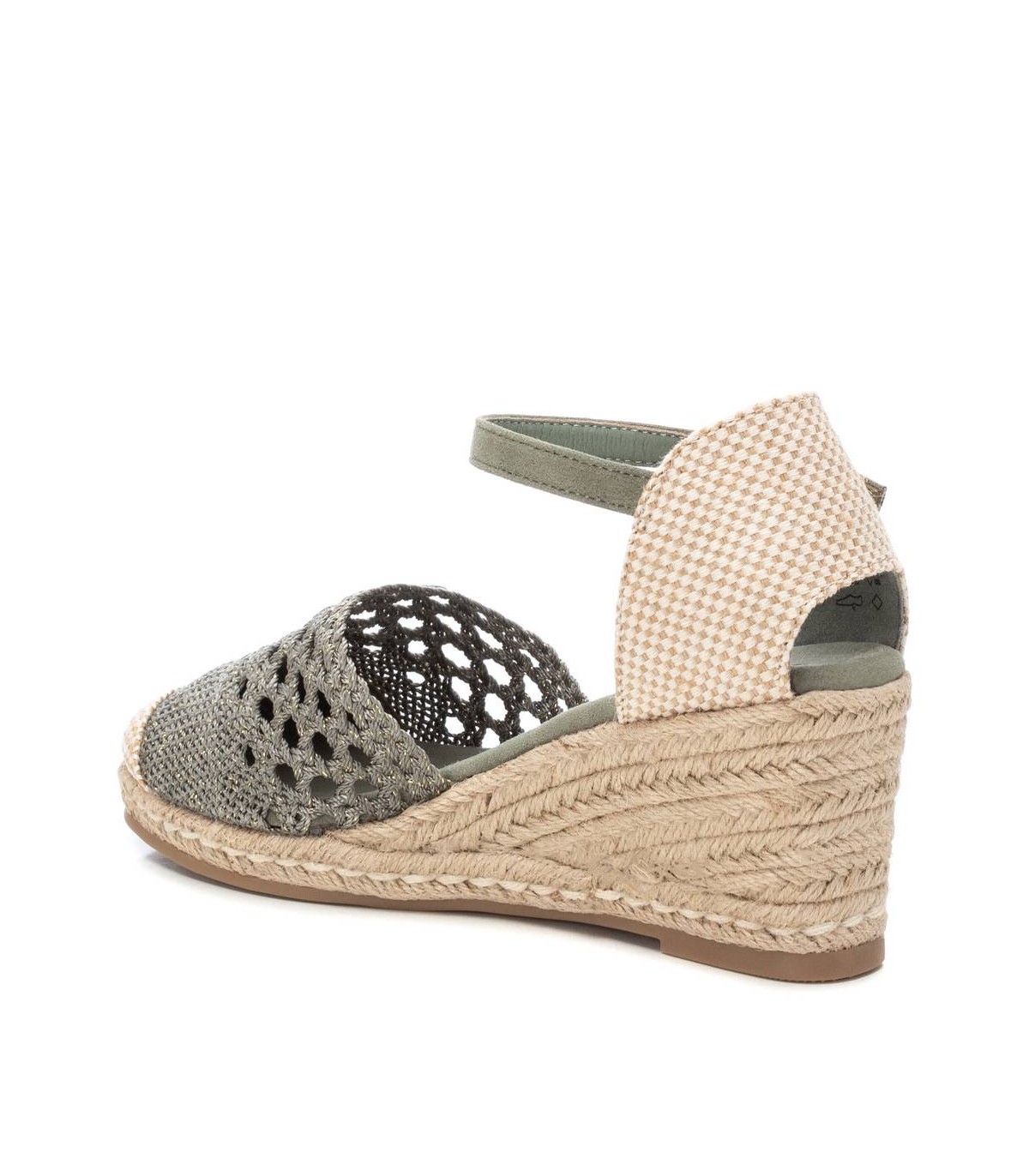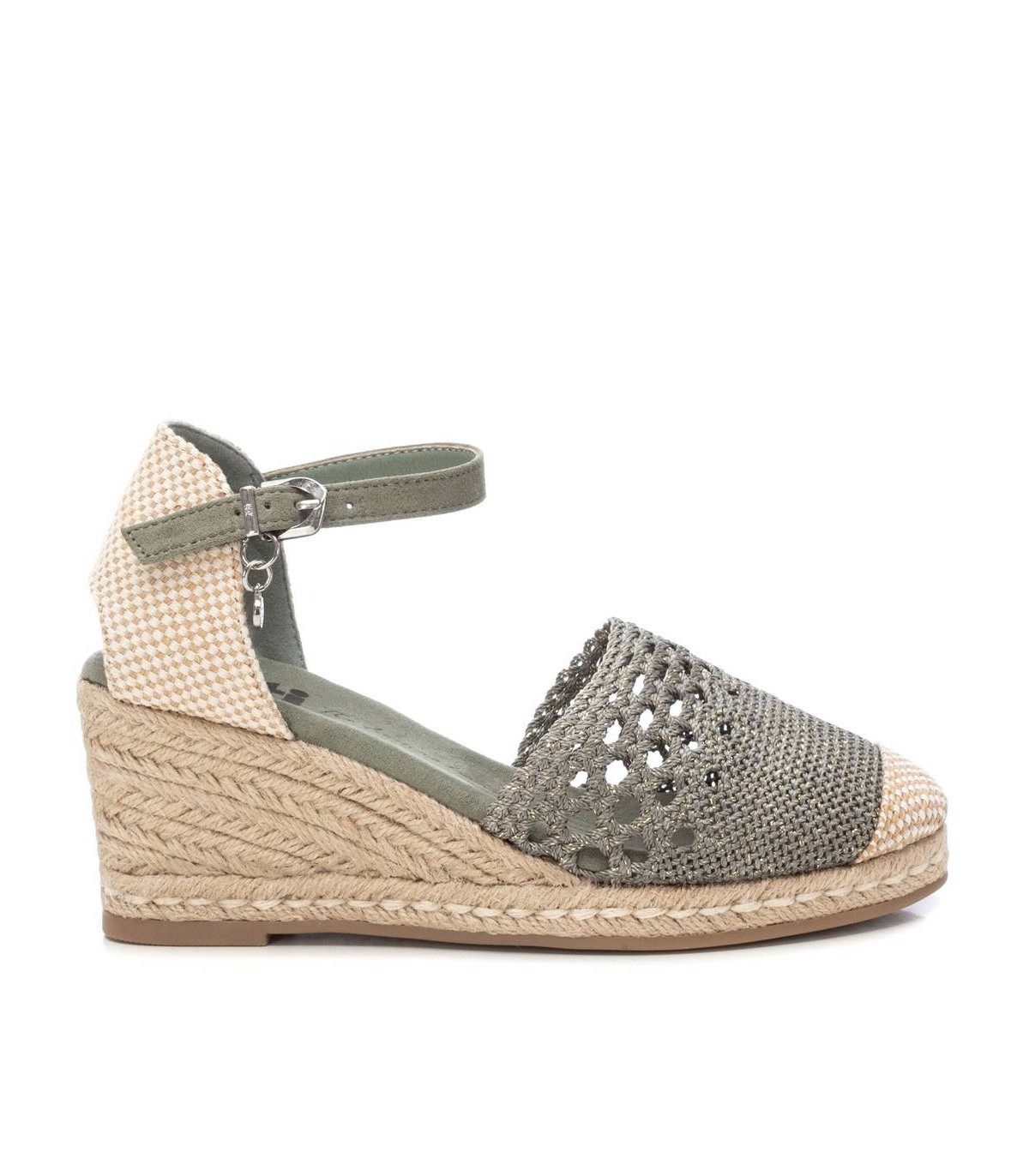 Zapato de mujer con cuña, tipo valenciana, de la marca Xti. Fabricado en tejido de ganchillo, este modelo te acompañará en todos tus looks del verano. Pulsera al tobillo con cierre de hebilla. Cuña de 6 cm forrada en yute y suela de goma antideslizante. Este modelo ha obtenido el certificado vegano por la organización mundial PETA (Organización de los derechos de los animales).