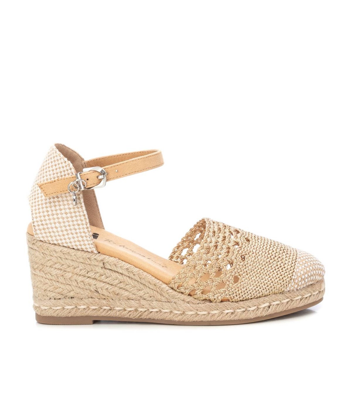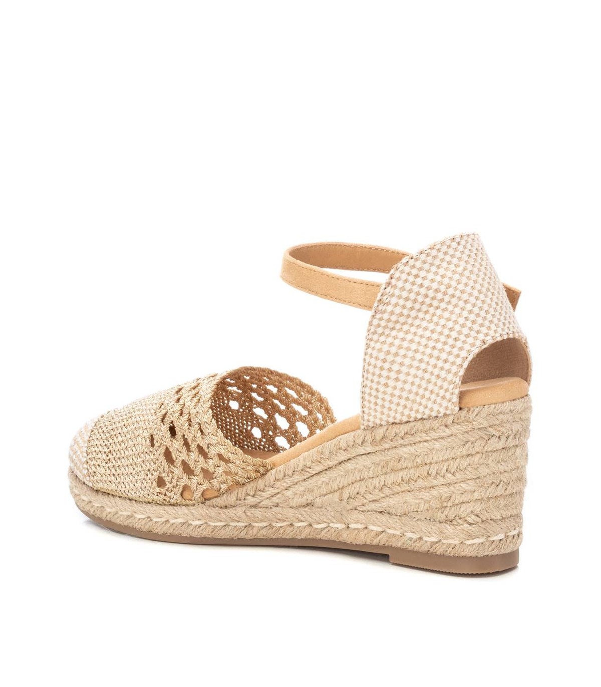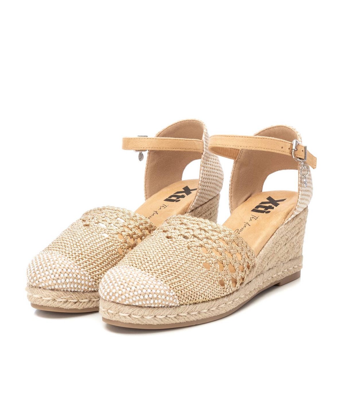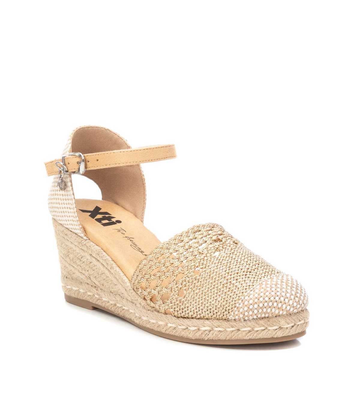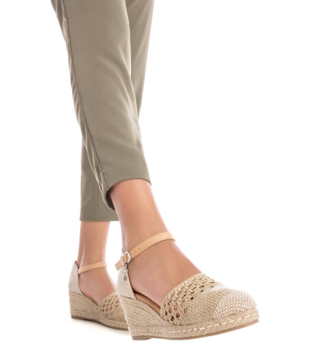 Zapato de mujer con cuña, tipo valenciana, de la marca Xti. Fabricado en tejido de ganchillo, este modelo te acompañará en todos tus looks del verano. Pulsera al tobillo con cierre de hebilla. Cuña de 6 cm forrada en yute y suela de goma antideslizante. Este modelo ha obtenido el certificado vegano por la organización mundial PETA (Organización de los derechos de los animales).