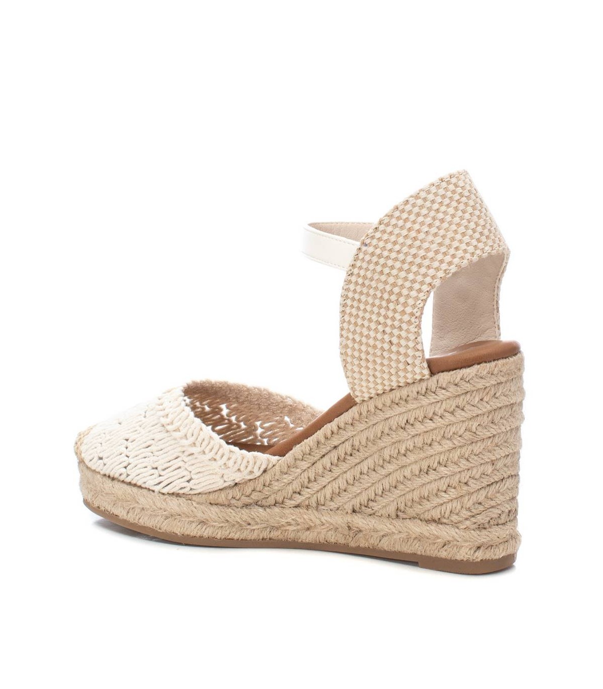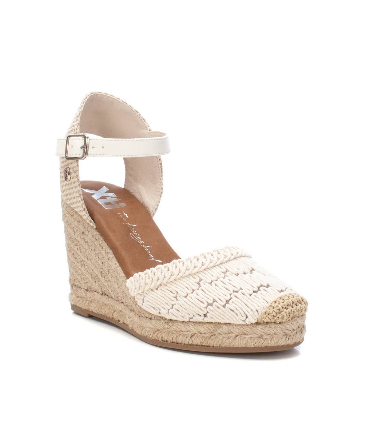 Alpargata de mujer tipo valenciana, de la marca Xti. Fabricado en un precioso motivo de crochet calado, combinado con una trasera de textil para mayor comodidad, será el protagonista de todos tus looks. Cuña de 8 cm de yute con suela de goma antideslizante. Cinta que sujeta al tobillo con hebilla metálica. Este modelo ha obtenido el certificado vegano por la organización mundial PETA (Organización de los derechos de los animales).
