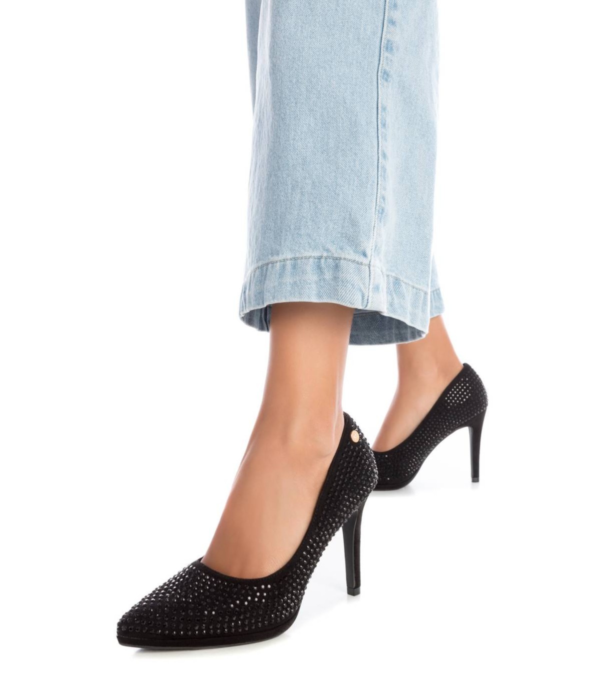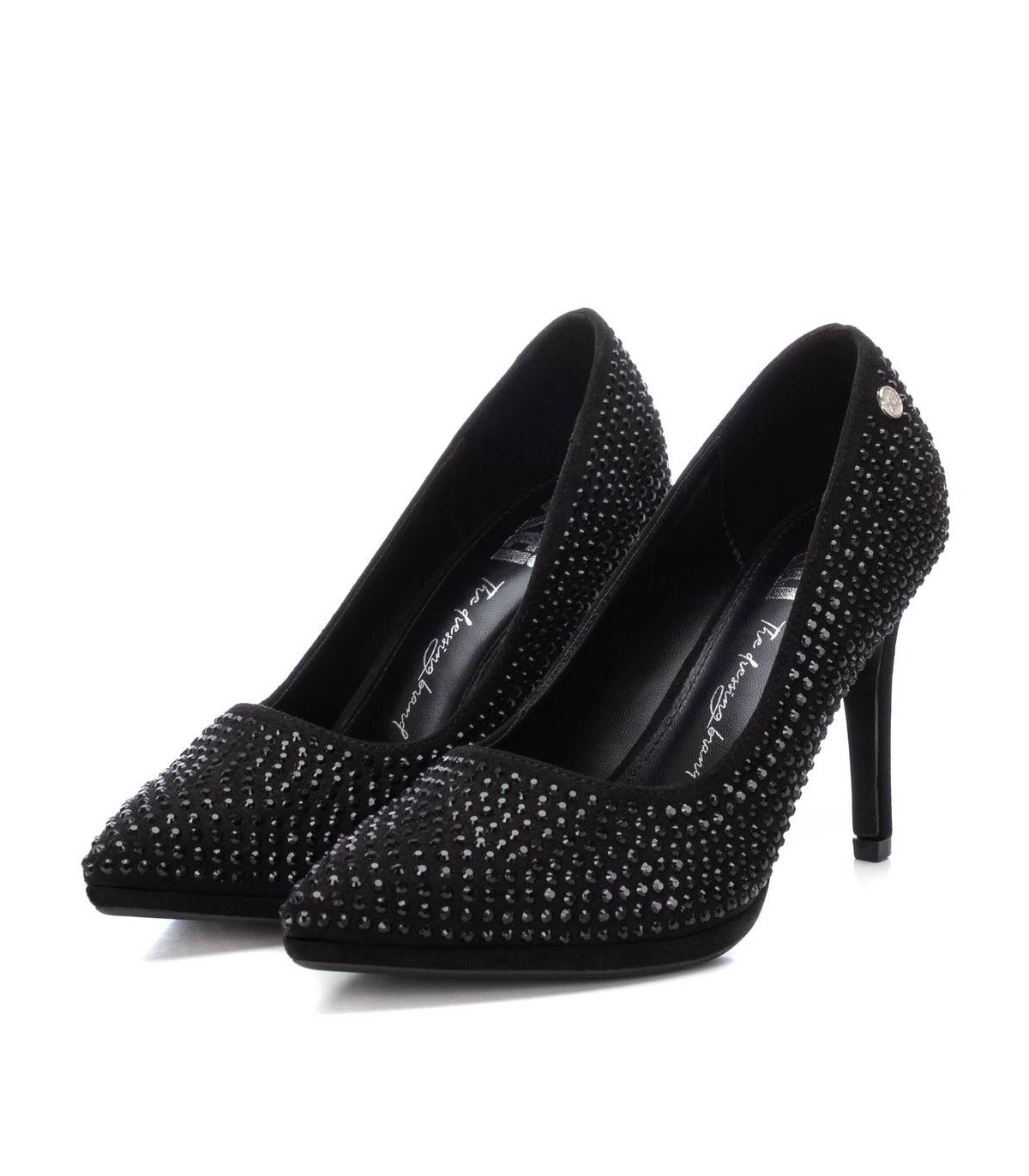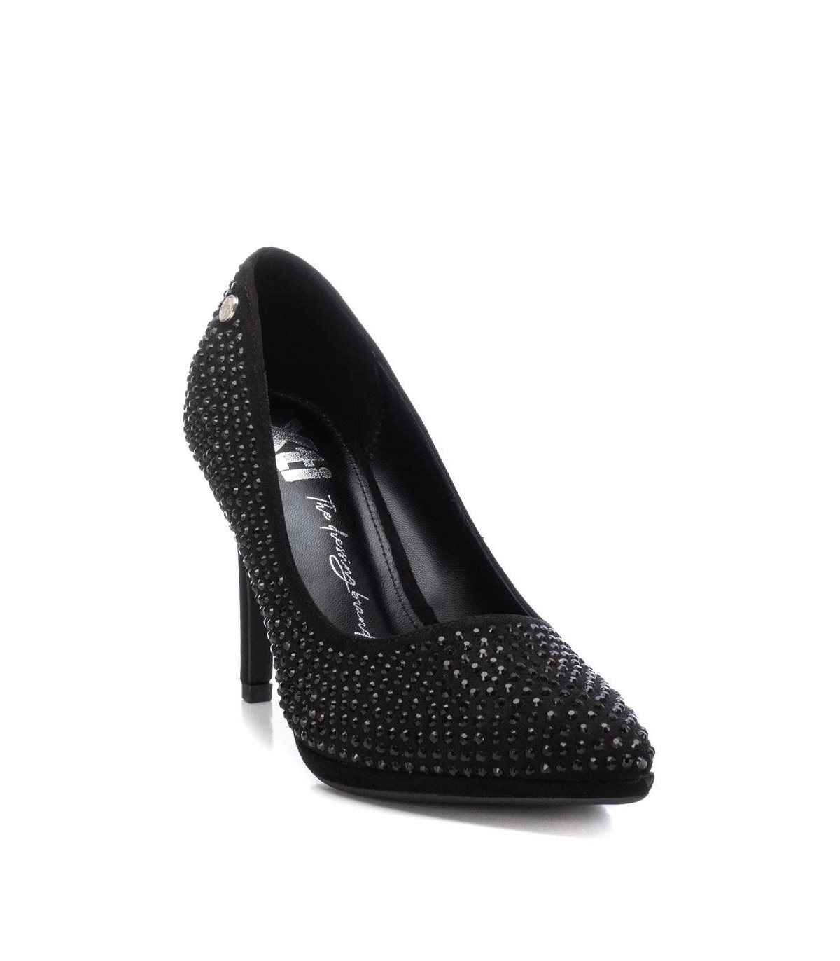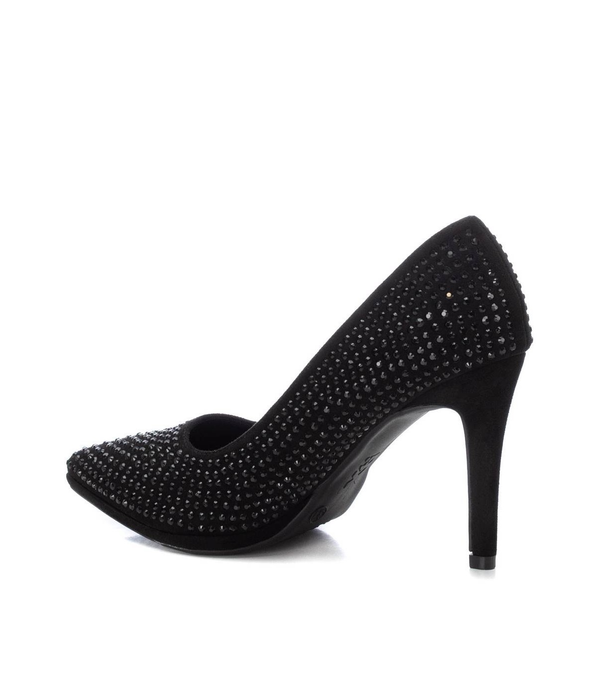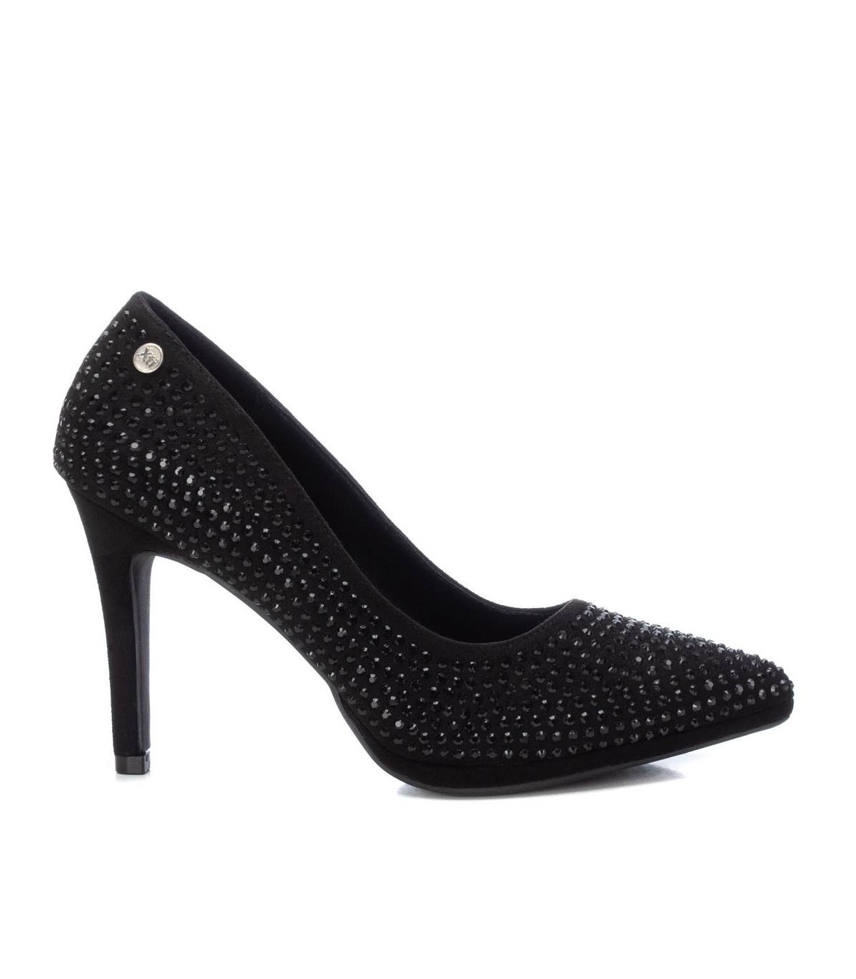 Zapato de salón de mujer, de la marca Xti. Fabricado en textil con detalles de piedras. Punta afilada y tacón fino de 8 cm con suela antideslizante. Un fondo de armario que elevará tus looks. Este modelo ha obtenido el certificado vegano por la organización mundial PETA (Organización de los derechos de los animales).