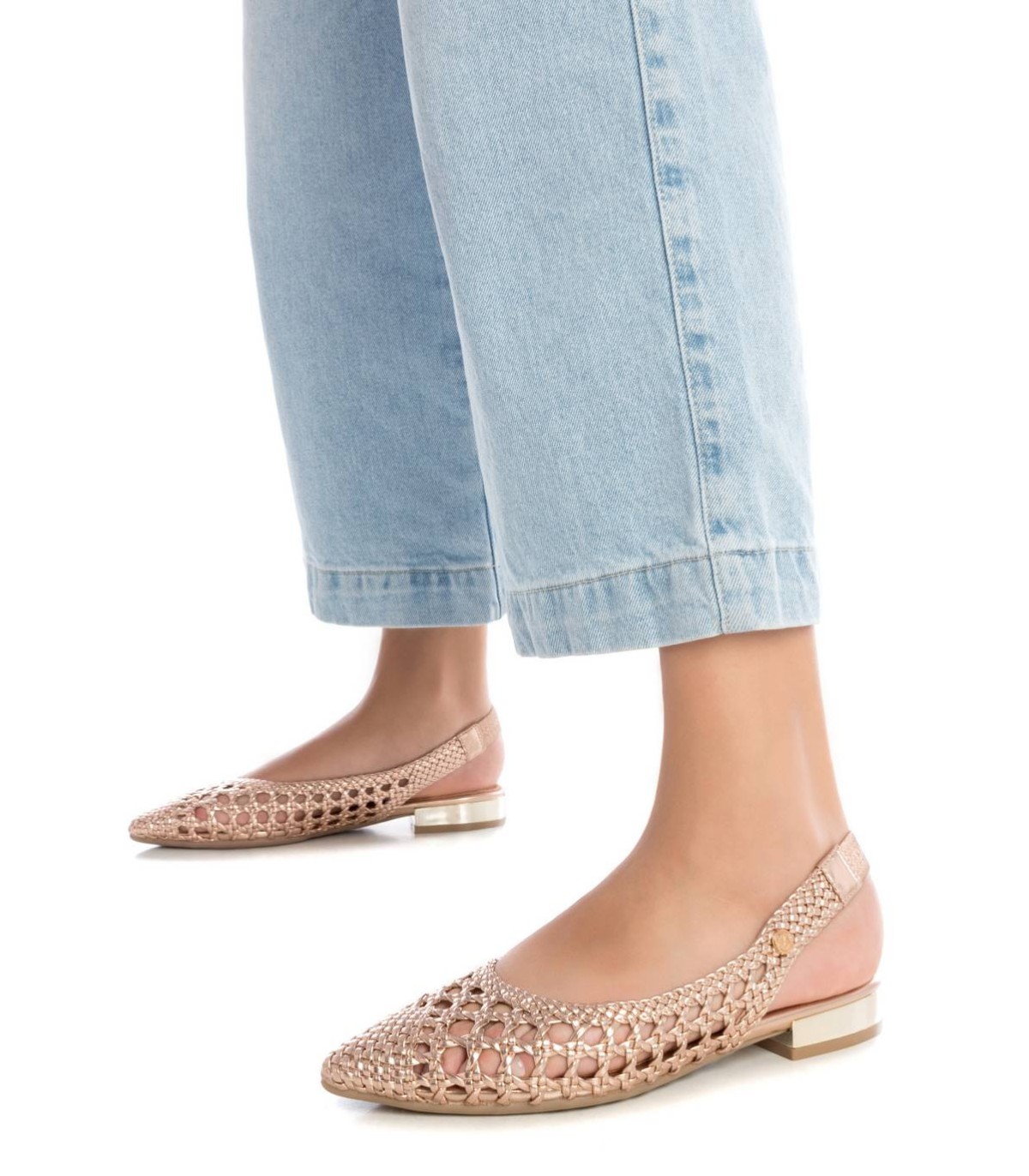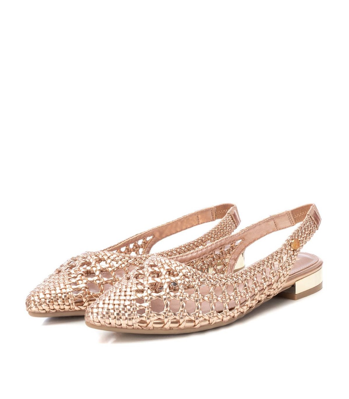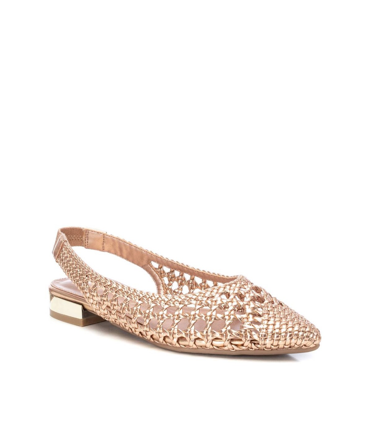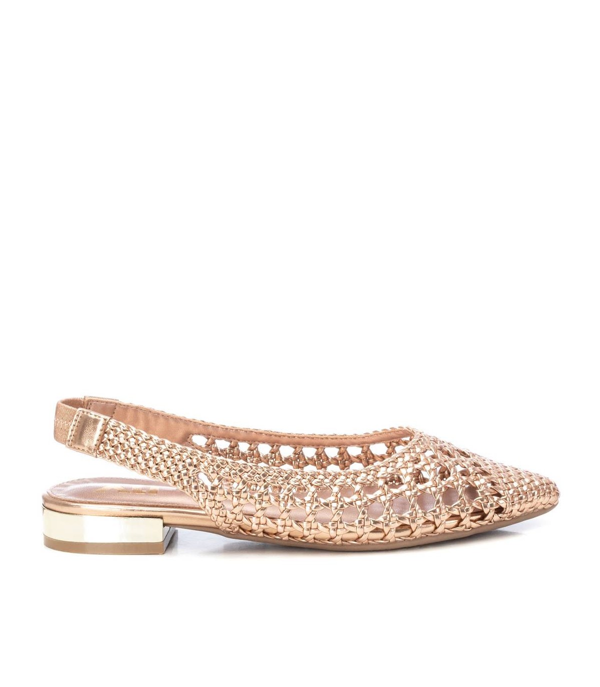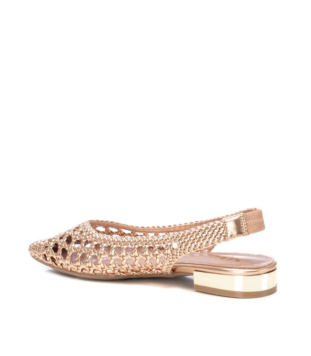 Zapato destalonado de mujer, de la marca Xti. Fabricado en material imitación piel con acabado metalizado. Modelo trenzado con pulsera elastica en el tobillo con muy buena sujeción. Ideal para todos tus conjuntos.Este modelo ha obtenido el certificado vegano por la organización mundial PETA (Organización de los derechos de los animales).