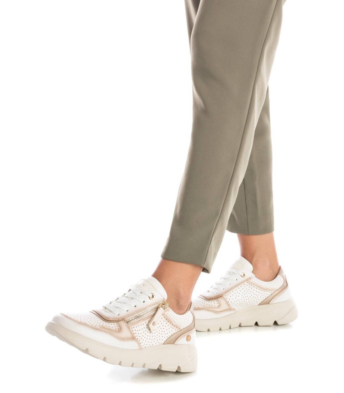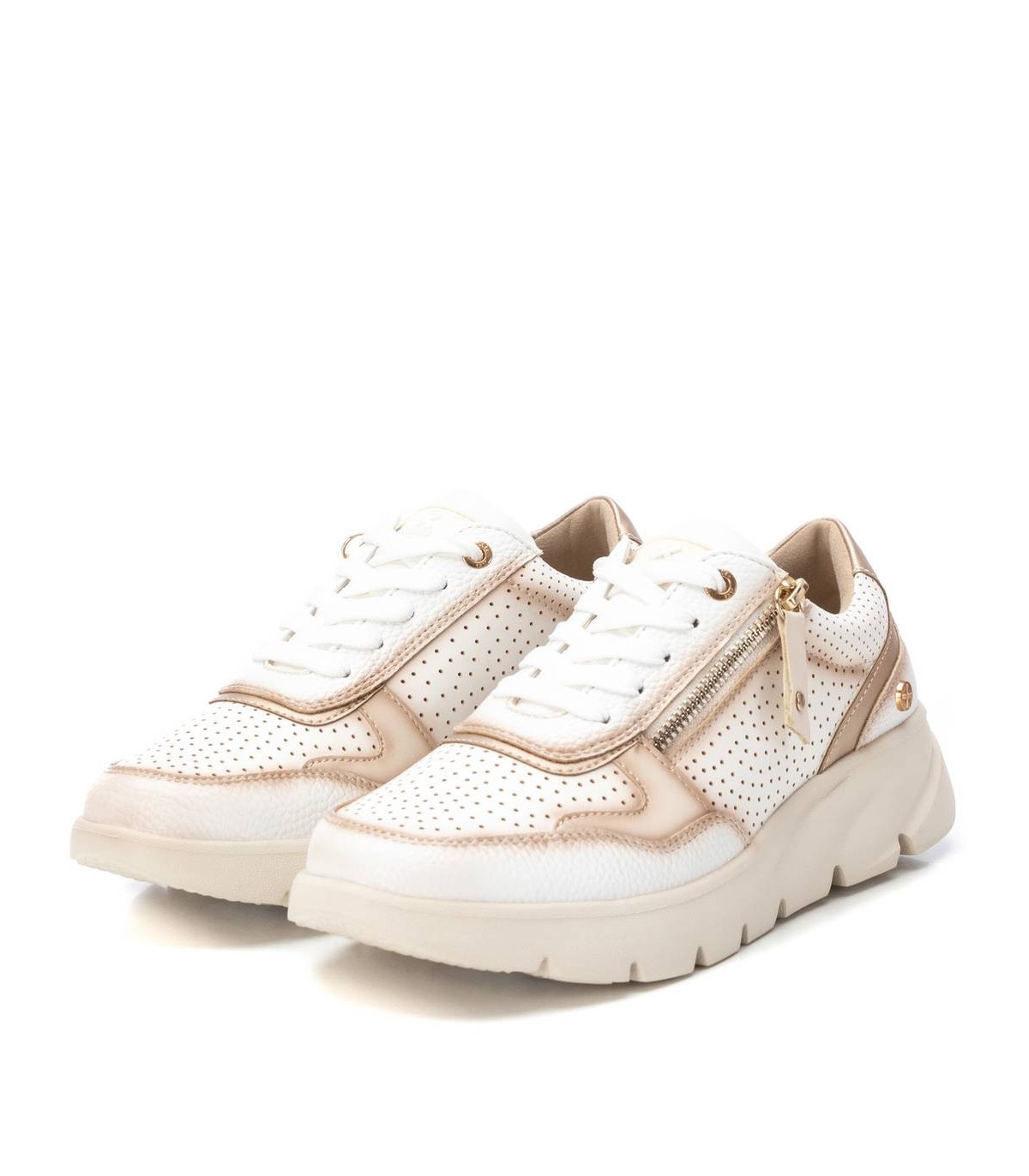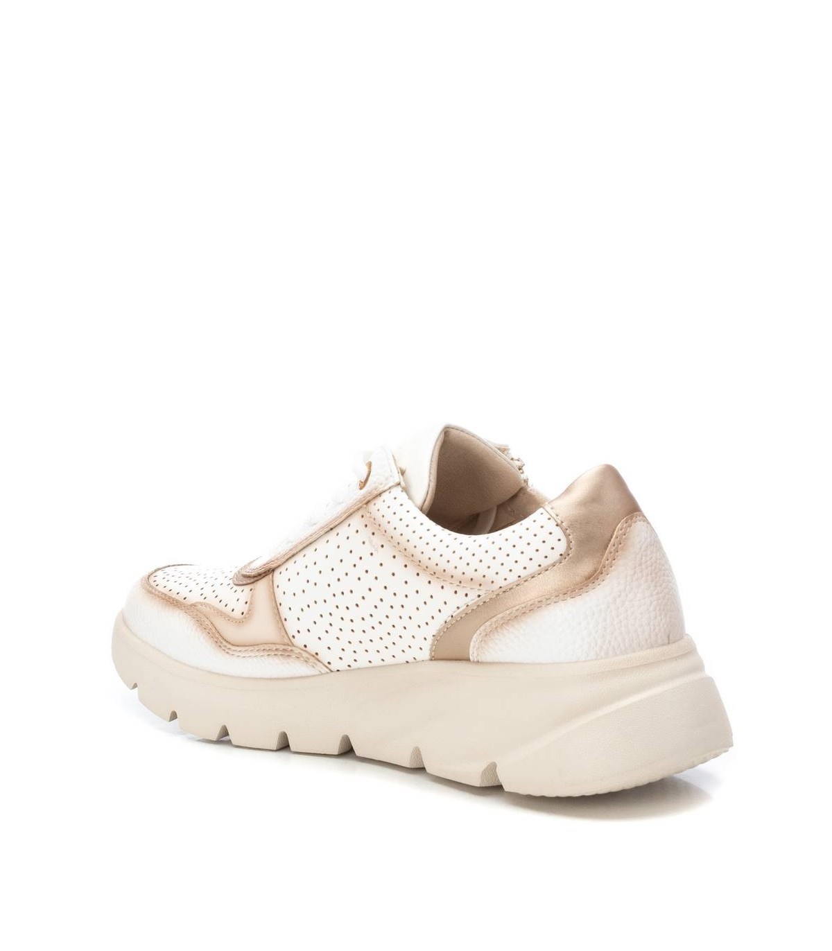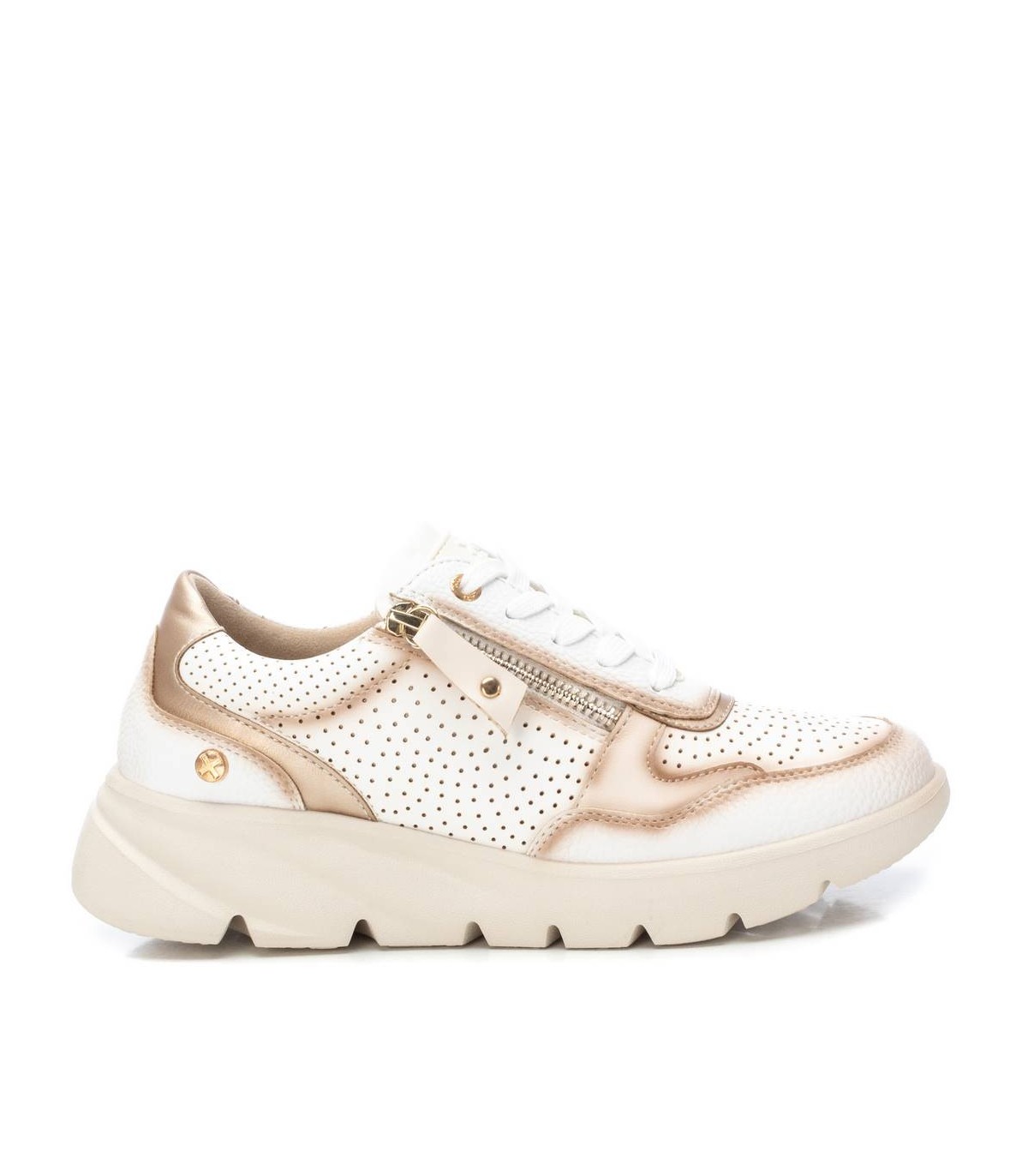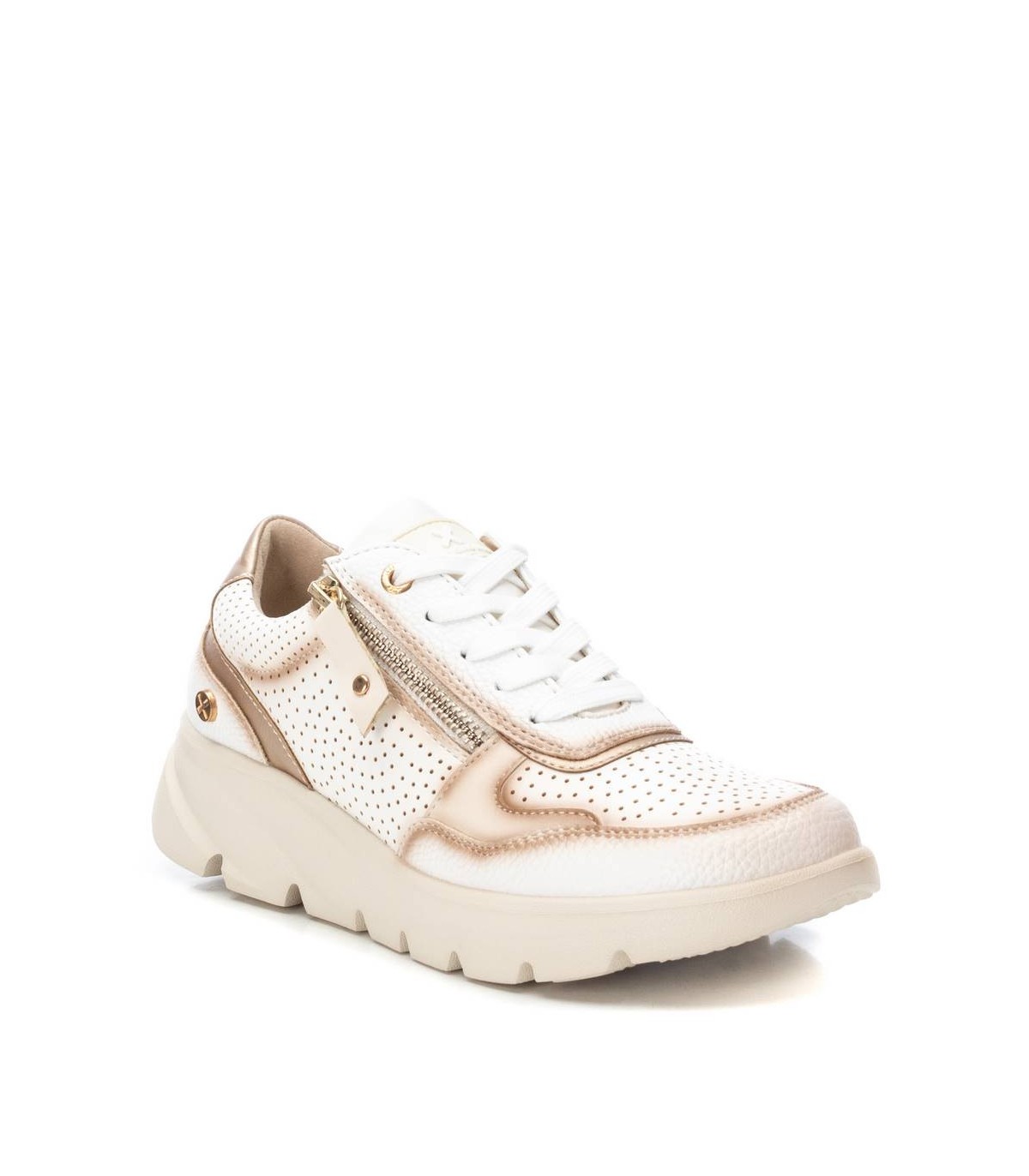 Zapatilla de mujer, de la marca Xti. Fabricada en material que imita la piel con detalle de troquelado decorativo. Cierre mediante cordones ajustables y cremallera lateral para aportar falicidad en el calce. Suela de goma antideslizante. Ideal para aportar unos cm con total confort. Este modelo ha obtenido el certificado vegano por la organización mundial PETA (Organización de los derechos de los animales).