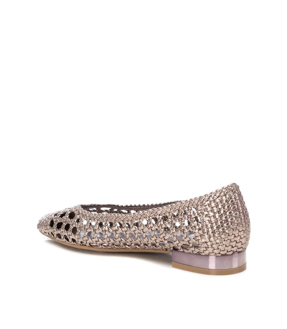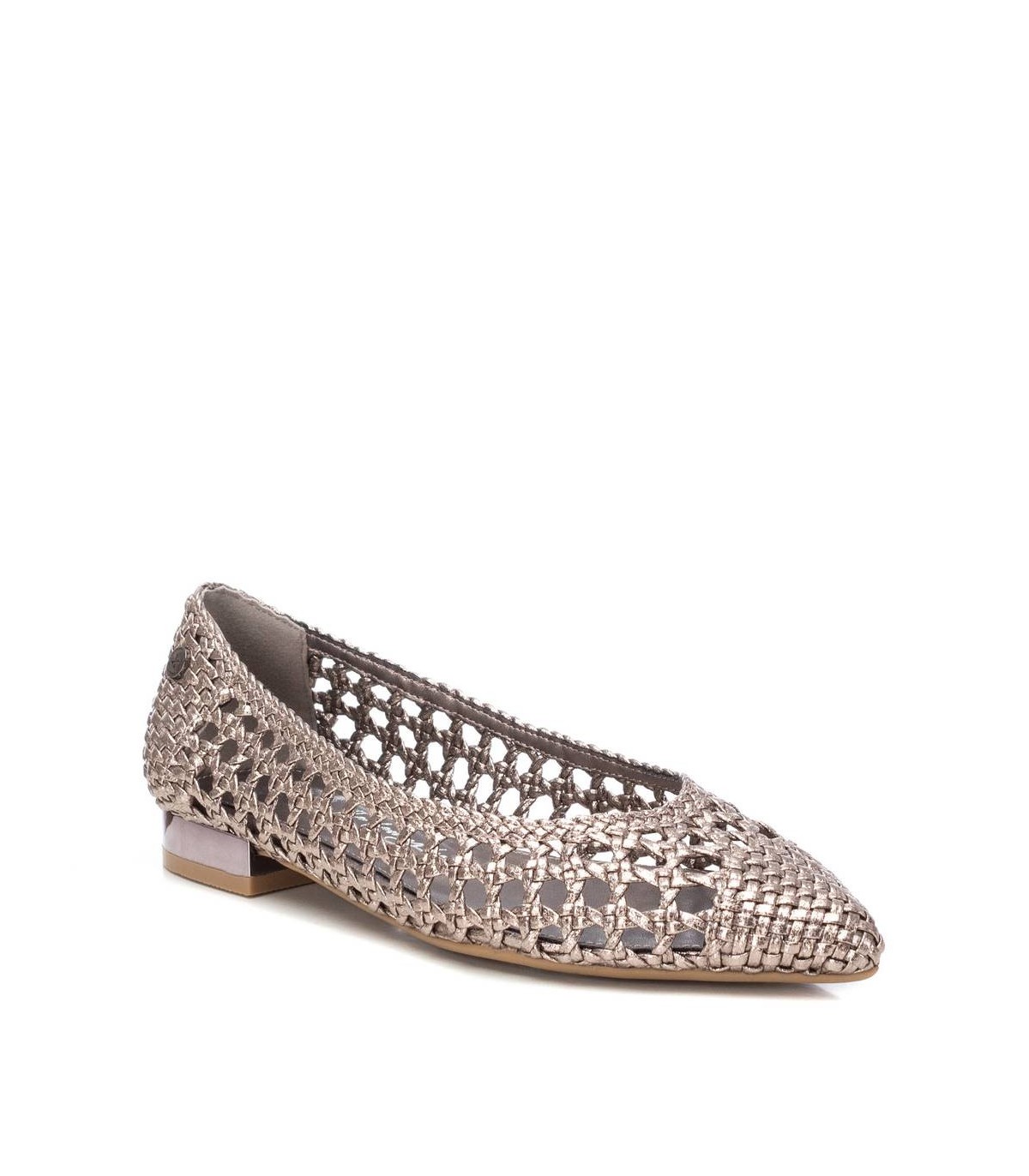 Zapato de mujer, de la marca Xti. Fabricado en material trenzado que imita la piel con acabado metalizado. Con tacón metalizado, ideal para complementar tus looks. Este modelo ha obtenido el certificado vegano por la organización mundial PETA (Organización de los derechos de los animales).