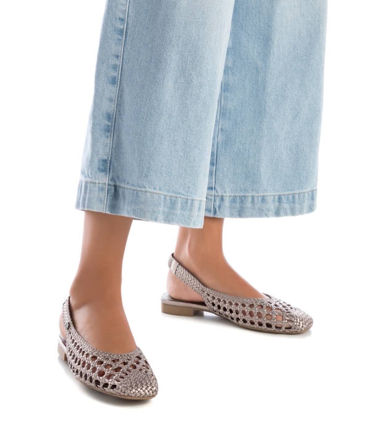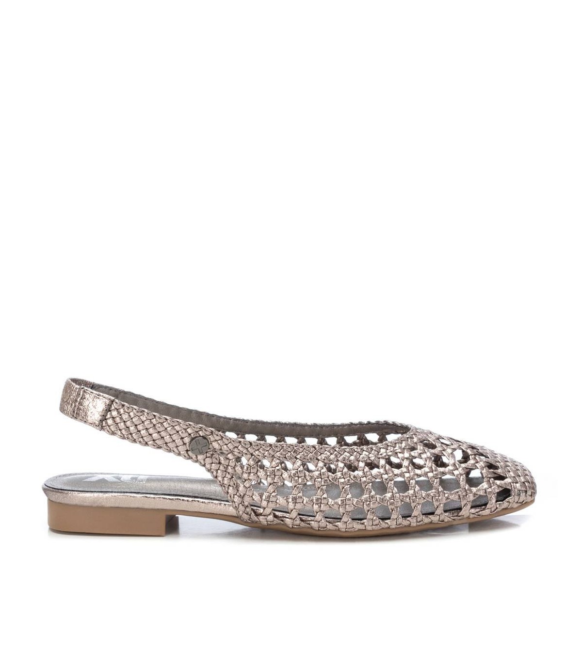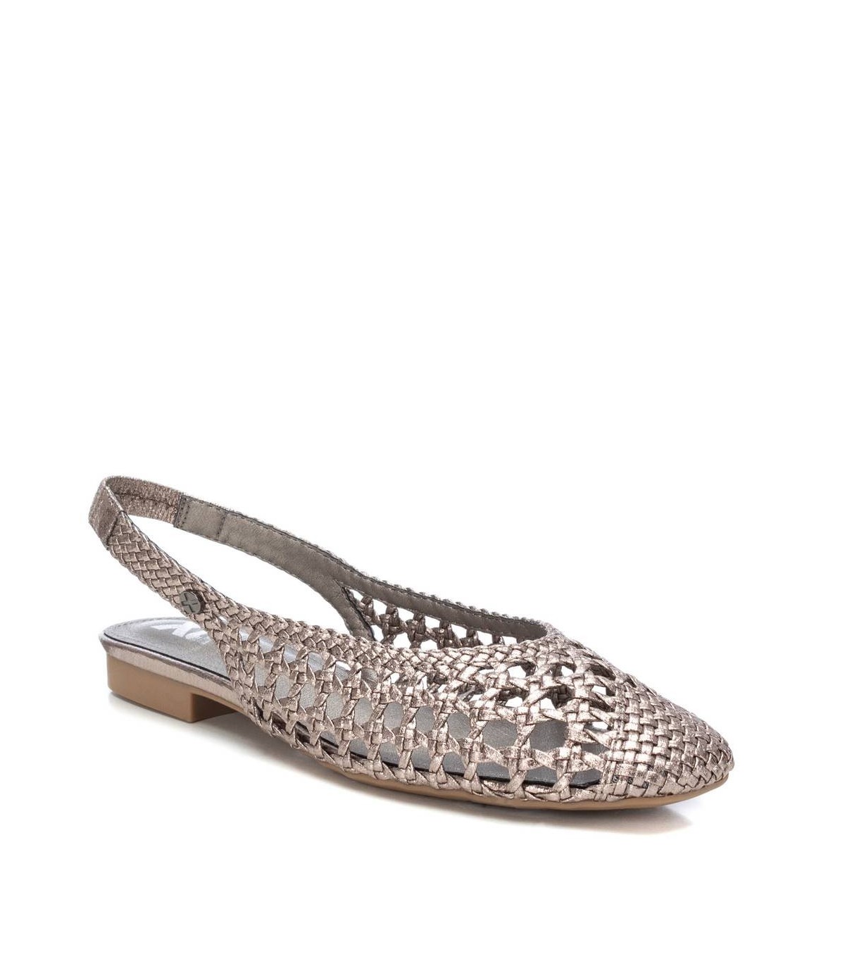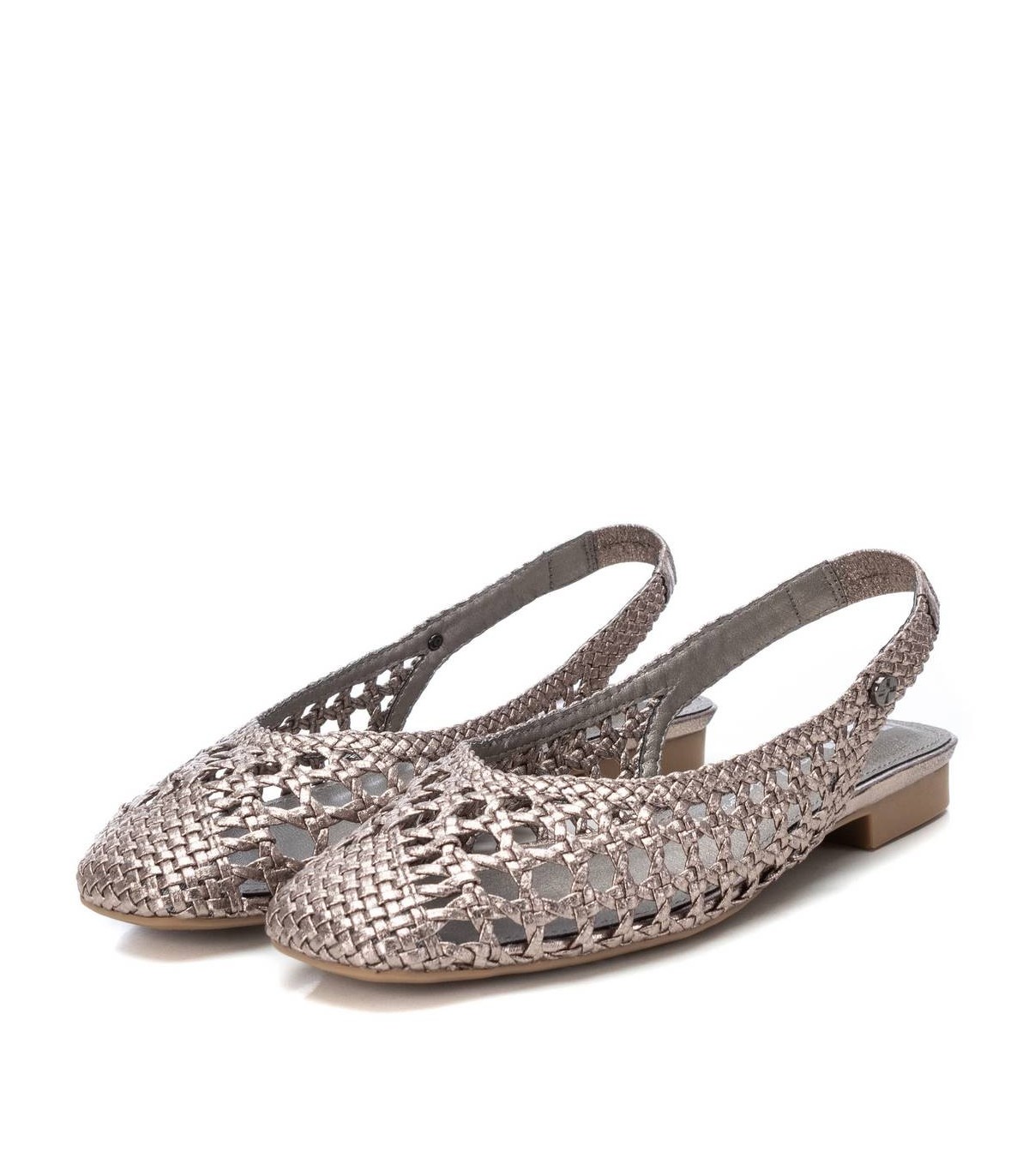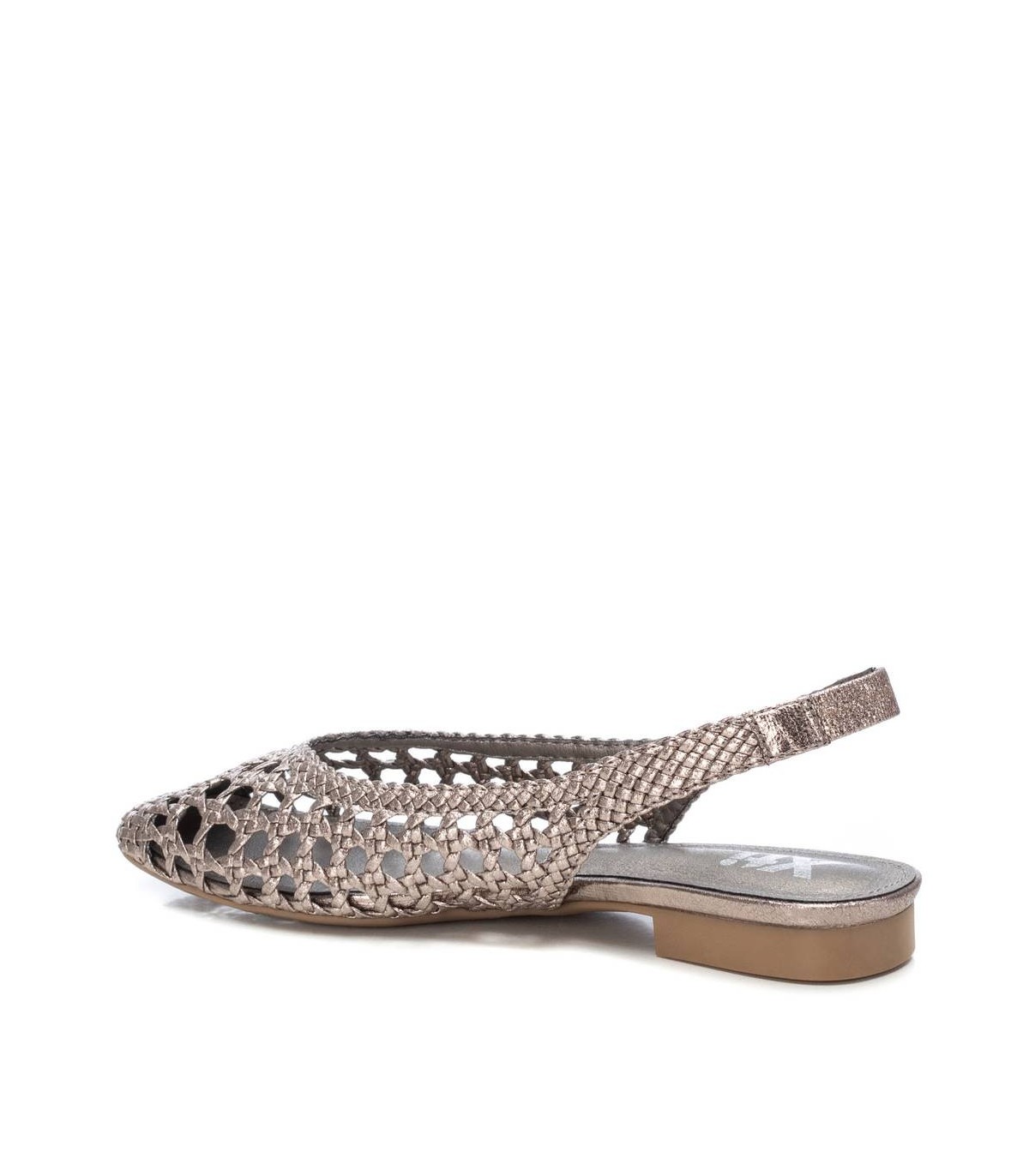 Zapato destalonado de mujer de la marca Xti. Fabricada en material trenzado que imita la piel con acabado metalizado. Pulsera con elástico para facilitar su puesta. Suela de goma antideslizante. Estos zapatos serán el centro de tus mejores looks. Este modelo ha obtenido el certificado vegano por la organización mundial PETA (Organización de los derechos de los animales).